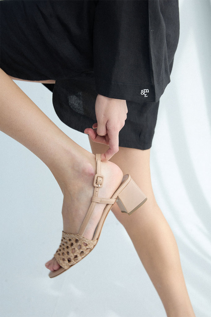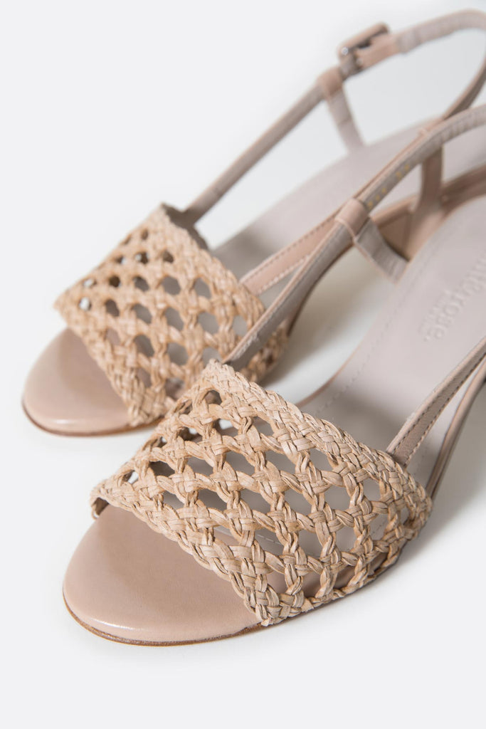 Diseño delantero trenzado, del que parten dos tiras de piel que bordean el pie y lo estilizan, ajustandose al talón con un broche de hebilla. Puntera redondeada y tacón en bloque de 5,5 cm.