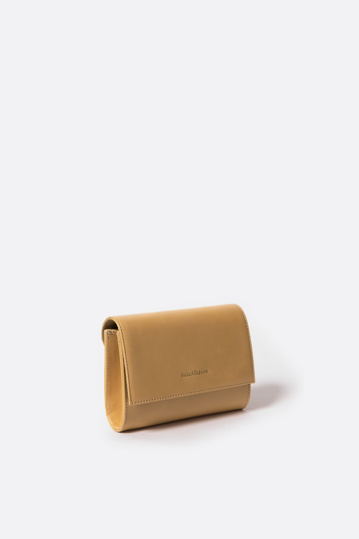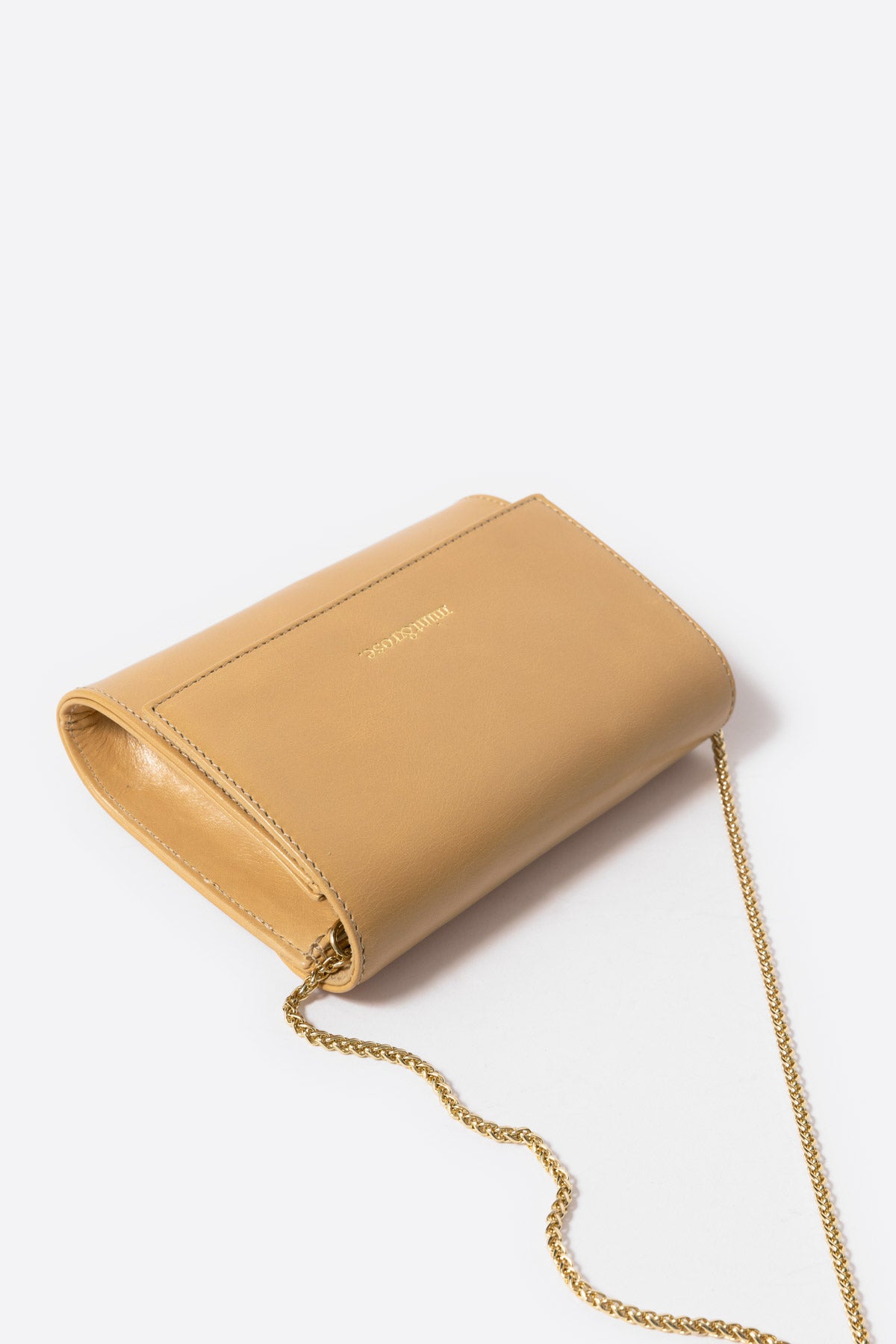 Bolso pequeño con solapa. Tiene cierre redondo de imán y forro de textil interior con bolsillo abierto. Cuenta con una cadena de altura 60cm para colar en el hombro.