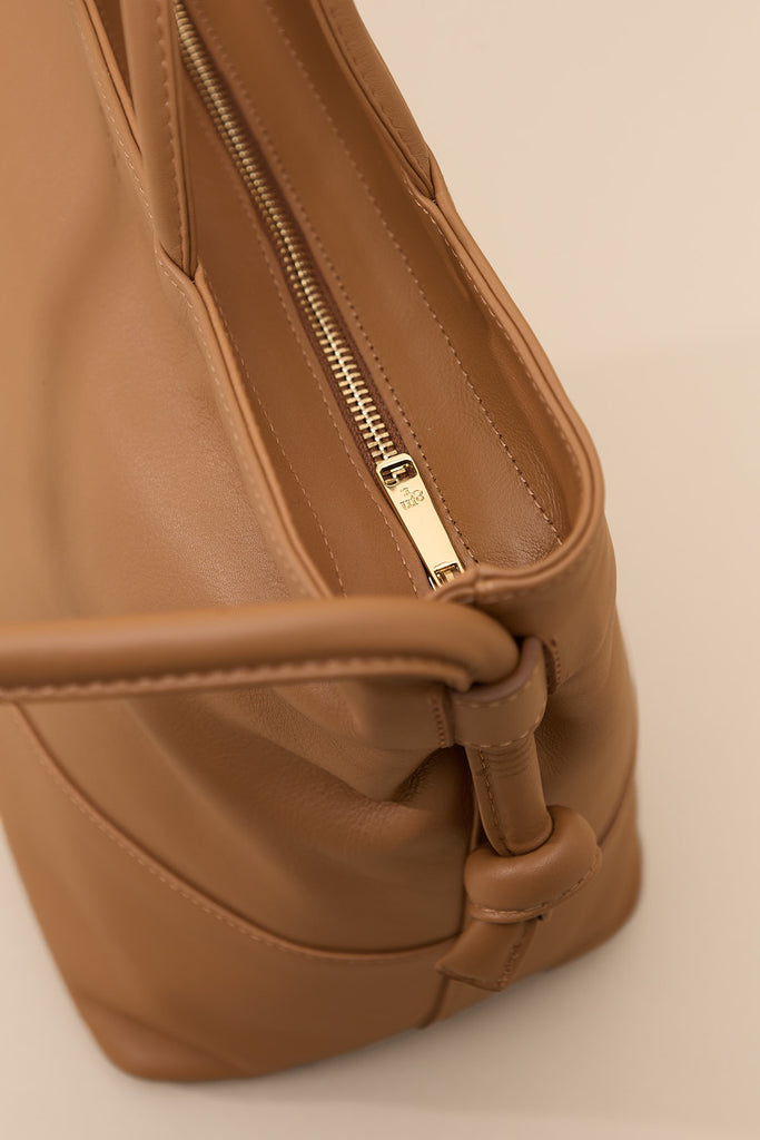 En este bolso de doble asa y silueta minimalista, menos es más. Todos sus detalles ayudan a crear ese aire de sutileza: Costuras decorativas, lujados al tono, asa larga ajustable con enganche en nudo, asa corta de mano y cierre en cremallera dorada. El interior es de lino, tiene un bolsillo y bandeja inferior para que no pierda su forma. Medidas 24 cm x 17 cm x 28 cm.
