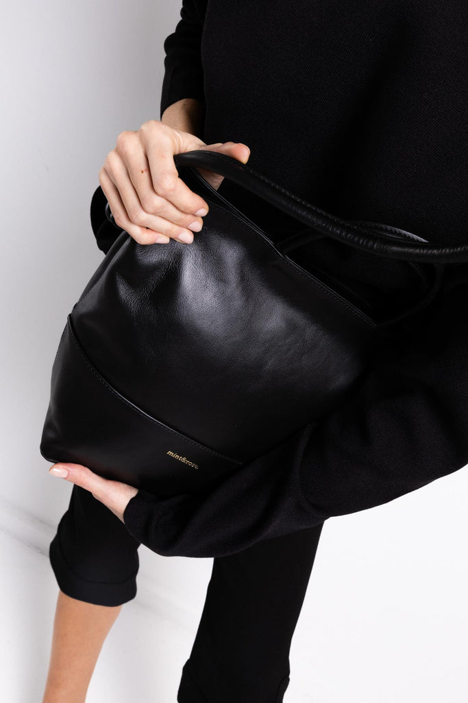 En este bolso de doble asa y silueta minimalista, menos es más. Todos sus detalles ayudan a crear ese aire de sutileza: Costuras decorativas, lujados al tono, asa larga ajustable con enganche en nudo, asa corta de mano y cierre en cremallera dorada. El interior es de lino, tiene un bolsillo y bandeja inferior para que no pierda su forma. Medidas 24 cm x 17 cm x 28 cm.