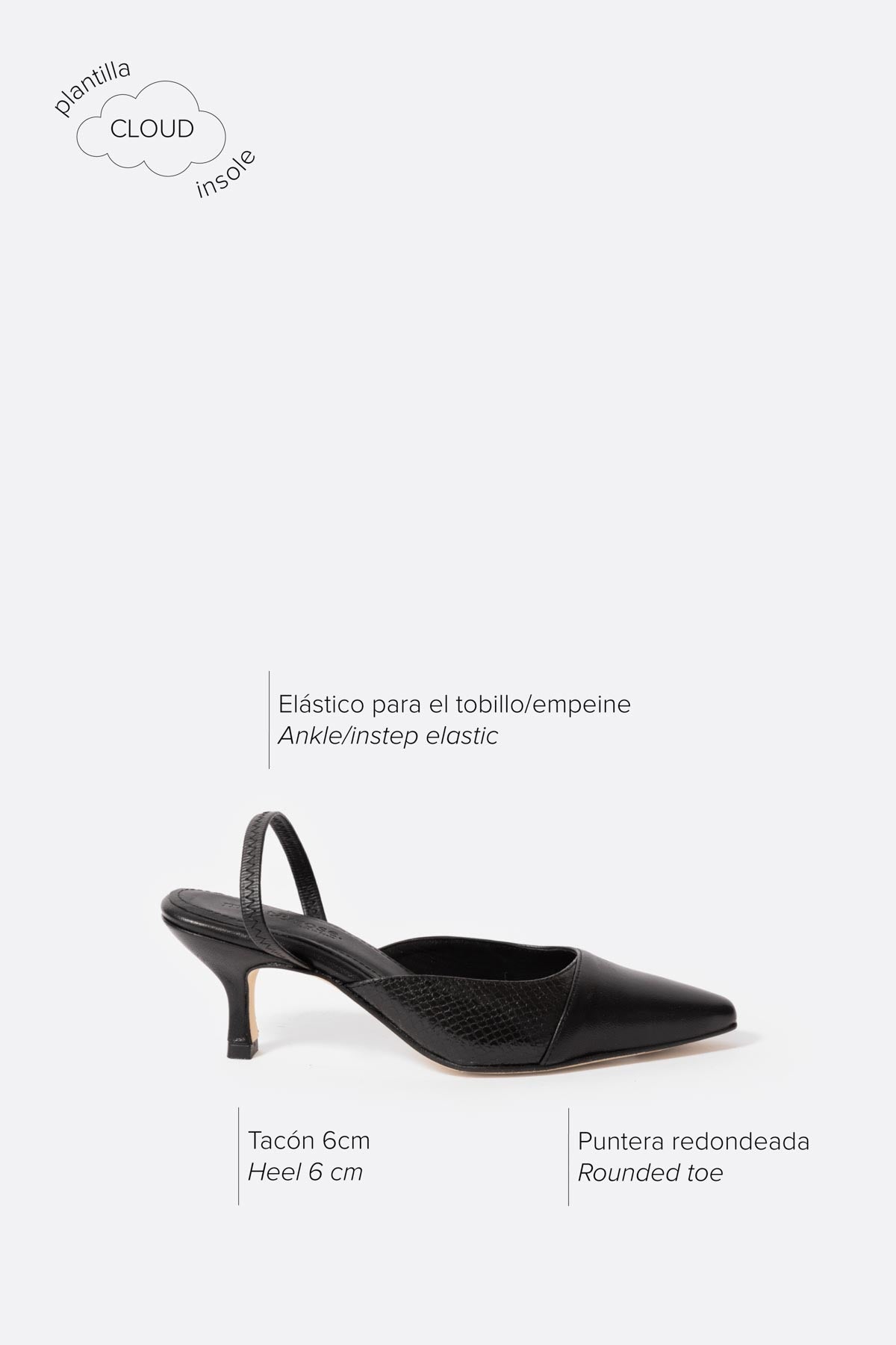 Nima es un salon renovado con puntera afilada pero ligeramente redondeada. Proporciona el toque final perfecto para tus conjuntos de noche o te acompaña en tu día a día en la oficina. Tiene una goma para talon o empeine, plantilla Cloud acolchada y tacón de 6 cm.