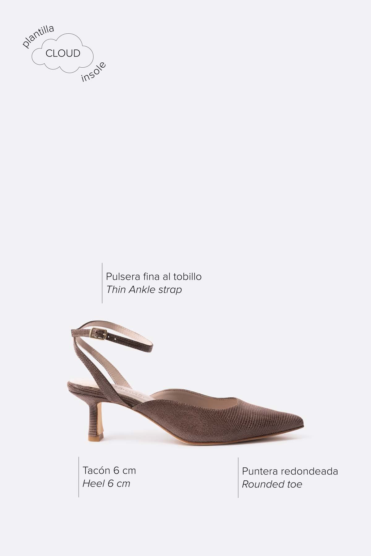Su diseño e identidad atemporal, materiales de primera calidad y proceso de fabricación cuidado, convierten a Vivienne en una inversión para toda la vida. Vivienne es un salón renovado con puntera afilada pero ligeramente redondeada. Proporciona el toque final perfecto para tus conjuntos de noche. Tiene una tira en el talón y una pulsera fina en el tobillo para conseguir un perfecto agarre, plantilla Cloud y tacón de 6 cm.