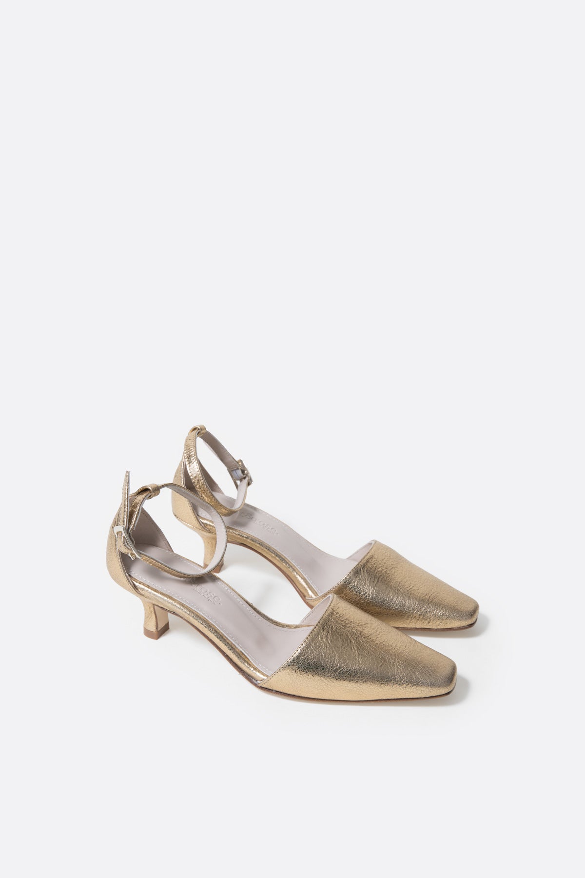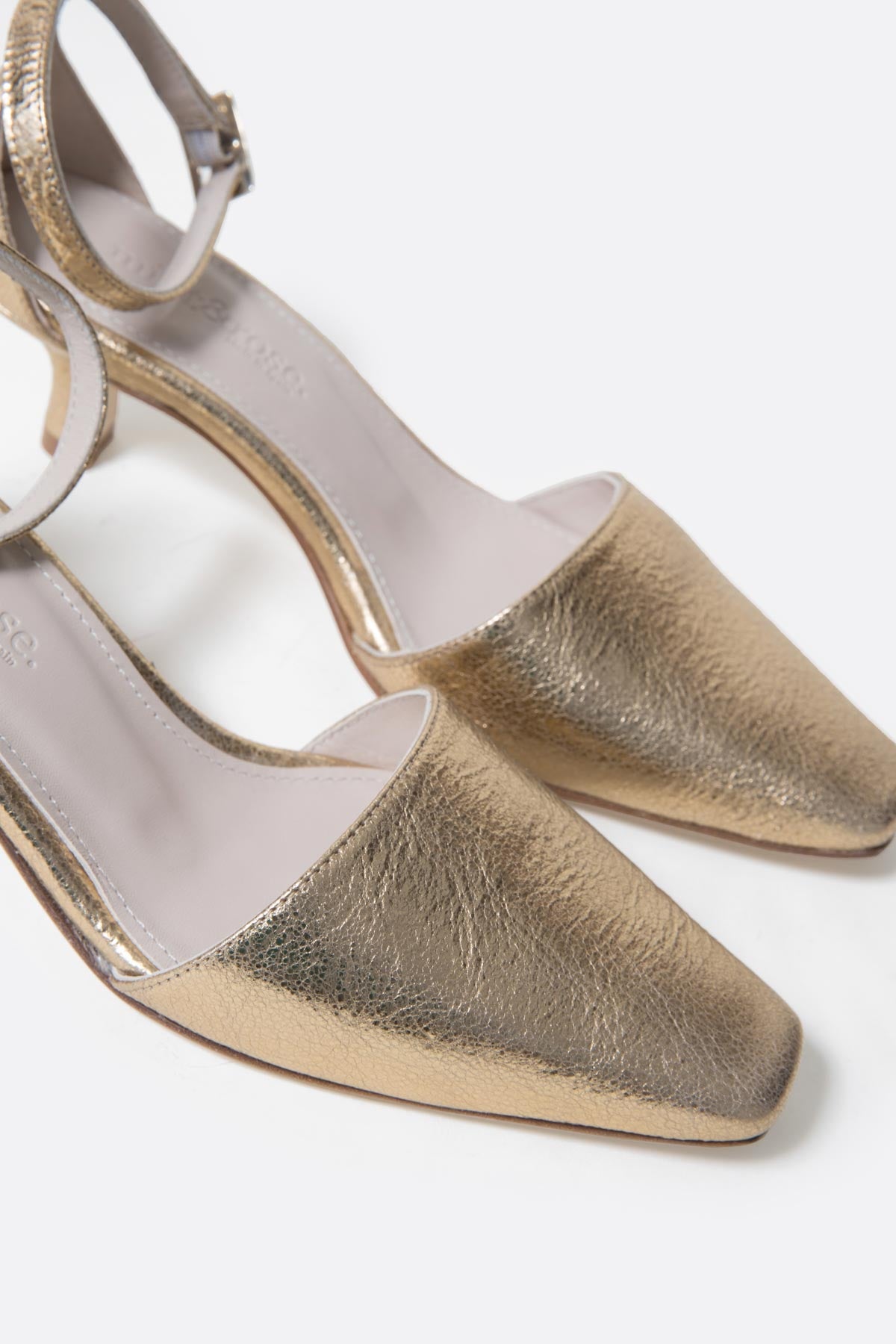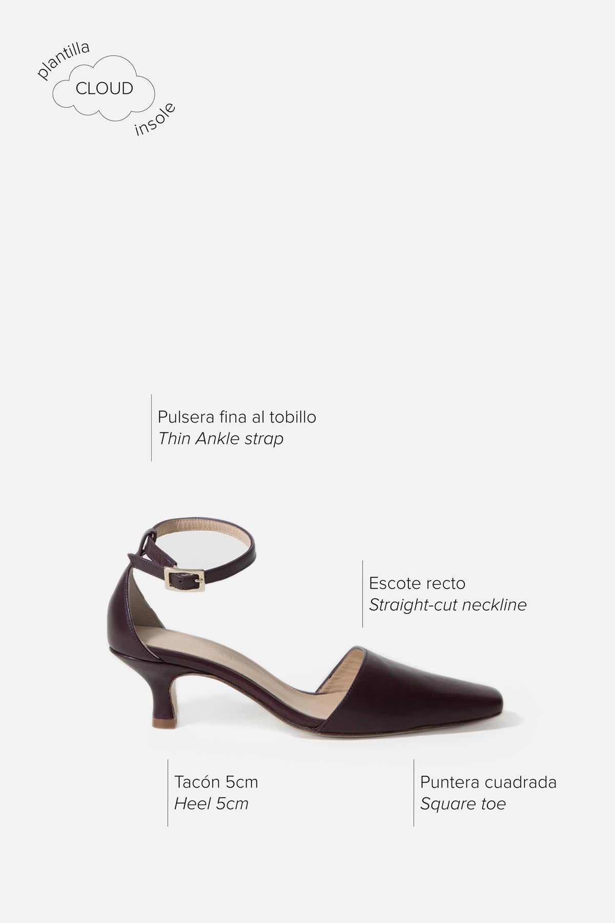 Diseño versátil y atemporal, materiales cuidadosamente seleccionados y fabricación local son la carta de presentación de Inés. Sandalias con una silueta clásica y versátil con un aire muy retro. Tienen una terminación en punta cuadrada y cerrada. Semitalonera con tira para ajustar al tobillo y cierre con hebilla dorada. Plantilla acolchada Cloud y tacón cuadrado medio de 5cm.