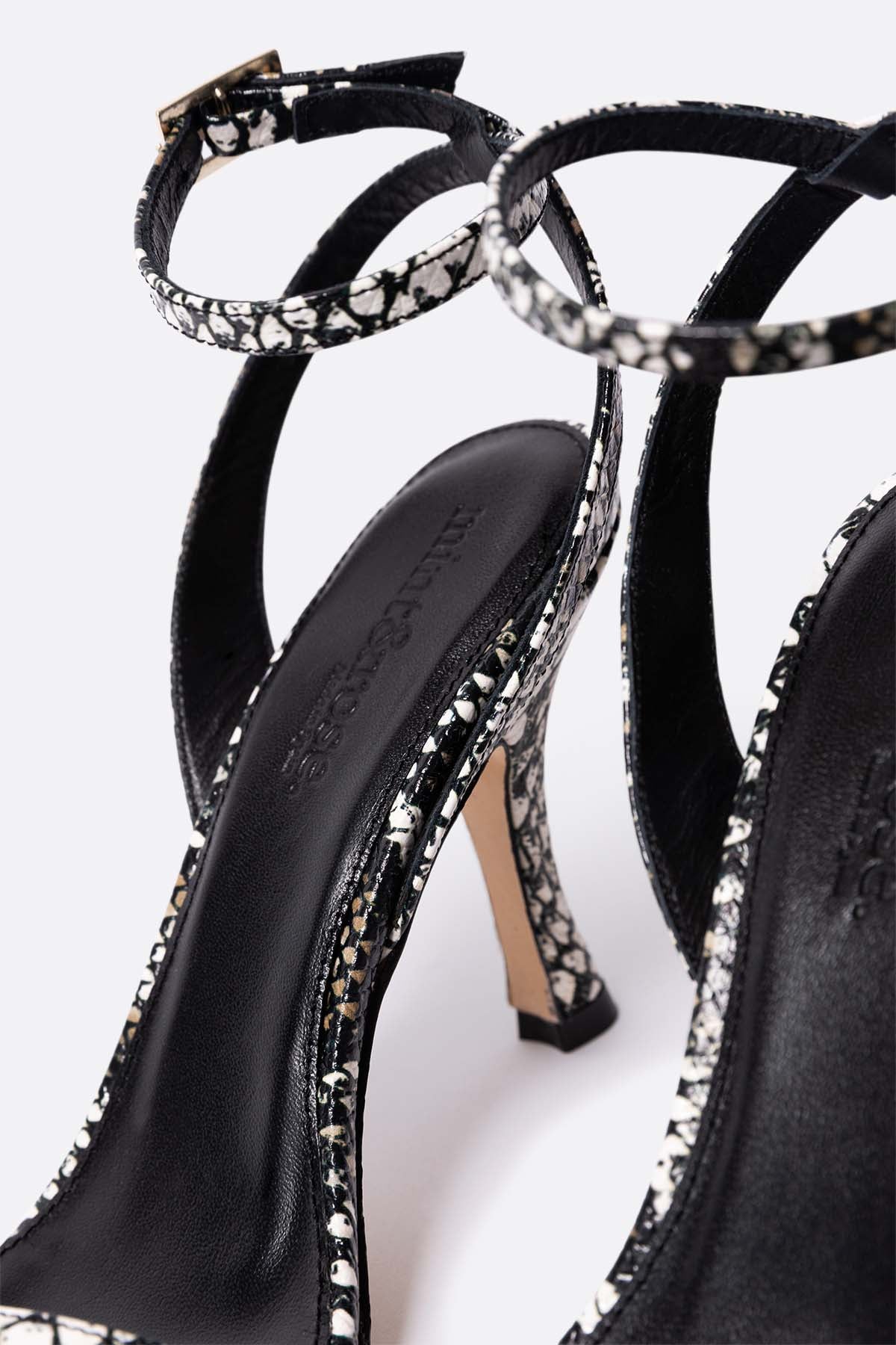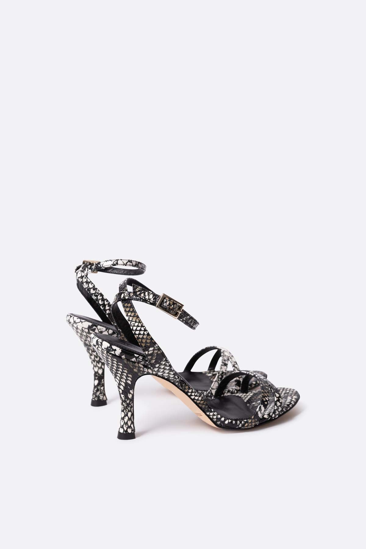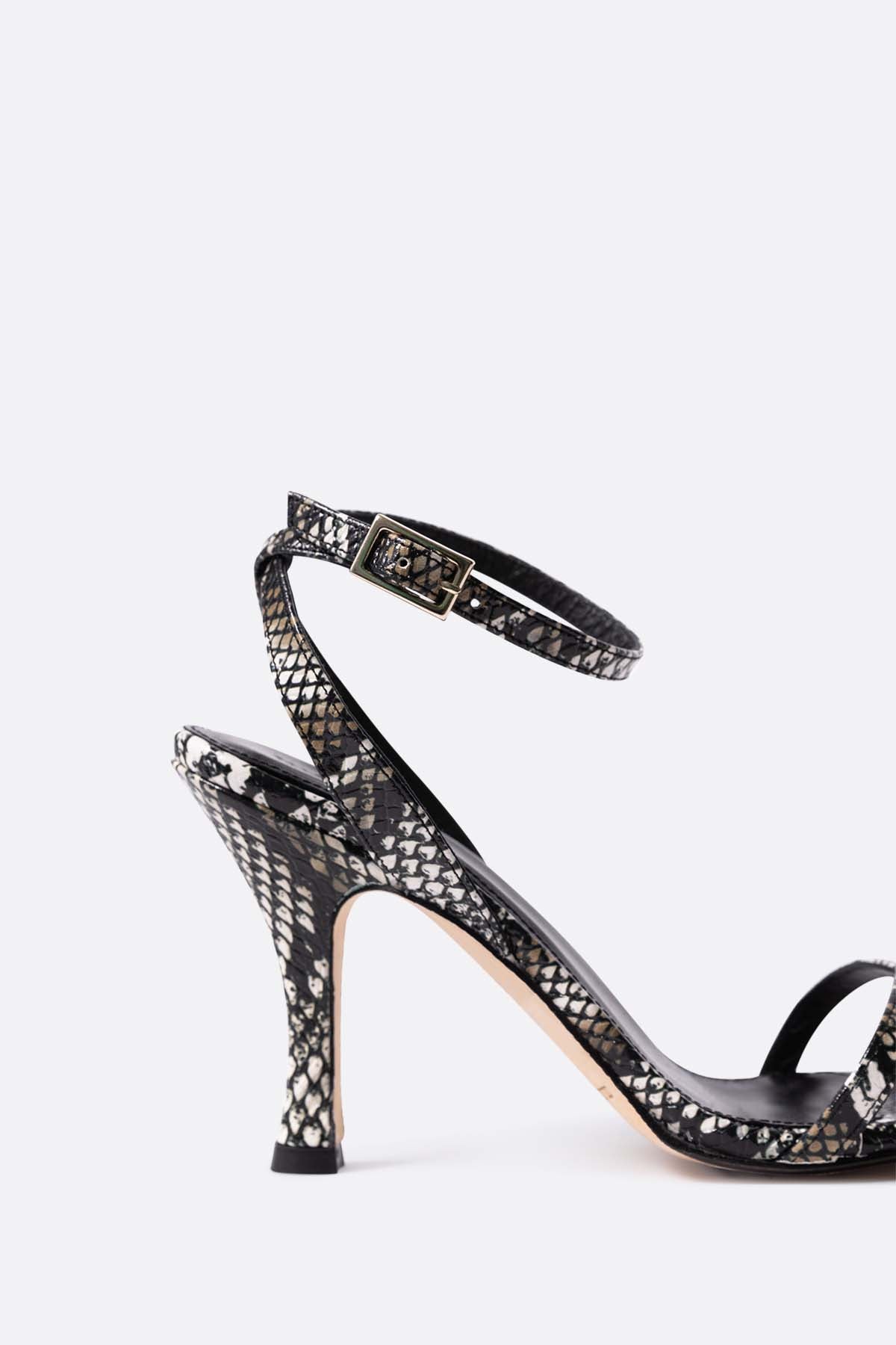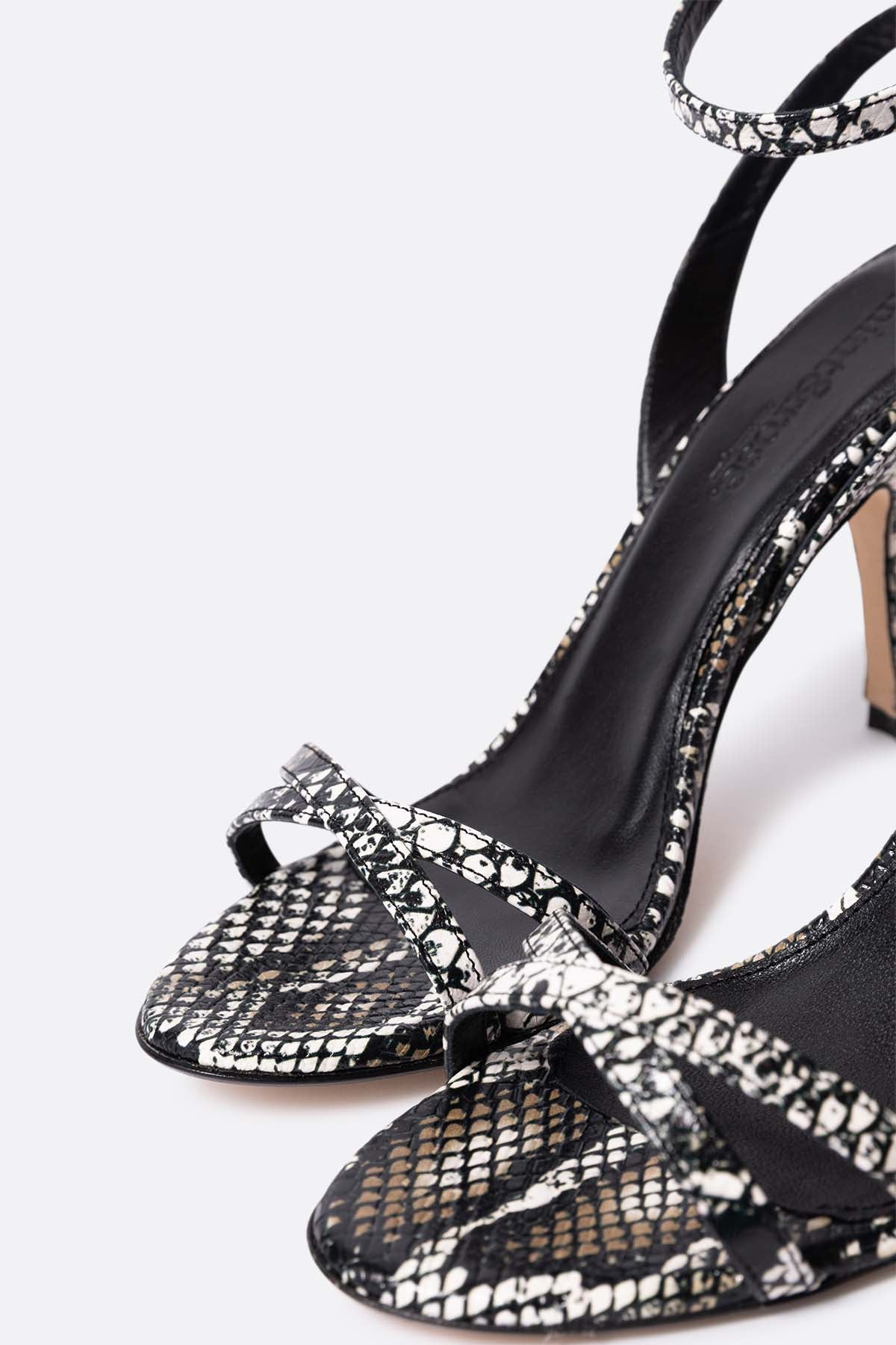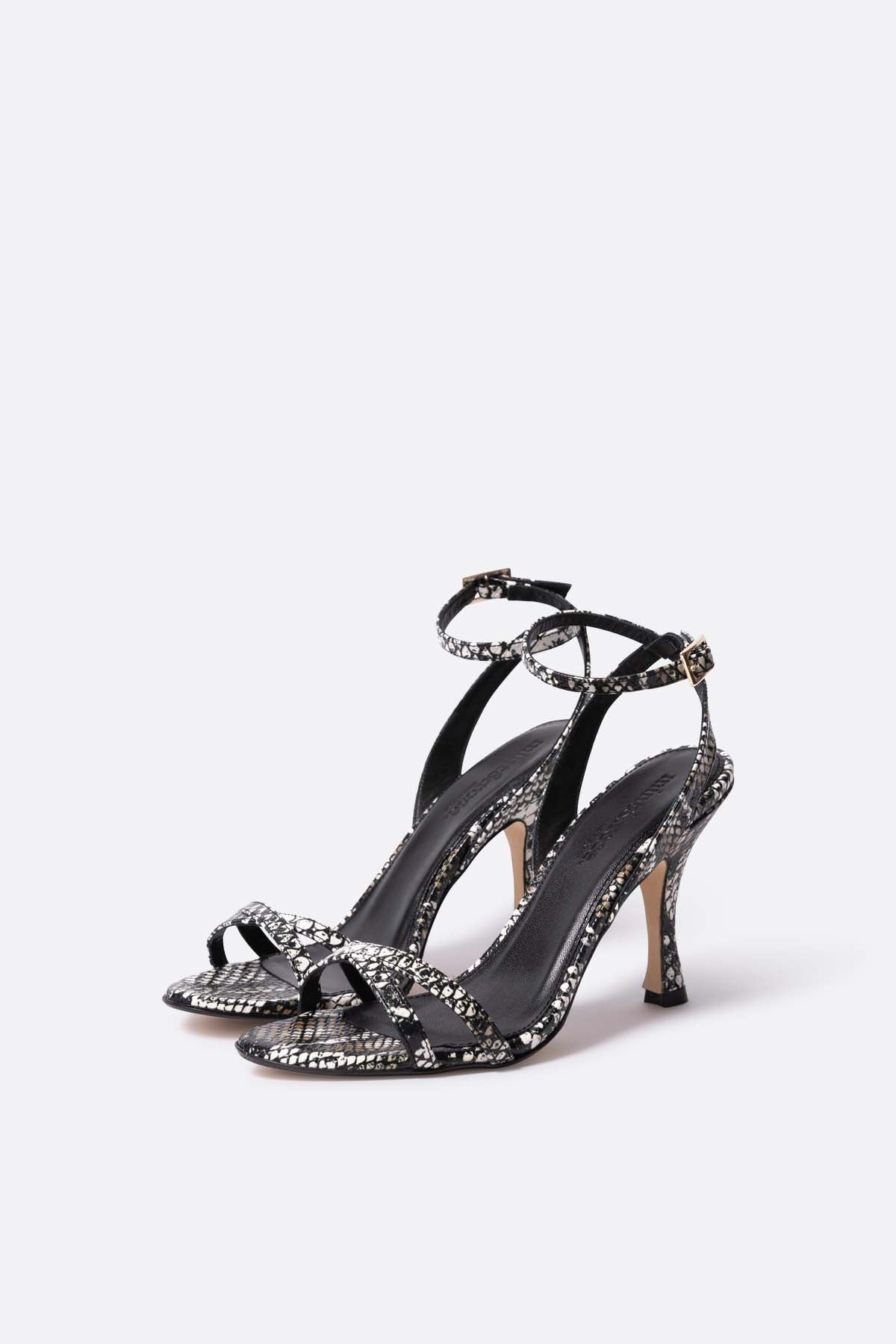 Tiene dos tiras delanteras cruzadas de piel que bordean el pie y lo estilizan. Complementa la sujeción una fina tira de pulsera con cierre de hebilla. Tacón acampanado de 9 cm con plantilla Cloud acolchada para la máxima comodidad.