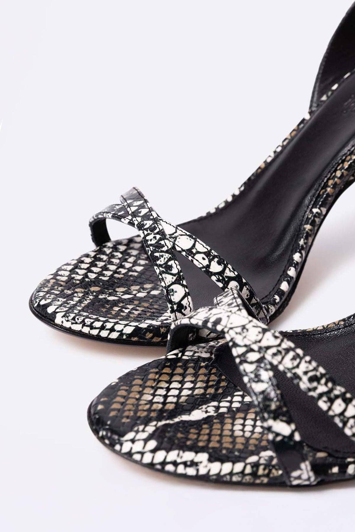 Tiene dos tiras delanteras cruzadas de piel que bordean el pie. Complementa la sujeción una fina tira de pulsera con cierre de hebilla. Tacón acampanado de 7 cm con plantilla Cloud acolchada para la máxima comodidad.