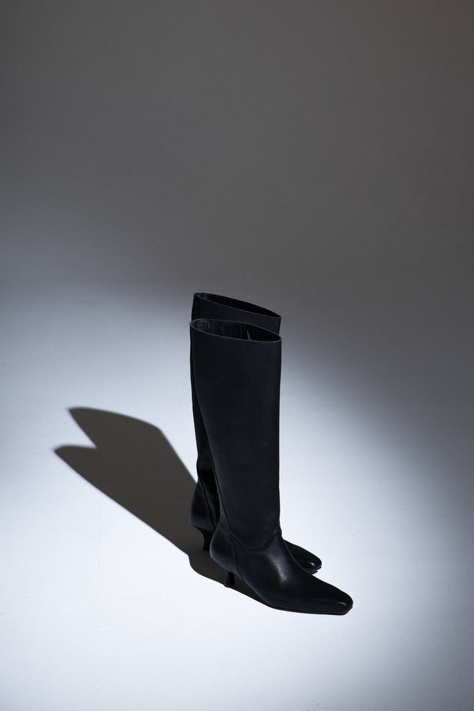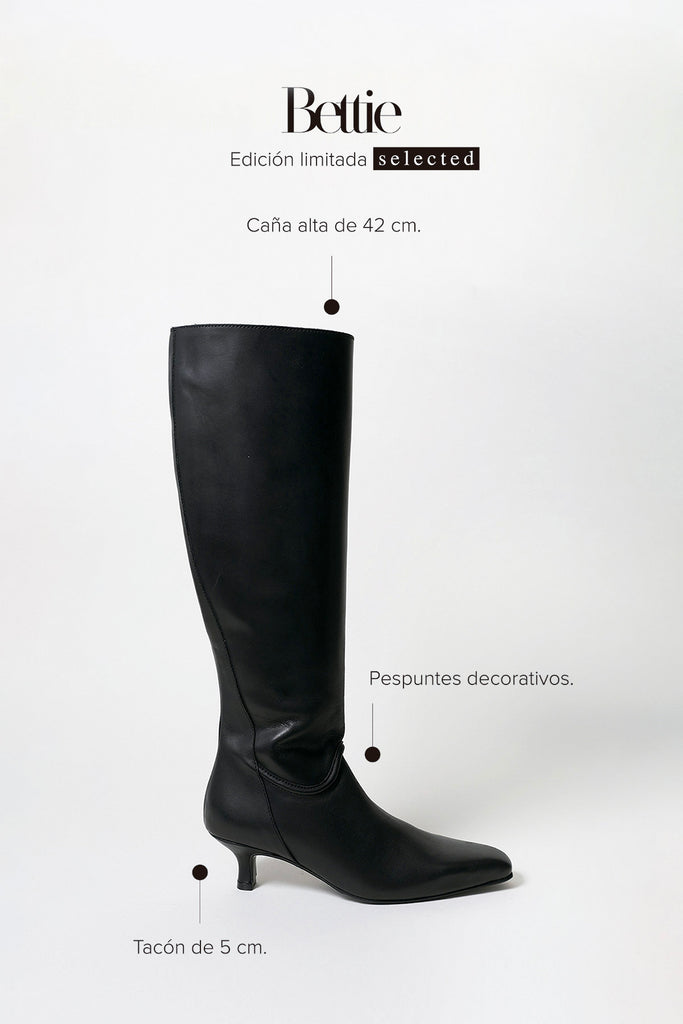 Las botas Bettie están hechas por artesanos españoles a partir de piel de la mejor calidad. Bettie es la versión en bota del botín Bettie. Ambas comparten una puntera alargada con final semi cuadrado y una delicada onda pespunteada decorando la parte delantera, presente en el resto de modelos de la cápsula. Altura de la caña: 16 cm hasta el inicio del tacón. Altura de la caña: 42 cm hasta el empiece del tacón. Anchura de la caña: 16 cm (parte alta) a 12 cm (tobillo). Cremallera al tono. Tacón de 5 cm.