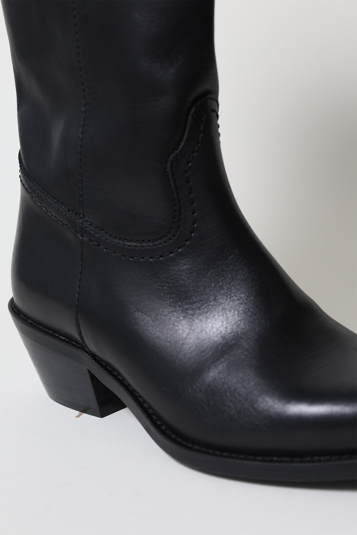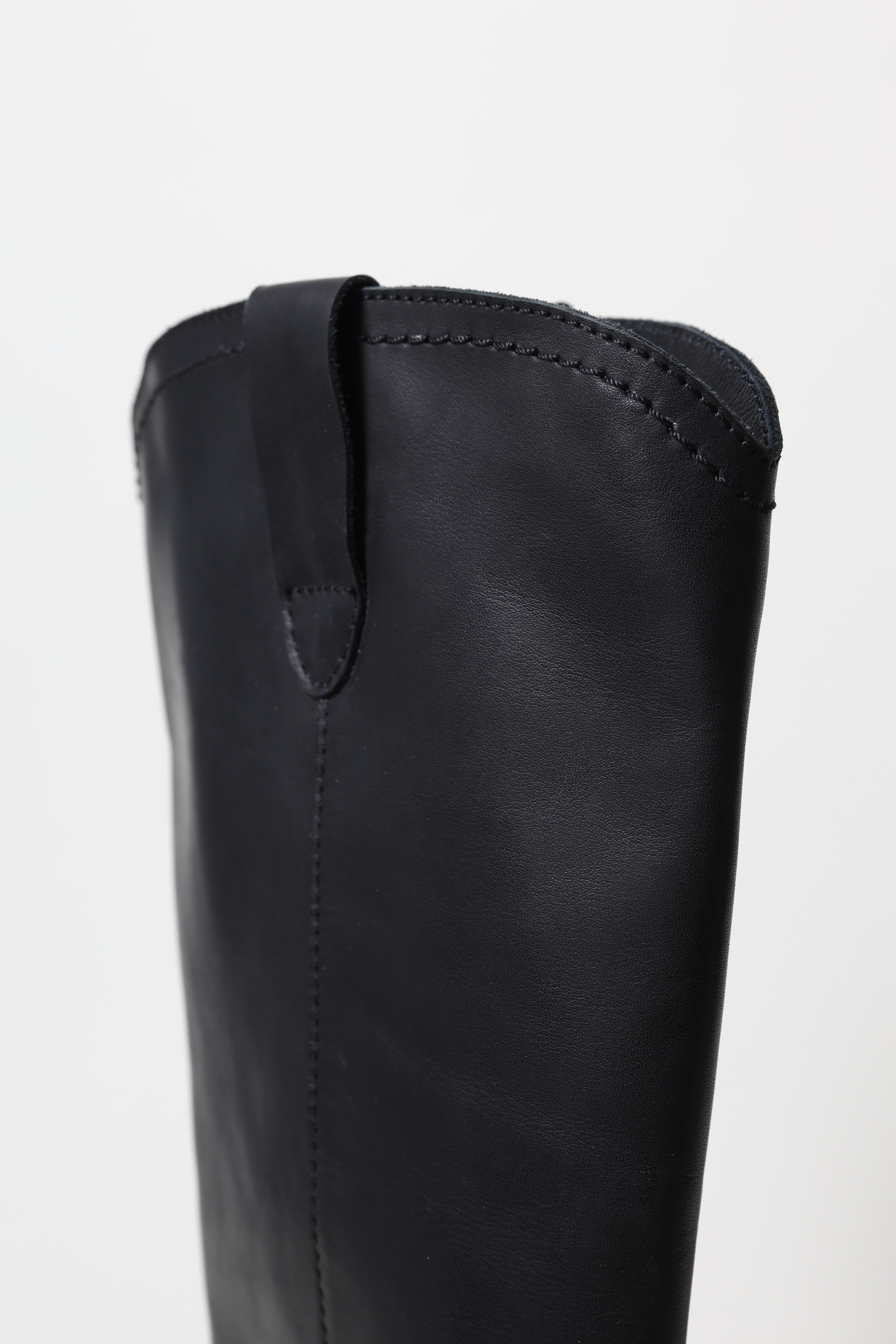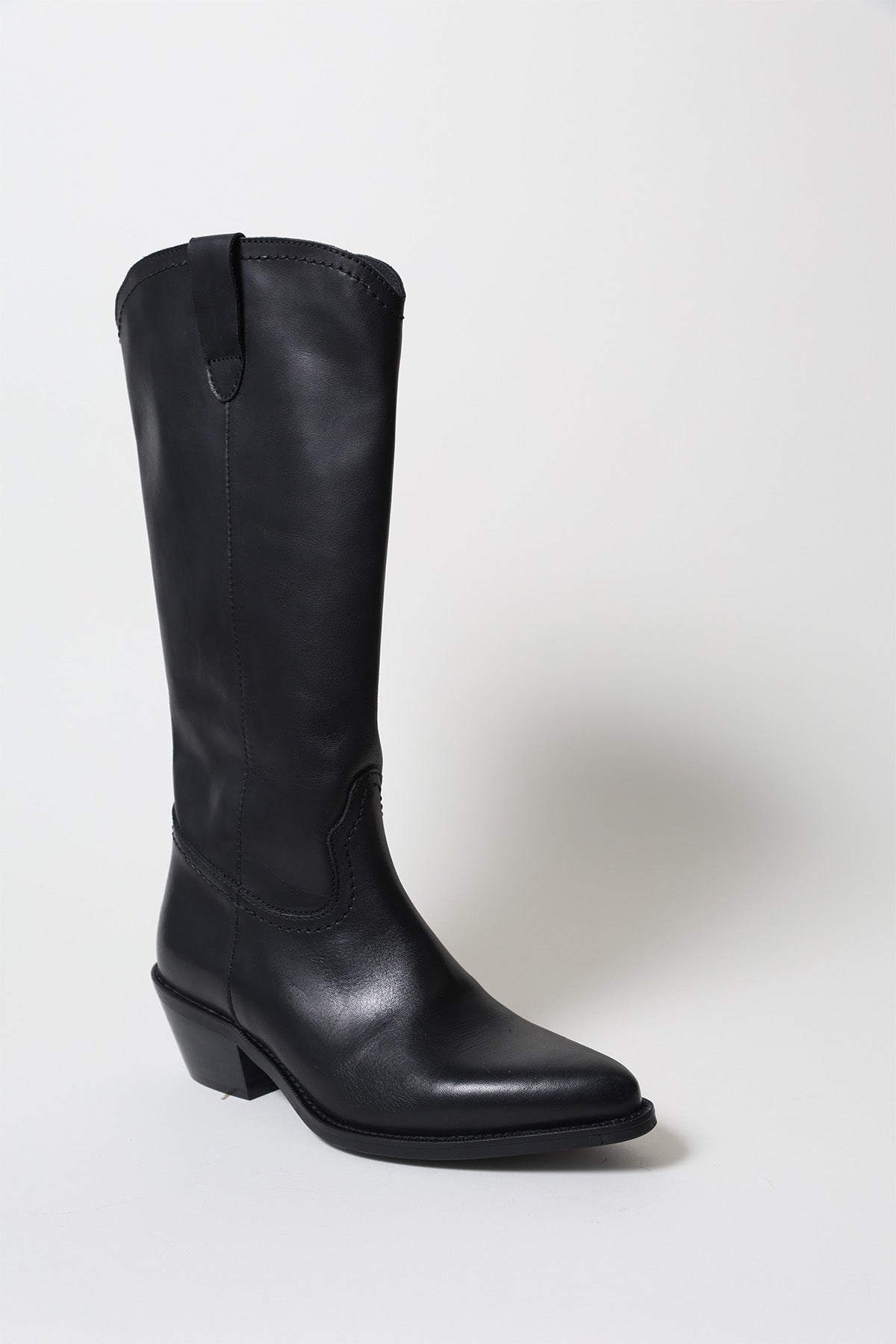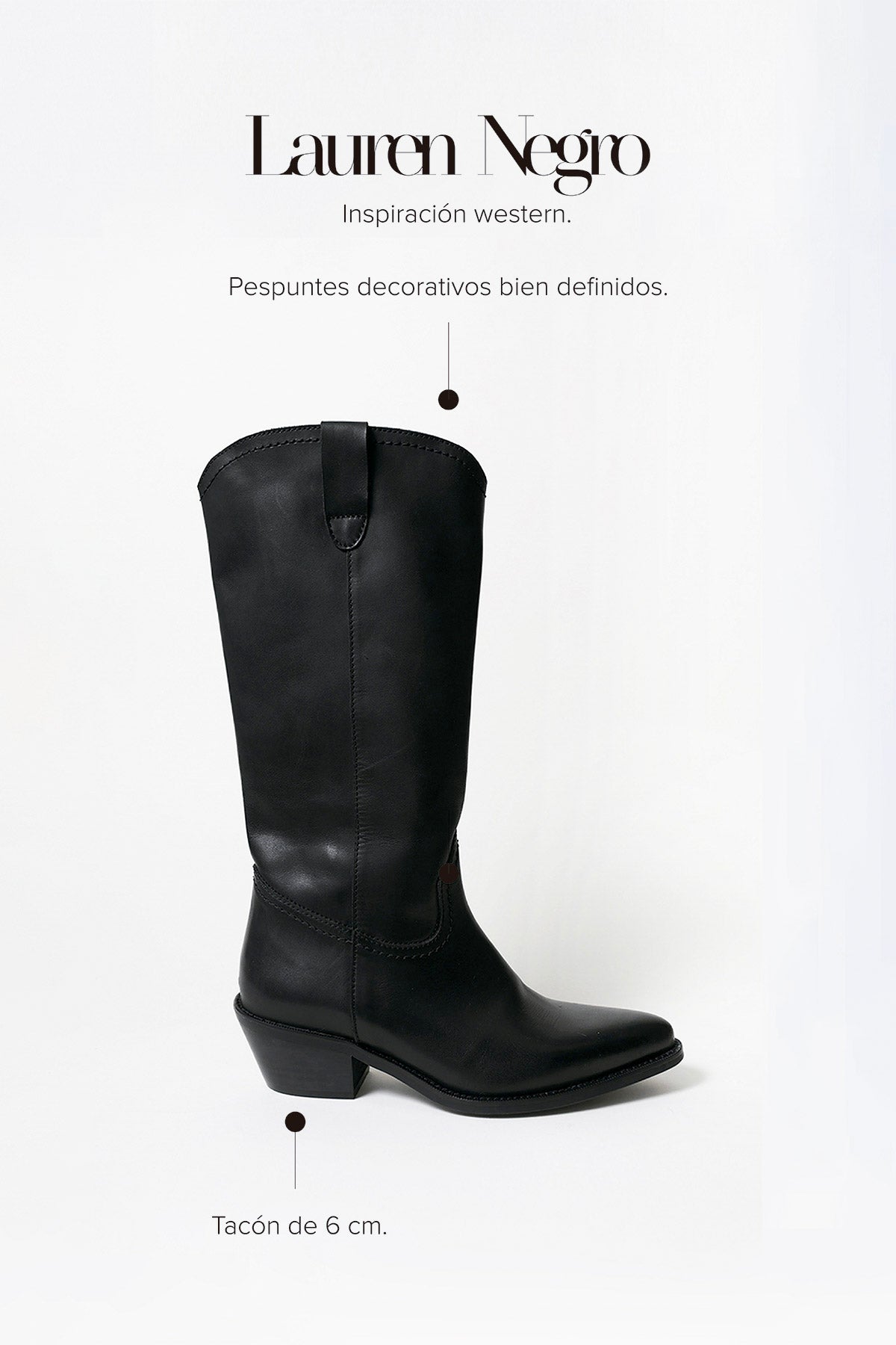 Las botas altas Lauren están hechas por artesanos españoles a partir de piel de la mejor calidad. Inspiración western que se aprecia en multitud de detalles: líneas superiores curvadas, media caña por debajo de la rodilla, puntera en punta y pespuntes decorativos bien definidos. Tacón de 6 cm. Anchura de caña: 17 cm (parte alta) y 13 cm (tobillo). Altura de caña: 33 cm.