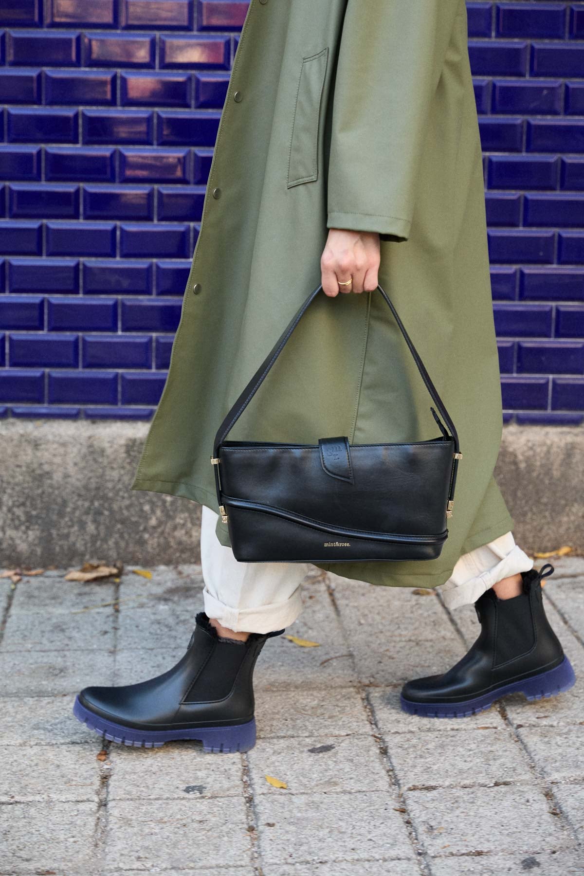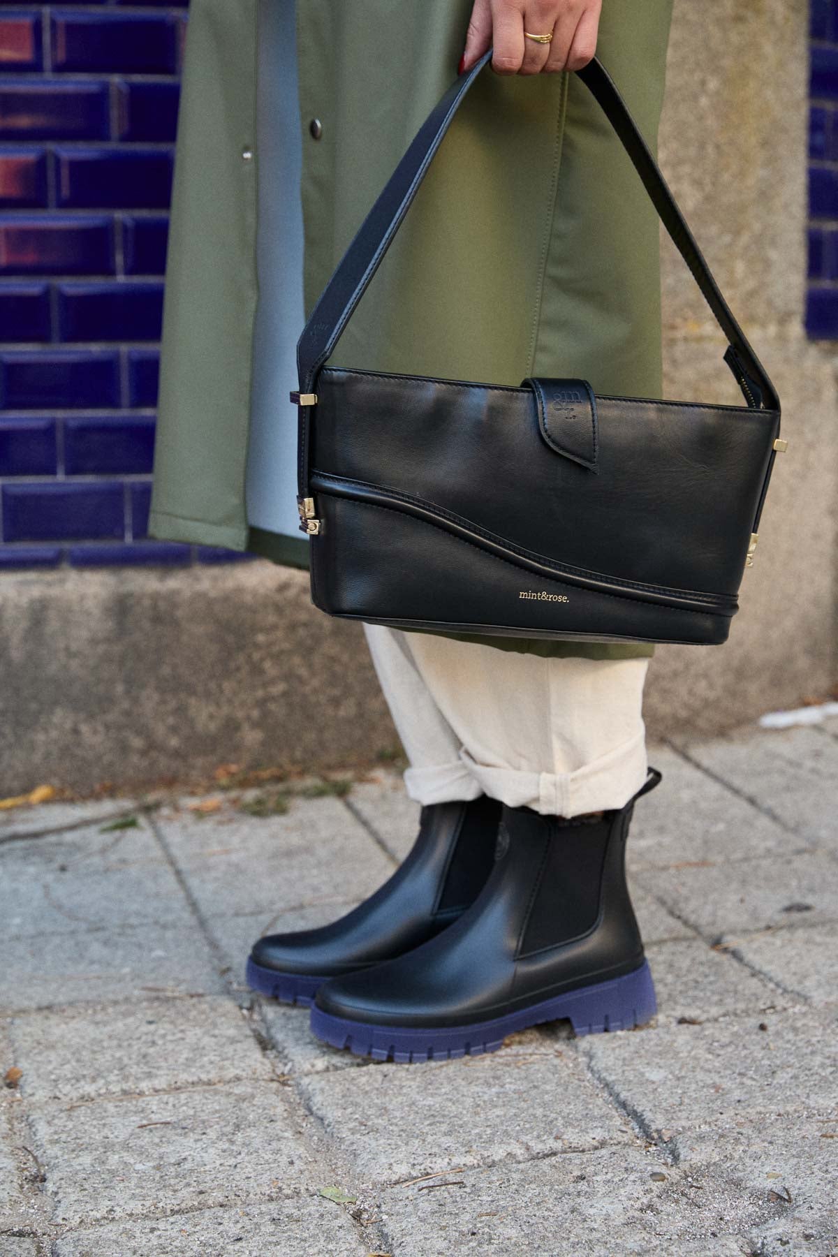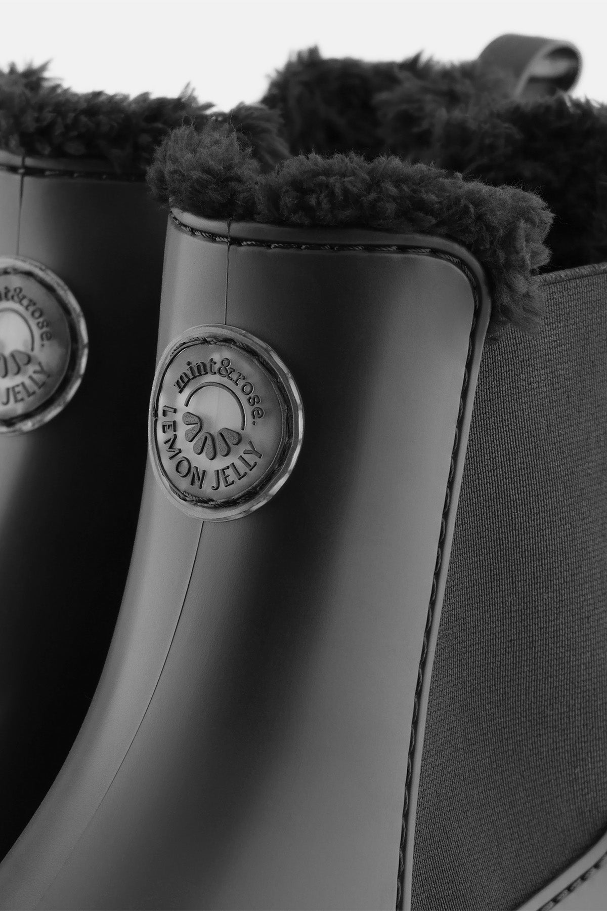 Fruto de la colaboración entre Lemon Jelly y mint&rose, estos botines negros con forro y plantilla de pelo sintético aportan un toque moderno al estilo clásico. Con acabado mate, suela translúcida con base azul que destaca al ponerlas al sol y elásticos laterales lisos, sus líneas minimalistas se combinan con un toque divertido en unos botines diseñados para destacar discretamente y durar mucho tiempo. Altura del tacón: 4 cm.