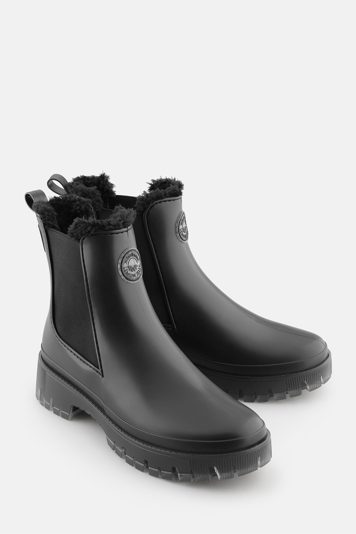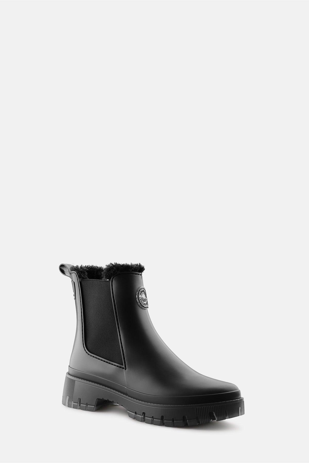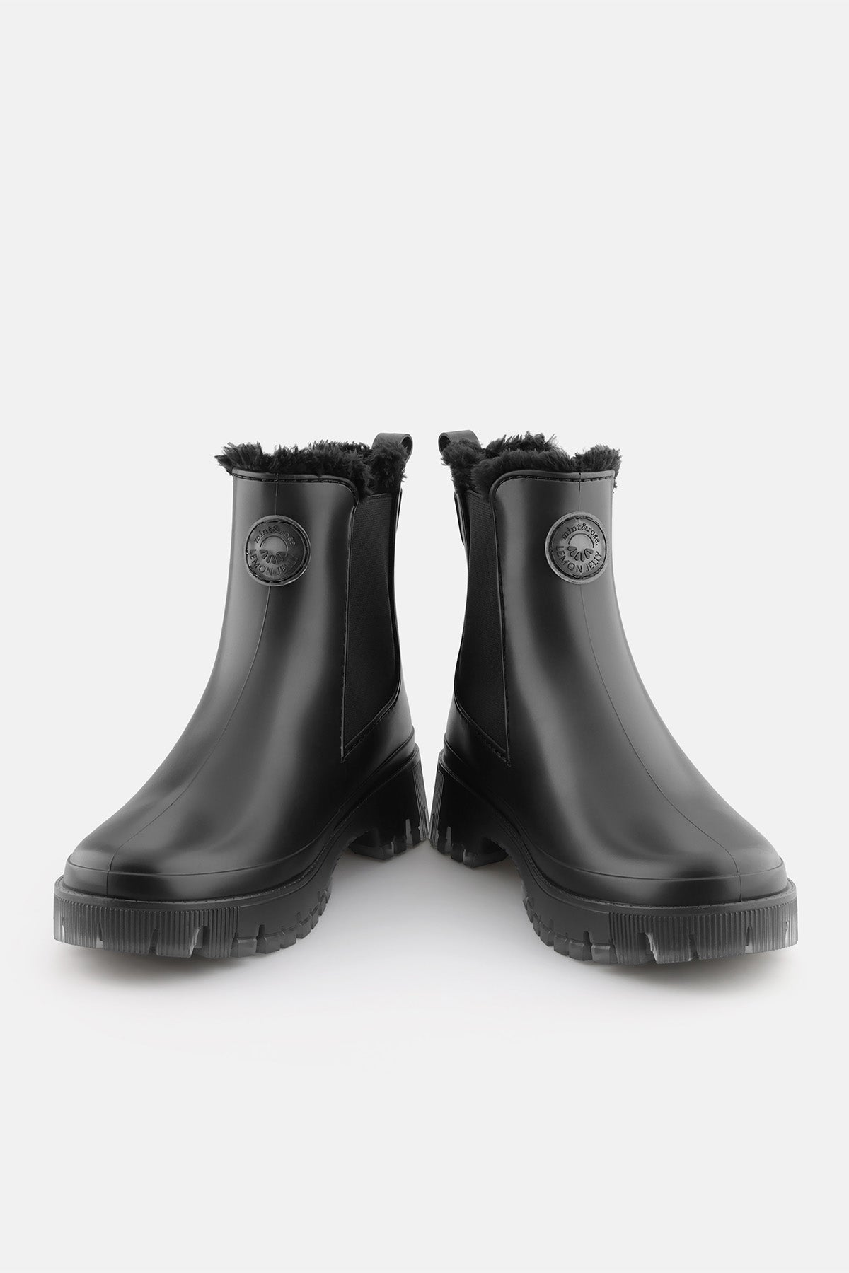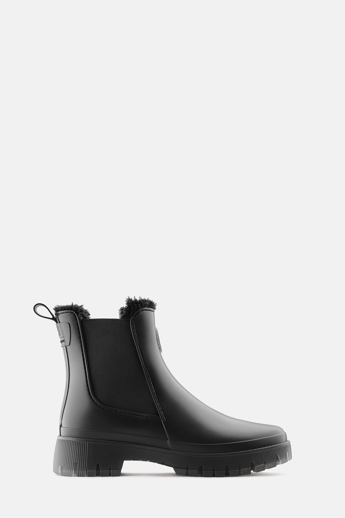 Fruto de la colaboración entre Lemon Jelly y mint&rose, estos botines negros con forro y plantilla de pelo sintético aportan un toque moderno al estilo clásico. Con acabado mate, suela translúcida con base azul que destaca al ponerlas al sol y elásticos laterales lisos, sus líneas minimalistas se combinan con un toque divertido en unos botines diseñados para destacar discretamente y durar mucho tiempo. Altura del tacón: 4 cm.
