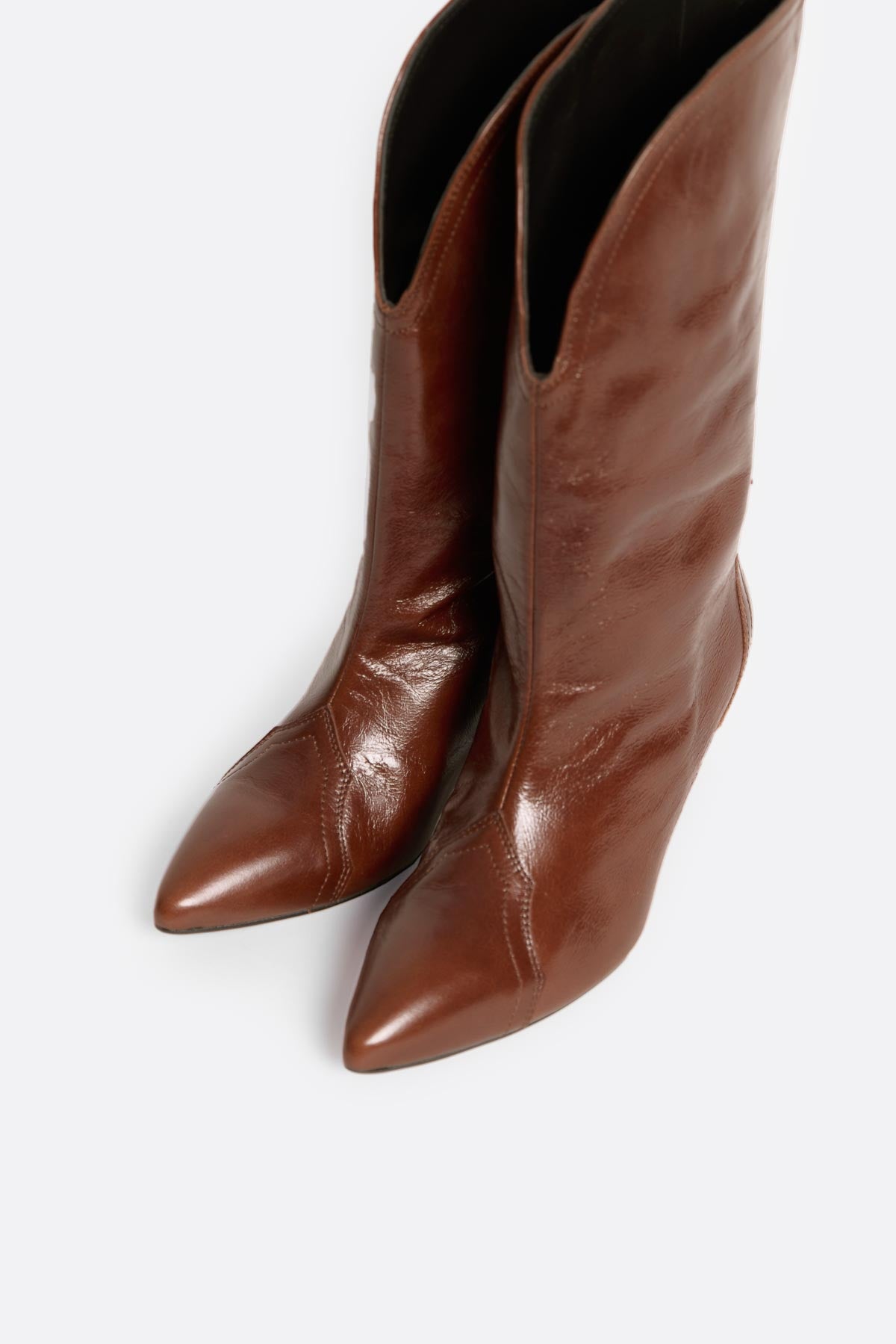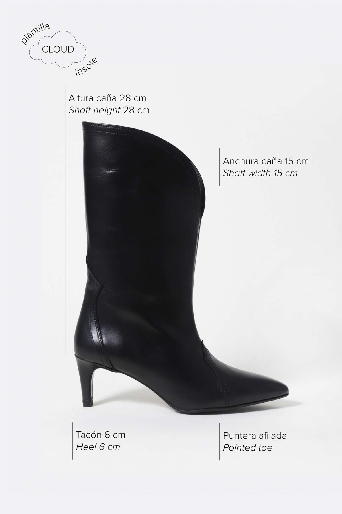 Las botas Geraldine están hechas por artesanos españoles a partir de piel de la mejor calidad. Inspiración western que se aprecia en multitud de detalles: Líneas superiores curvadas, media caña ancha, puntera en punta, pespuntes decorativos bien definidos y tacón de 6 cm. Altura de 28 cm y anchura de caña de 15cm.