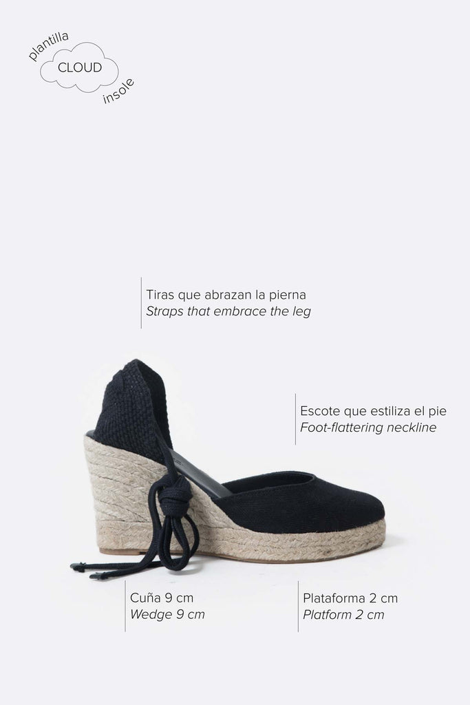 La altura de la cuña es de 9 cm aproximadamente (esta medida incluye los 2 cm de su plataforma de yute trenzado) y suela de goma.