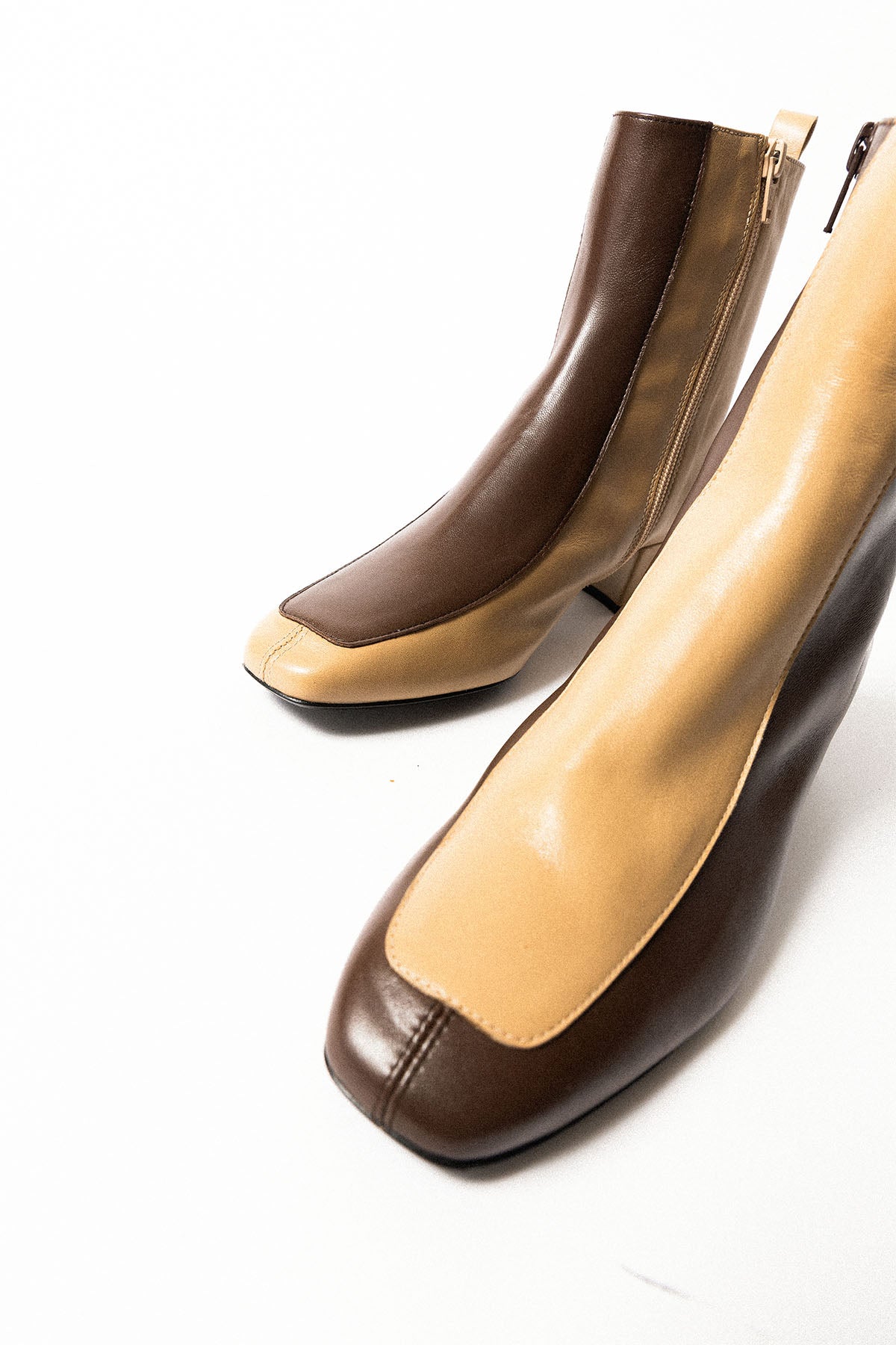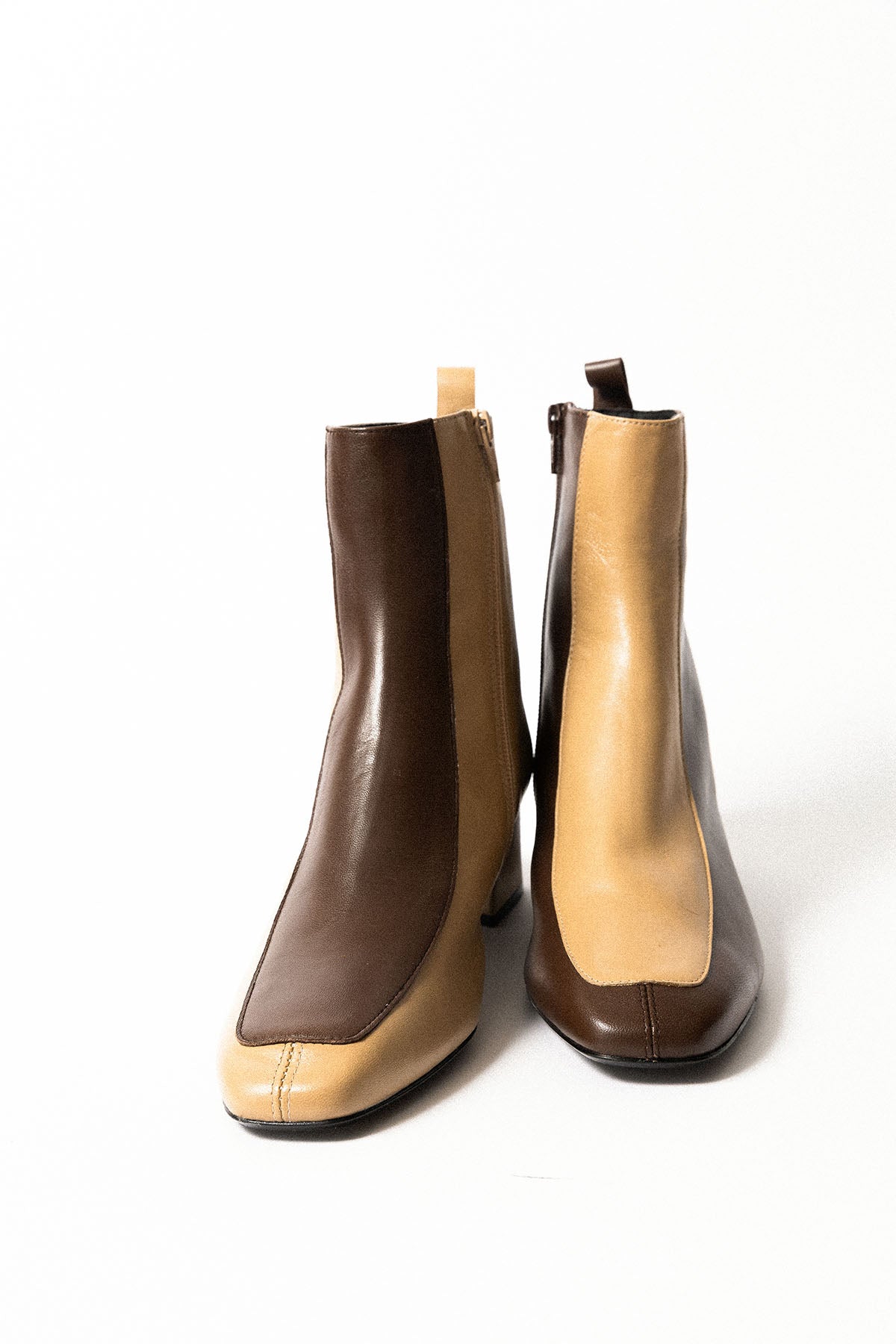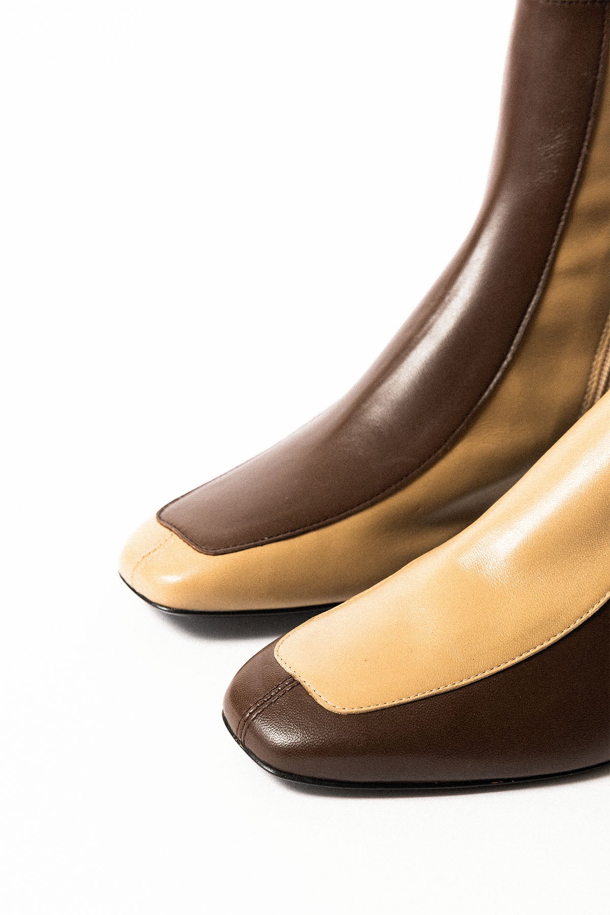 What we love the most: the asymmetry between the feet and the contrast of cream and chocolate brown colors.