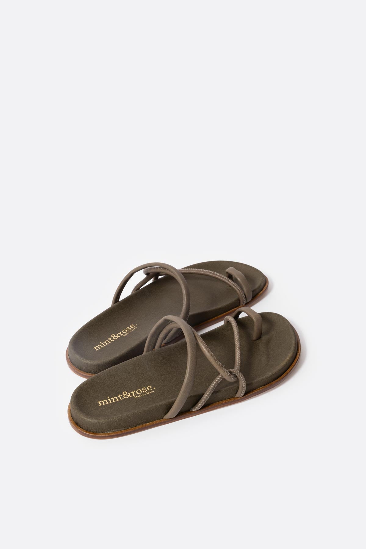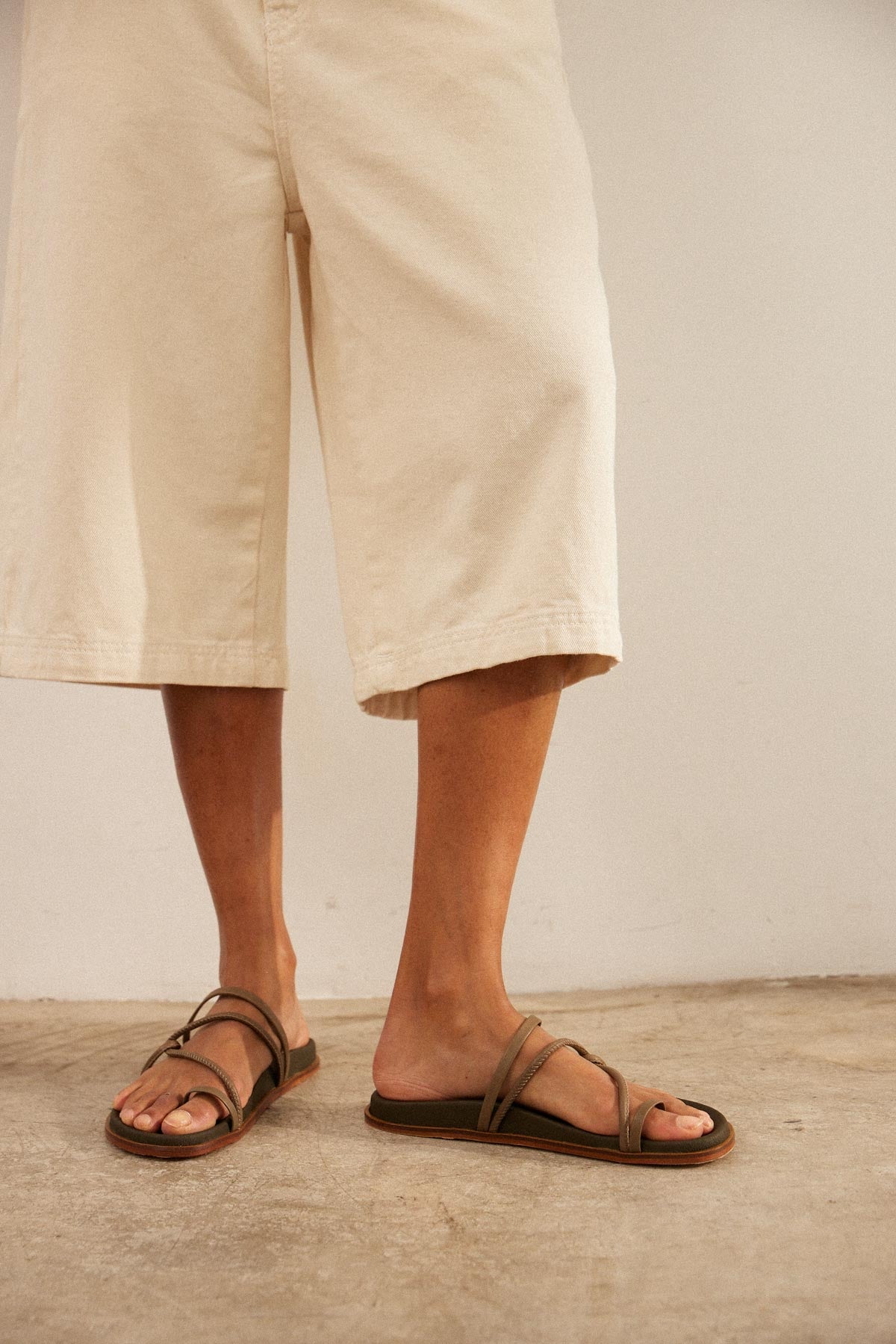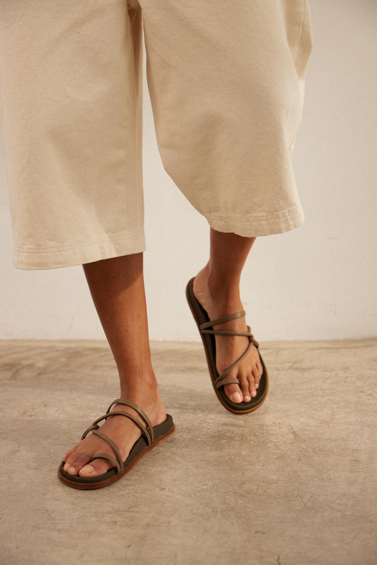 Tres tiras de piel blandita agarran el pie, y otra más para el dedo aportan la firmeza definitiva. La planta tiene la forma del pie para abrazarlo y la suela es de cuero.