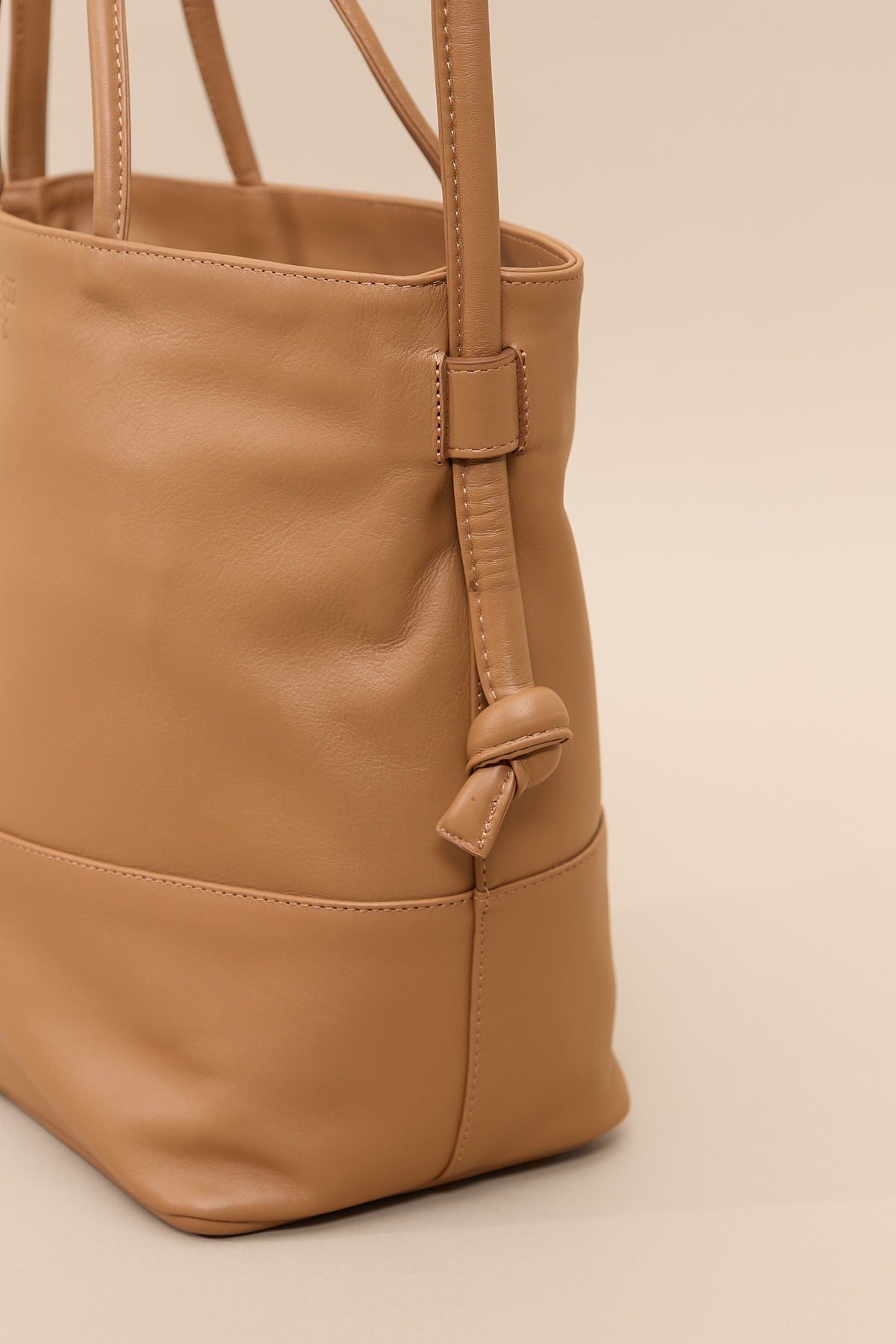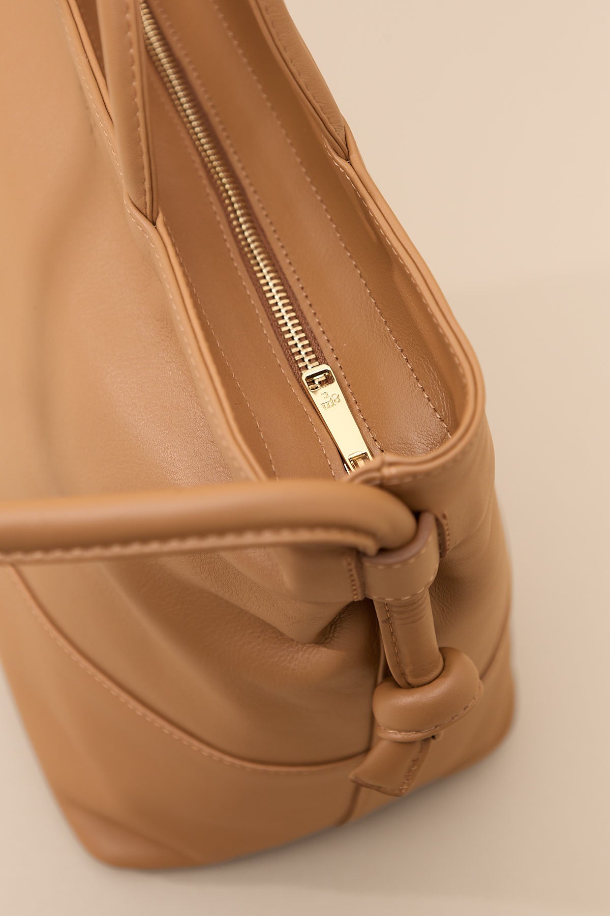 All its details help to create that air of subtlety: decorative stitching, tone-on-tone stitching, long adjustable handle with knot hook, short strap, and gold zipper. The interior is made of linen, it has a pocket and a bottom tray to maintain its shape.