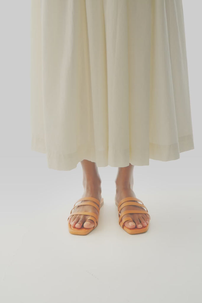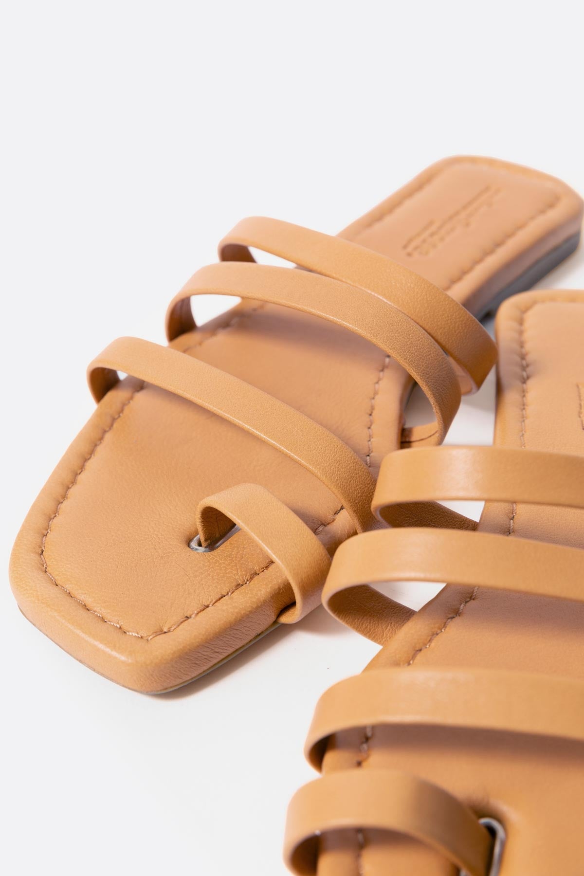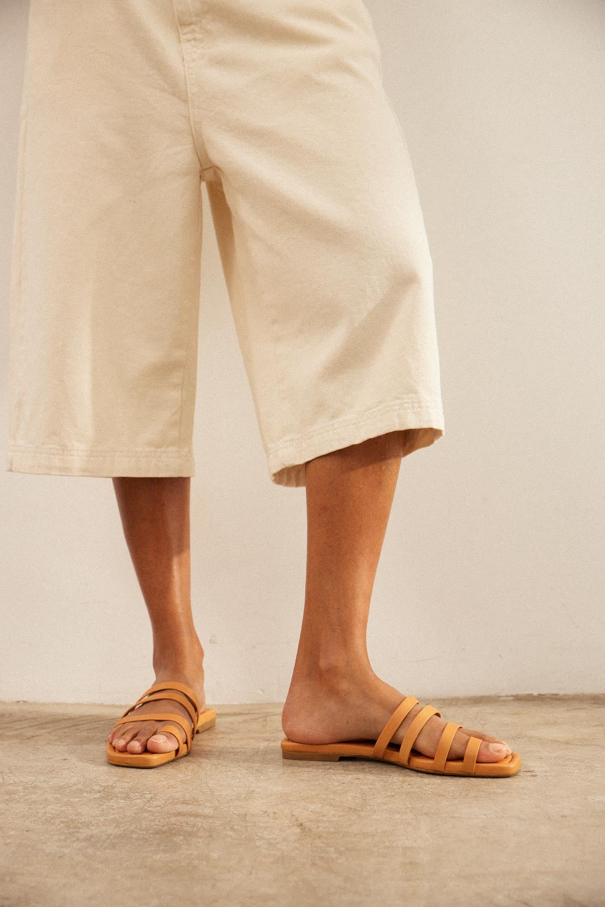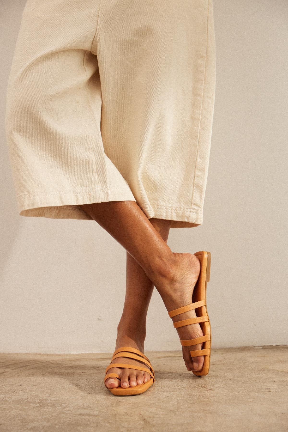 Las sandalias Olimpia destacan por su diseño versátil y atemporal, combinado con una selección meticulosa de los materiales que garantiza su durabilidad. De estilo minimalista, están confeccionadas en suave cuero con tres tiras y otra que envuelve el dedo. Suela con altura de 0,5 cm.