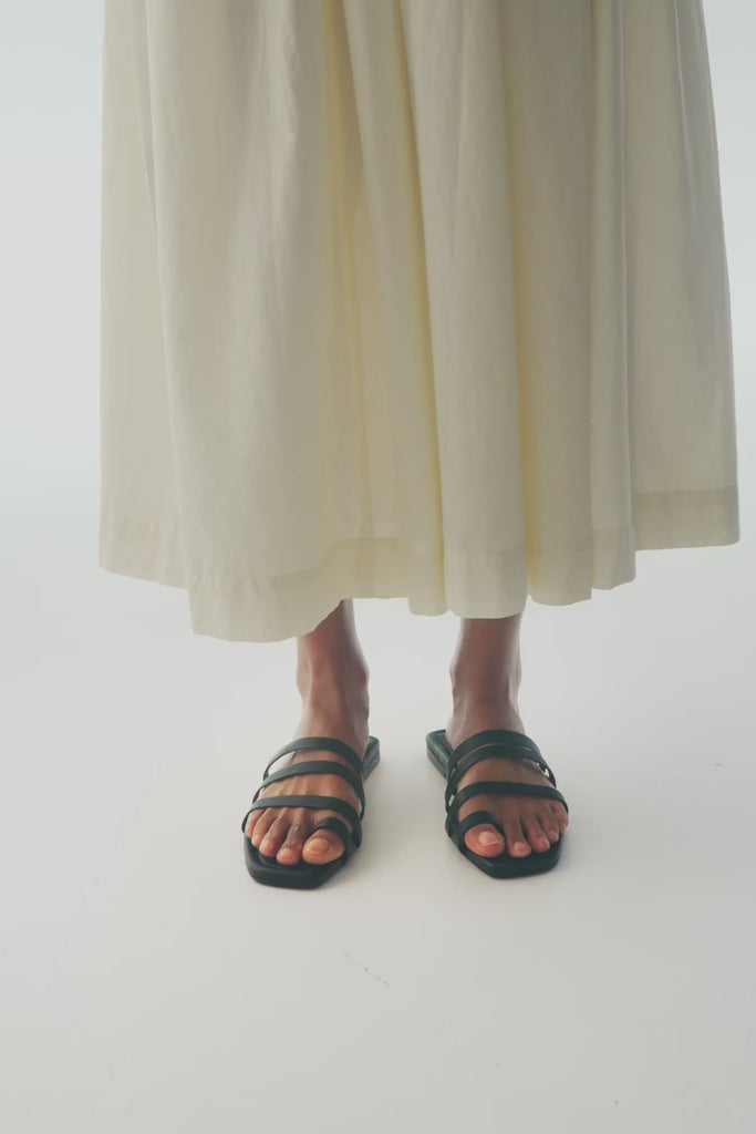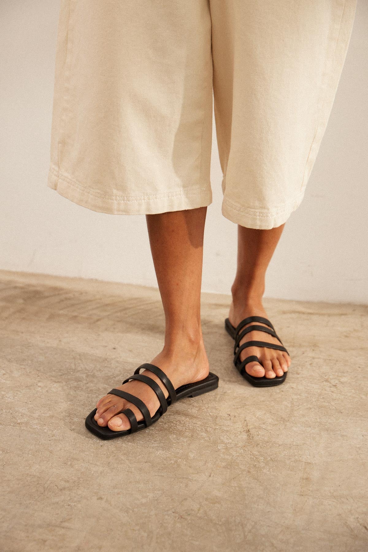 Las sandalias Olimpia destacan por su diseño versátil y atemporal, combinado con una selección meticulosa de los materiales que garantiza su durabilidad. De estilo minimalista, están confeccionadas en suave cuero con tres tiras y otra que envuelve el dedo. Suela con altura de 0,5 cm.