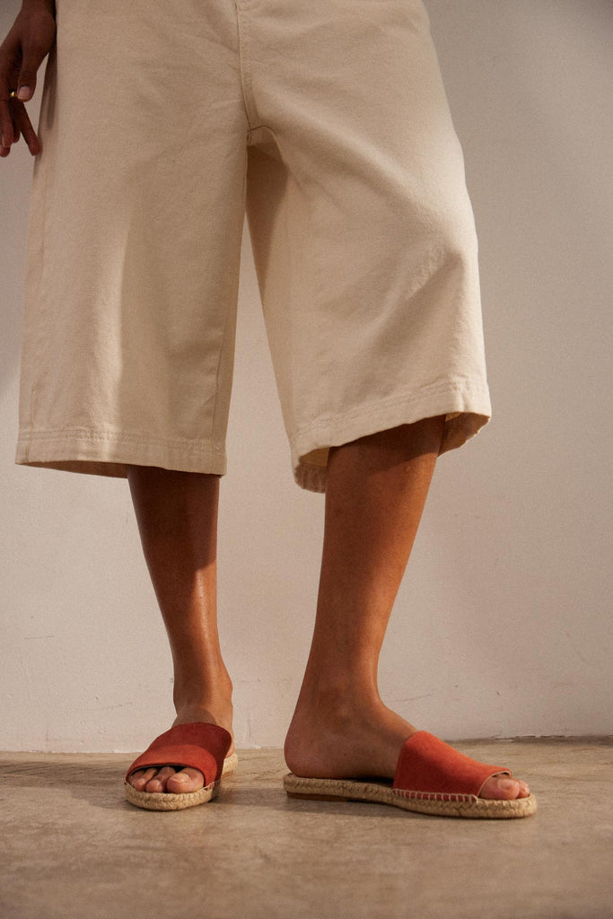 Una tira única forrada de 7 cm abraza el pie, son completamente destalonadas. Suela de yute trenzado y goma de 1,6 cm de alto.