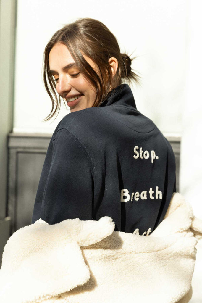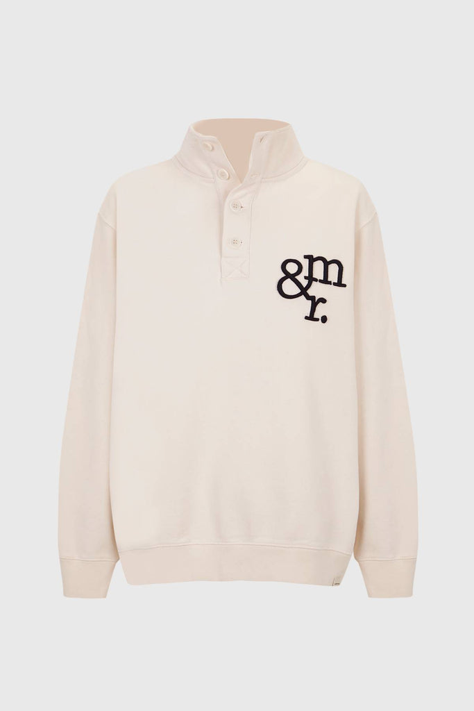 Beige sweater with navy blue lettering