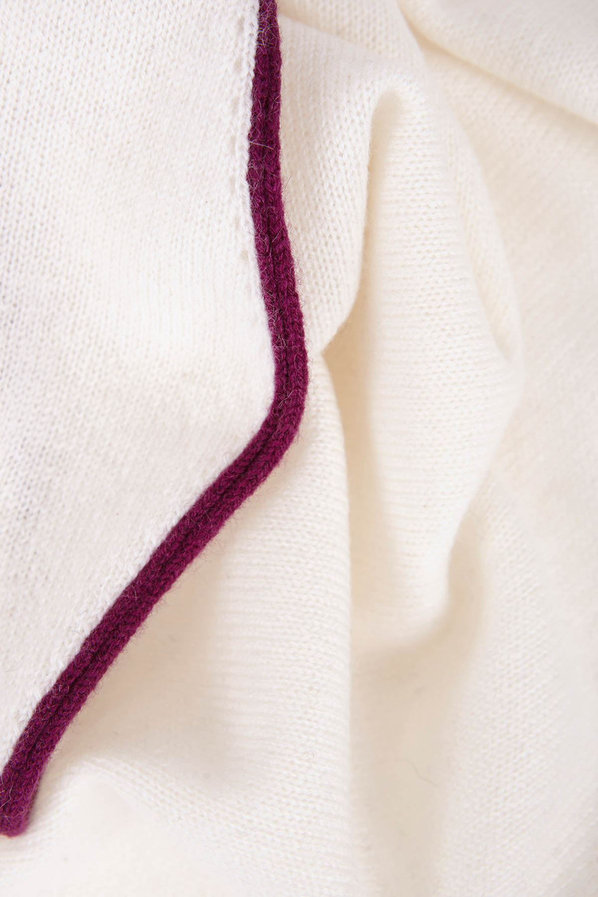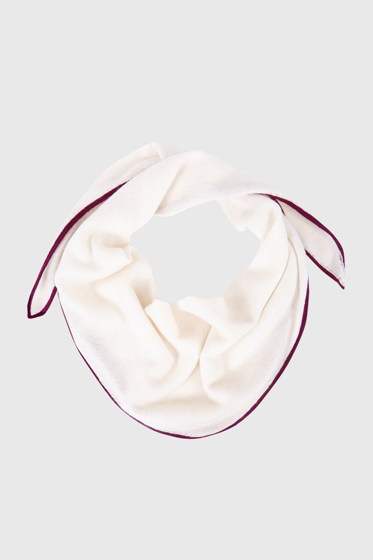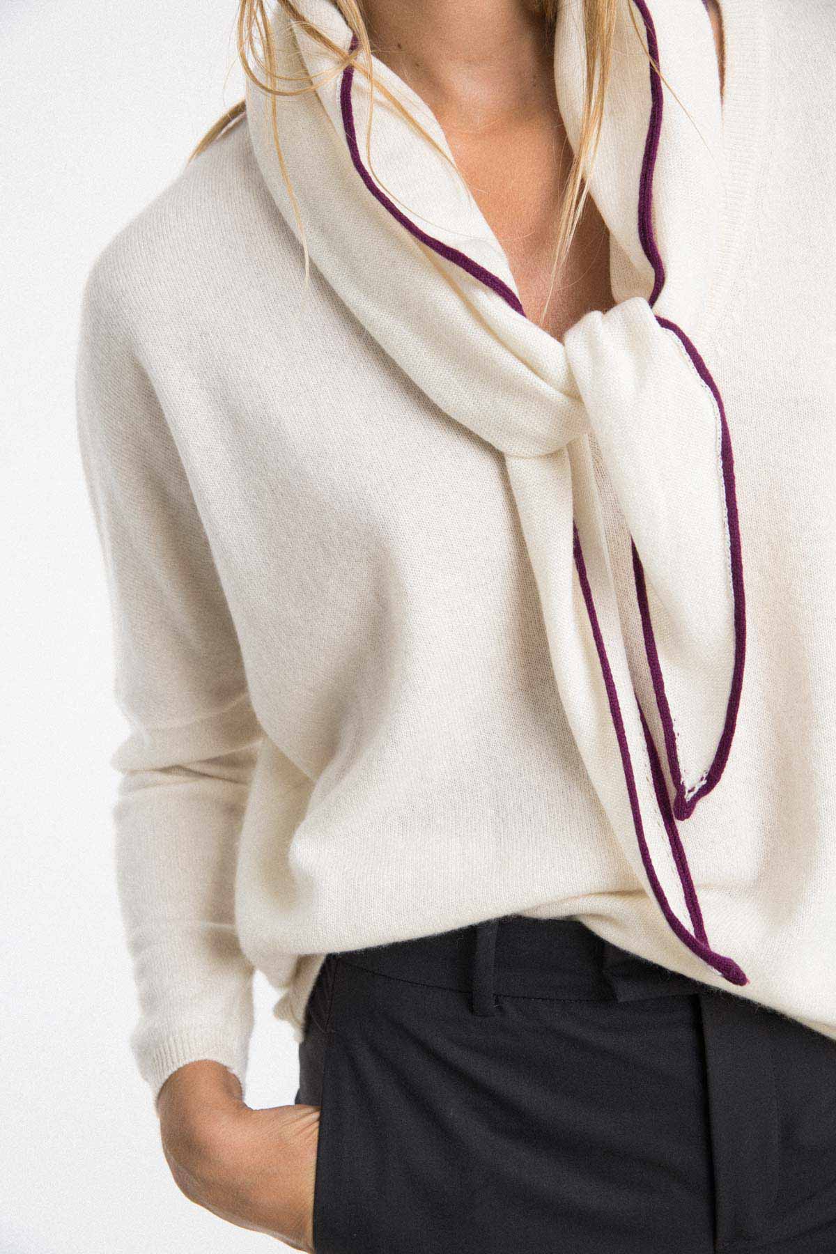 What we like the most: feeling its softness on the neck and its ecru color and purple border.