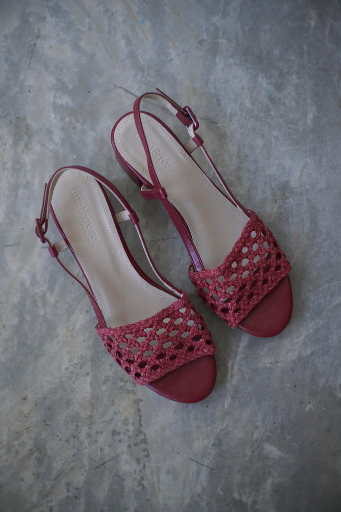 Diseño delantero trenzado, del que parten dos tiras de piel que bordean el pie y lo estilizan, ajustandose al talón con un broche de hebilla. Puntera redondeada y tacón en bloque de 5,5 cm.