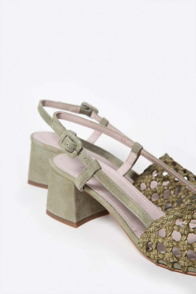 Features a braided front and two leather straps that skirt and slim the foot and are secured with a buckle. Round toe and 5cm block heel.