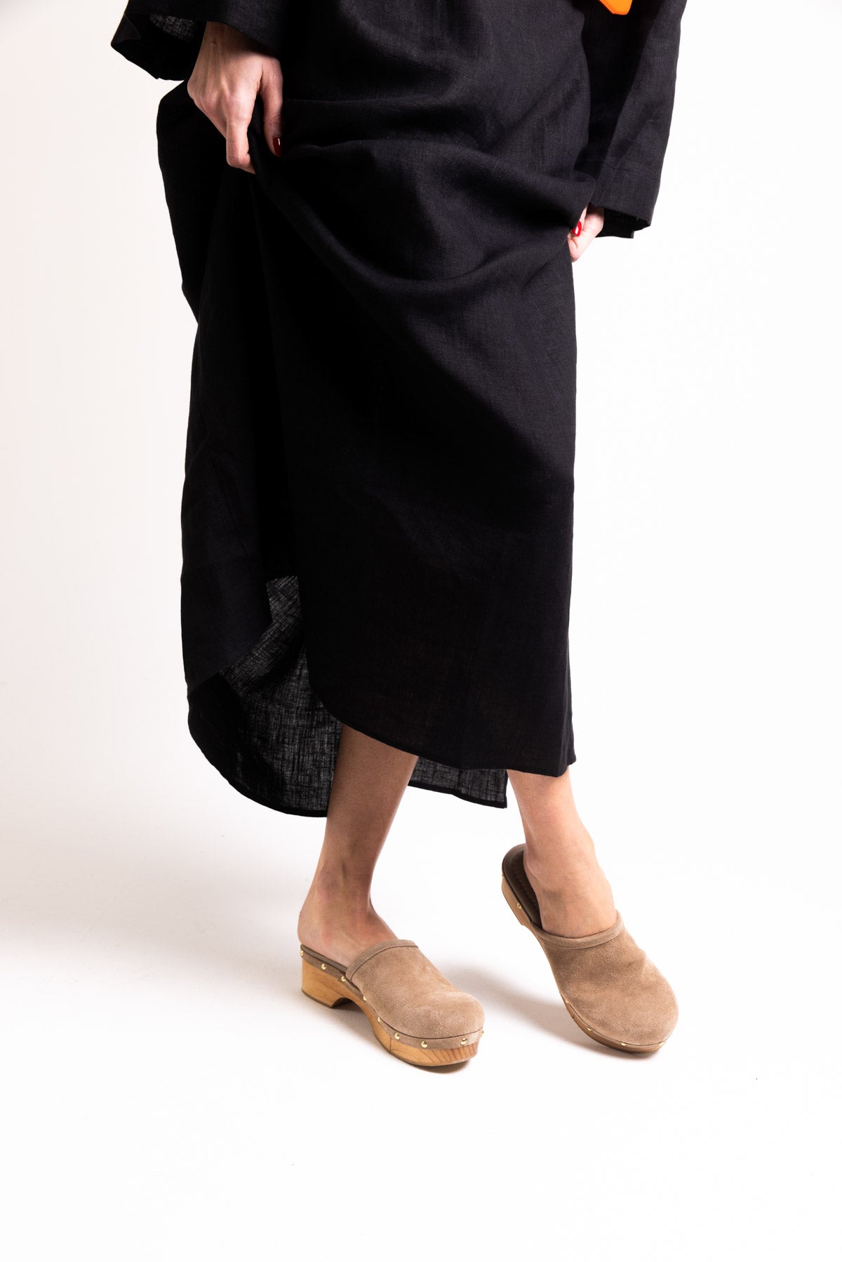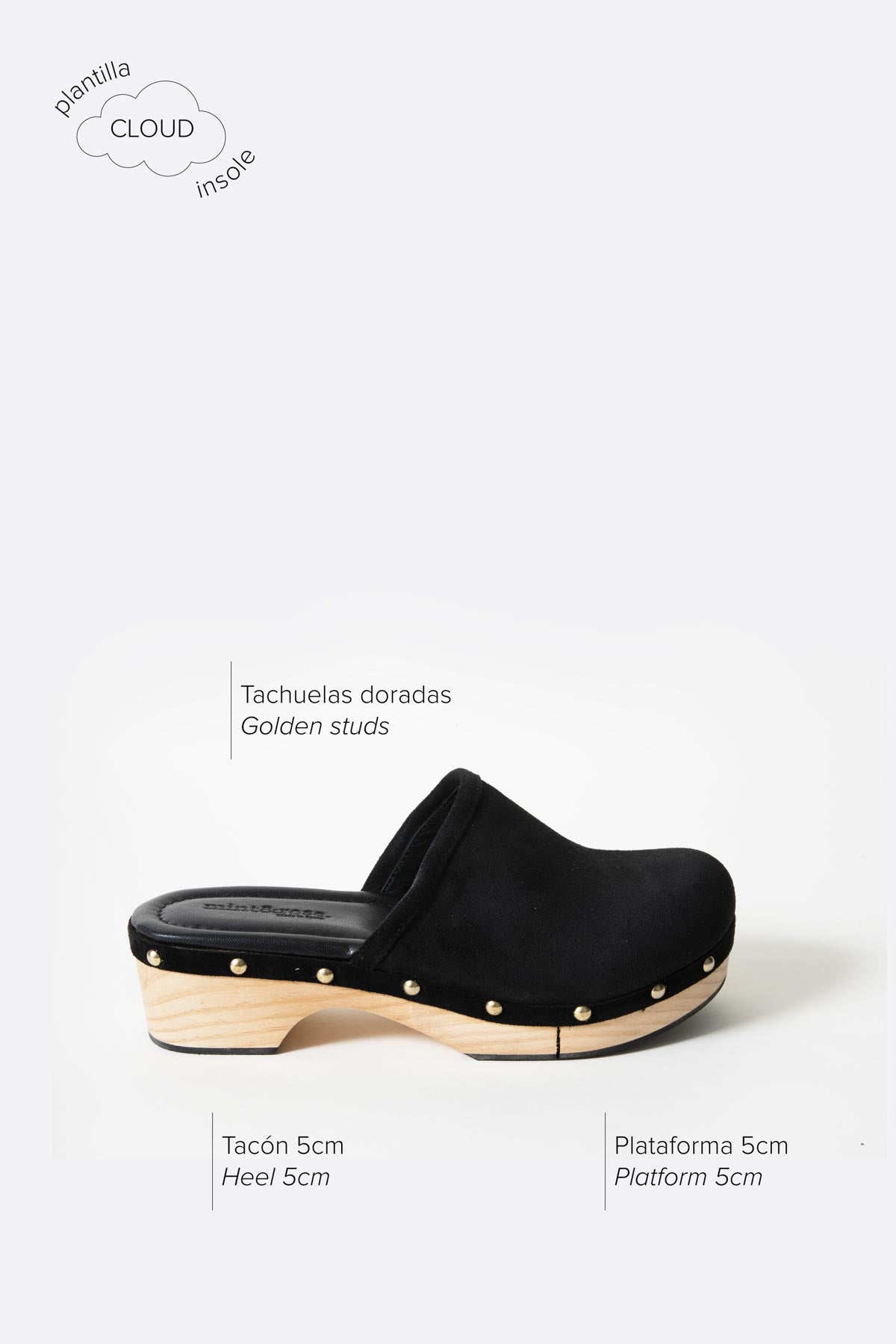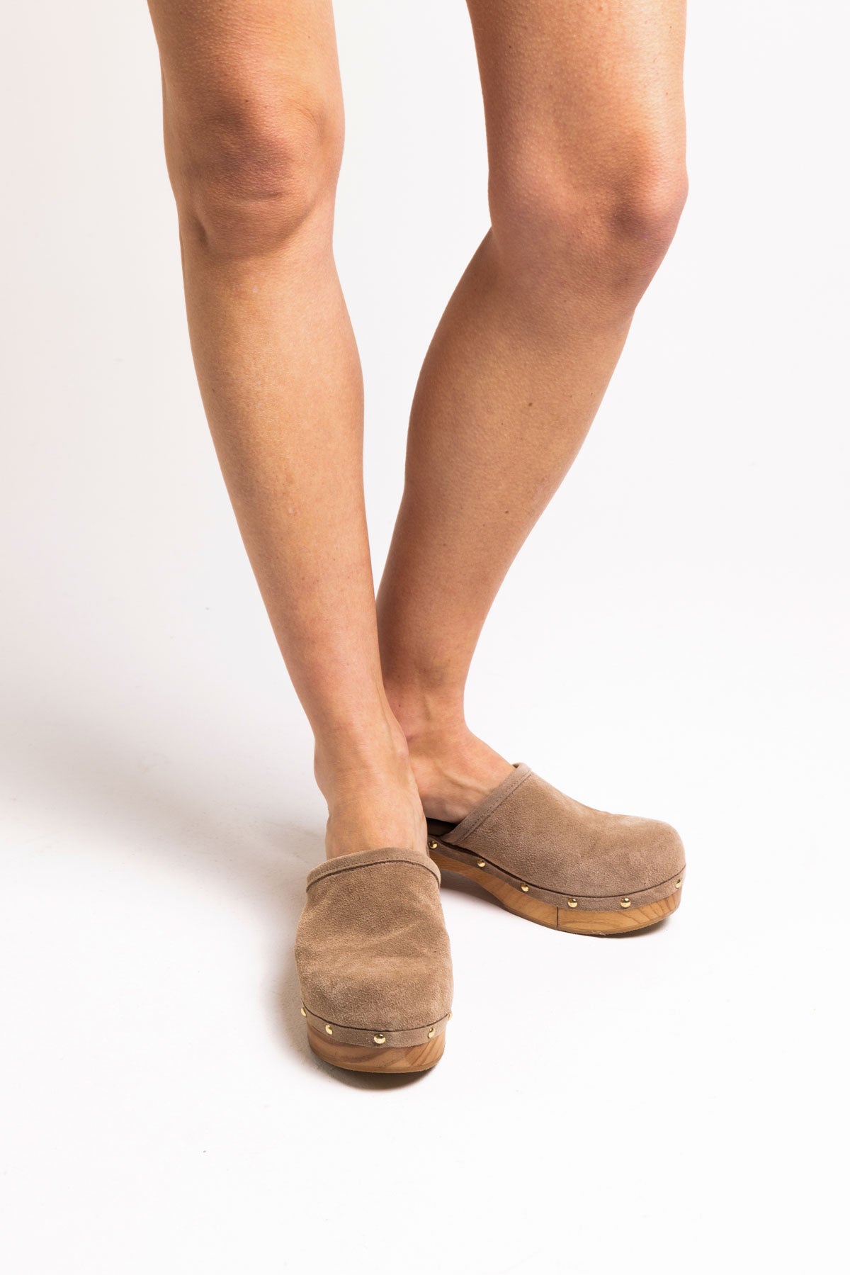 These clogs are handcrafted in Spain, following centuries-old traditional techniques. Beige suede clog with golden studs on the edge and wooden sole, with a cut in the middle to make walking easier. Wooden platform of 3 cm.