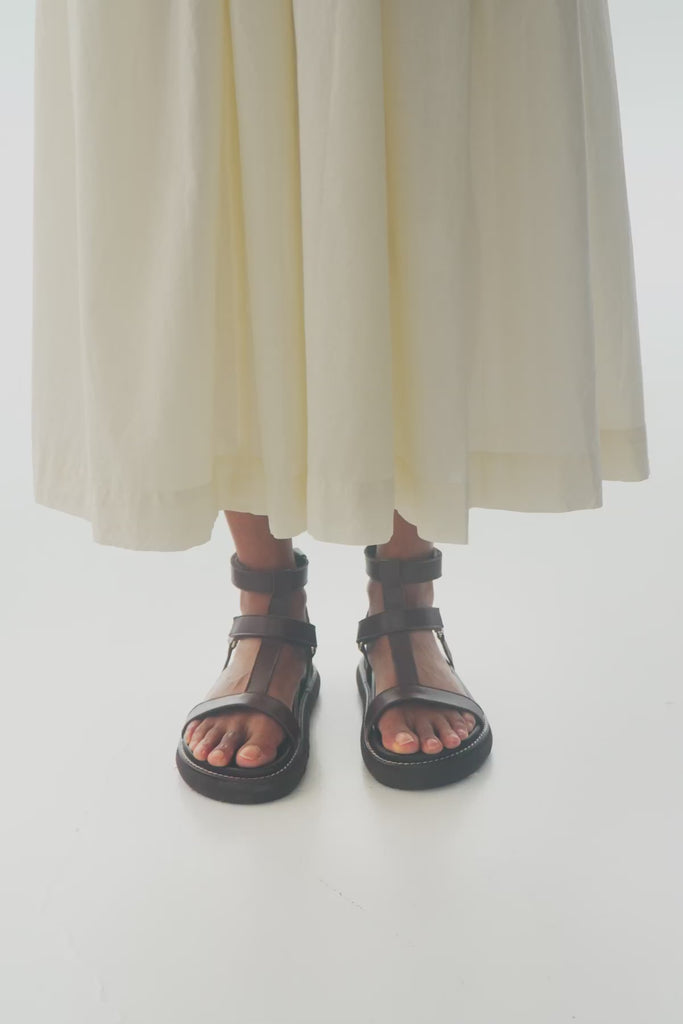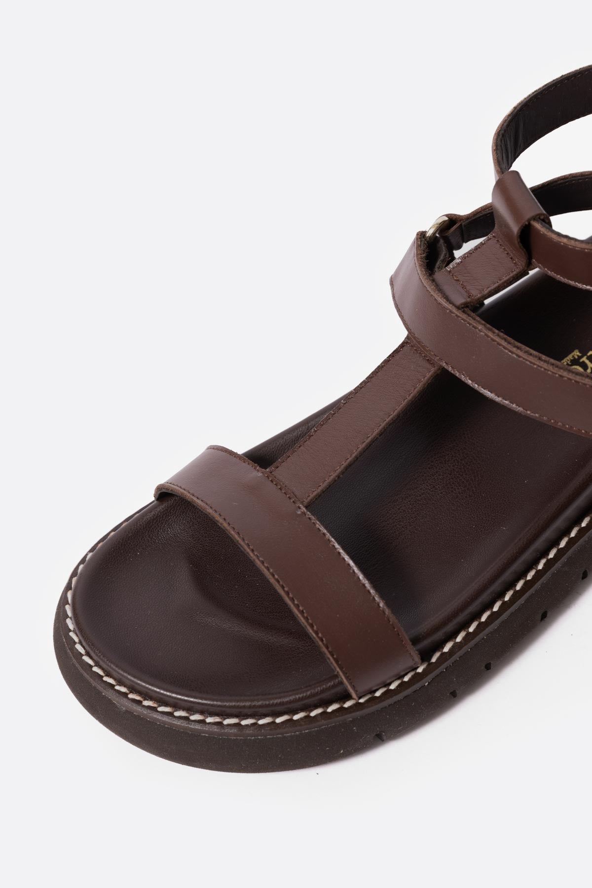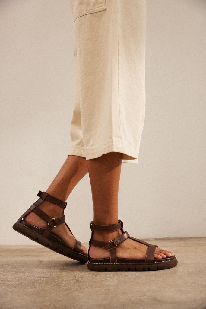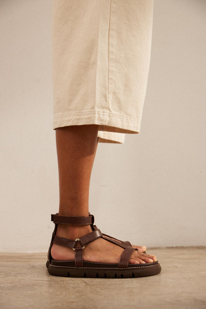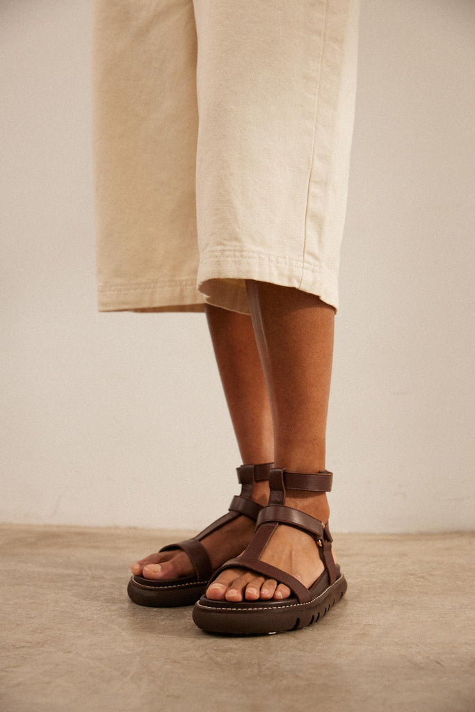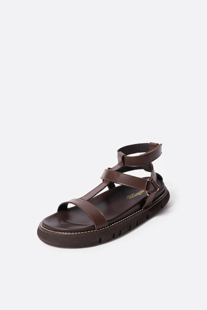 Sandalia plana con plataforma en piel marron chocolate