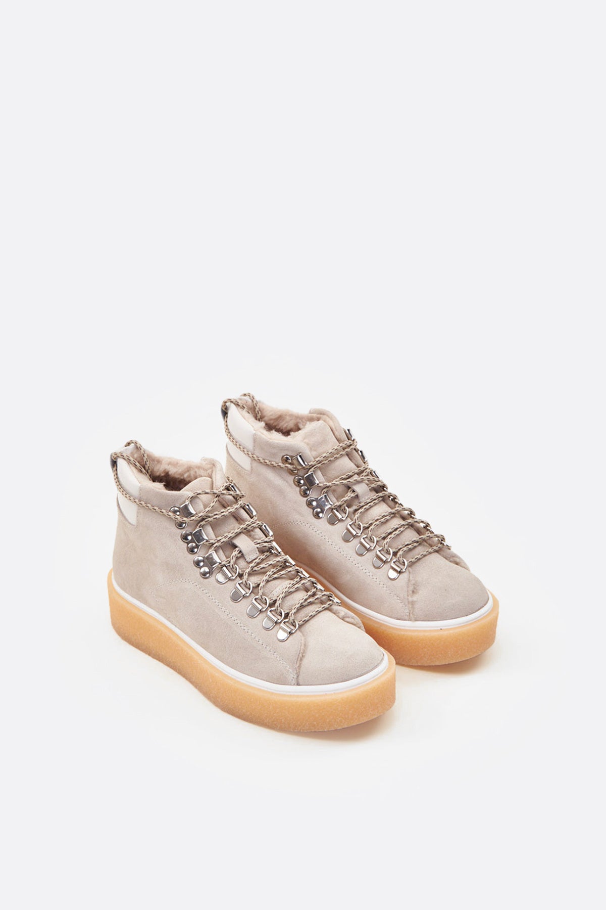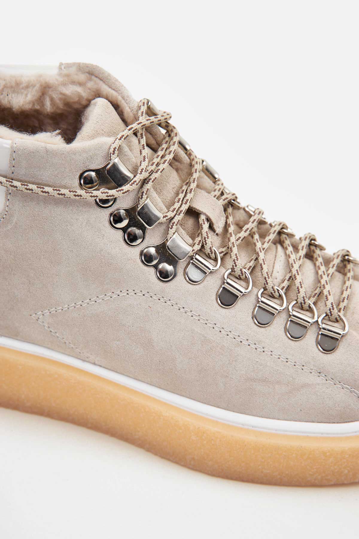 Les baskets Marianne Bota sont synonymes de qualité et de style intemporel. Elles sont fabriquées localement avec une sélection méticuleuse de matériaux pour garantir leur durabilité. Ces baskets sont la version haute en peau de mouton des baskets Marianne. Elles rappellent les chaussures de randonnée avec des détails à lacets. Elles ont un bout arrondi, une tige qui monte jusqu'à la cheville et une plateforme de 4 cm.