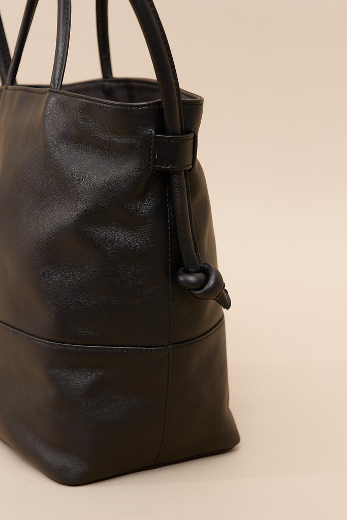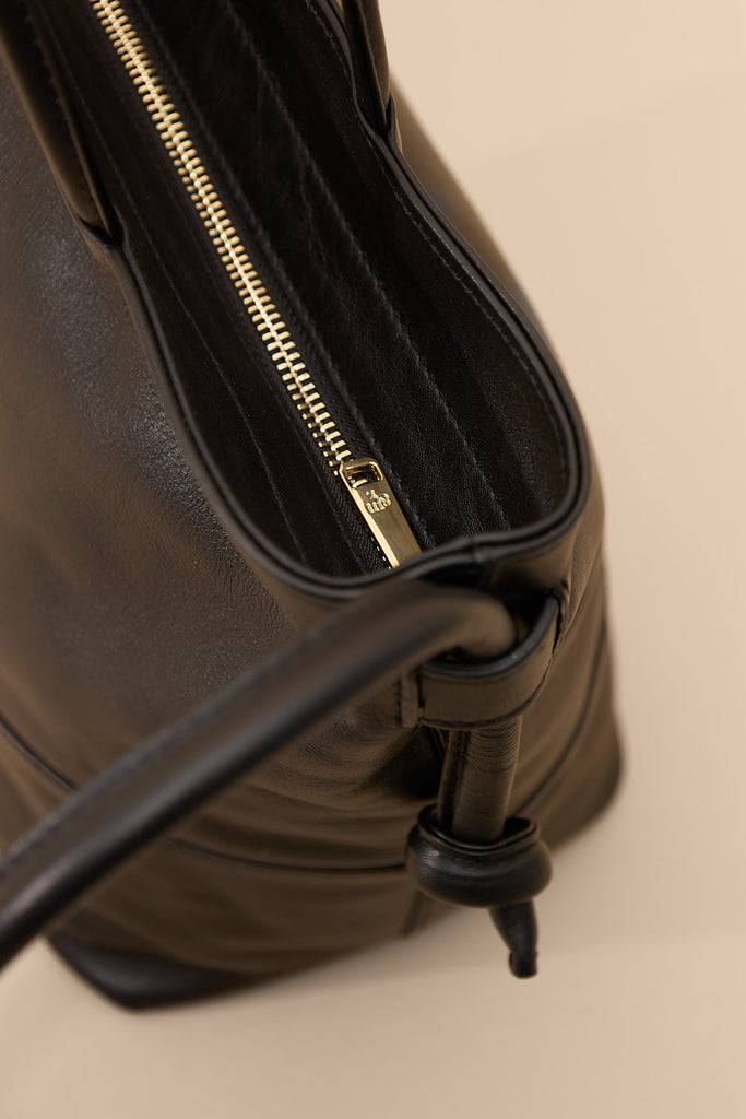 Ce sac à main pensé dans un style minimaliste est l'incarnation même du less is more. Toute la subtilité de ce modèle réside dans ses détails : des coutures décoratives, des surpiqûres ton sur ton, une longue anse ajustable délicatement nouée de chaque côté, une poignée et une fermeture Éclair dorée. À l'intérieur, une doublure en lin et une pochette. Sa partie inférieure, plus rigide, lui permet de toujours maintenir une forme parfaite. Dimensions : 24 cm x 17 cm x 28 cm.
