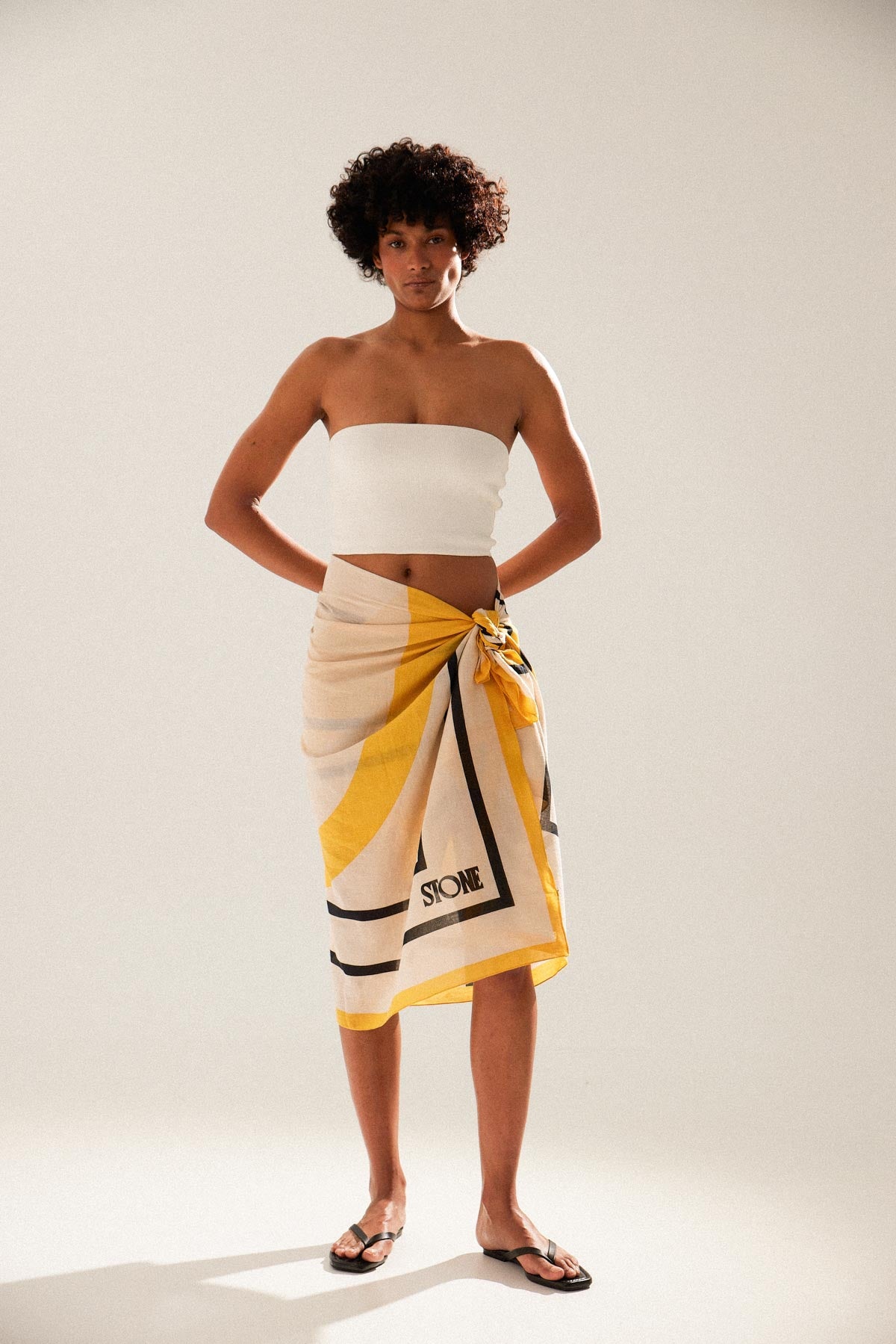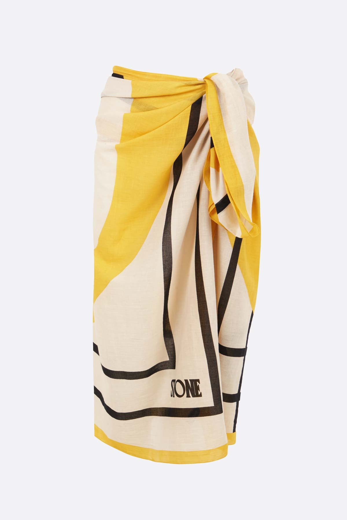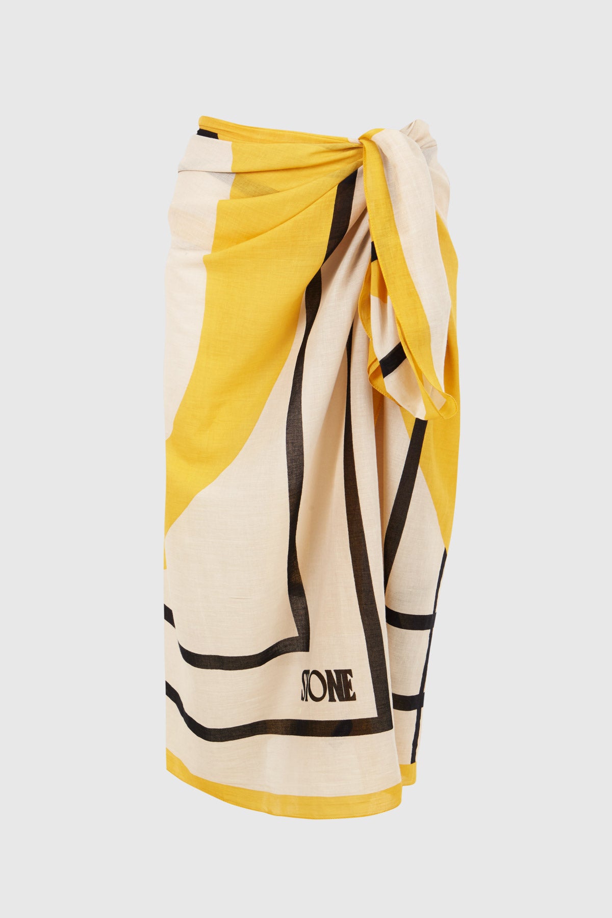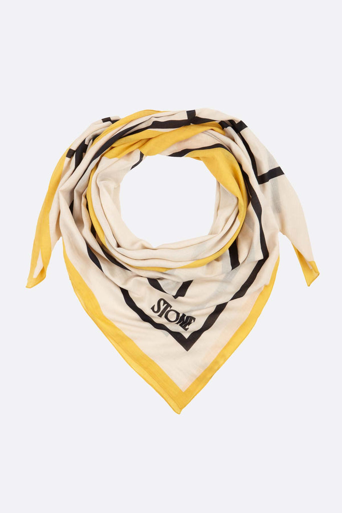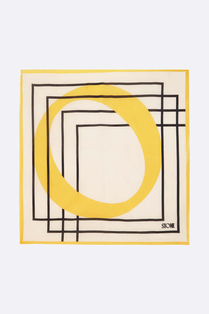 Son design : fond écru avec des carrés noirs et des détails jaunes, ainsi que ses dimensions de 1,33x1,40, en font le complément idéal pour vos sorties à la plage ou comme foulard lors de vos voyages.