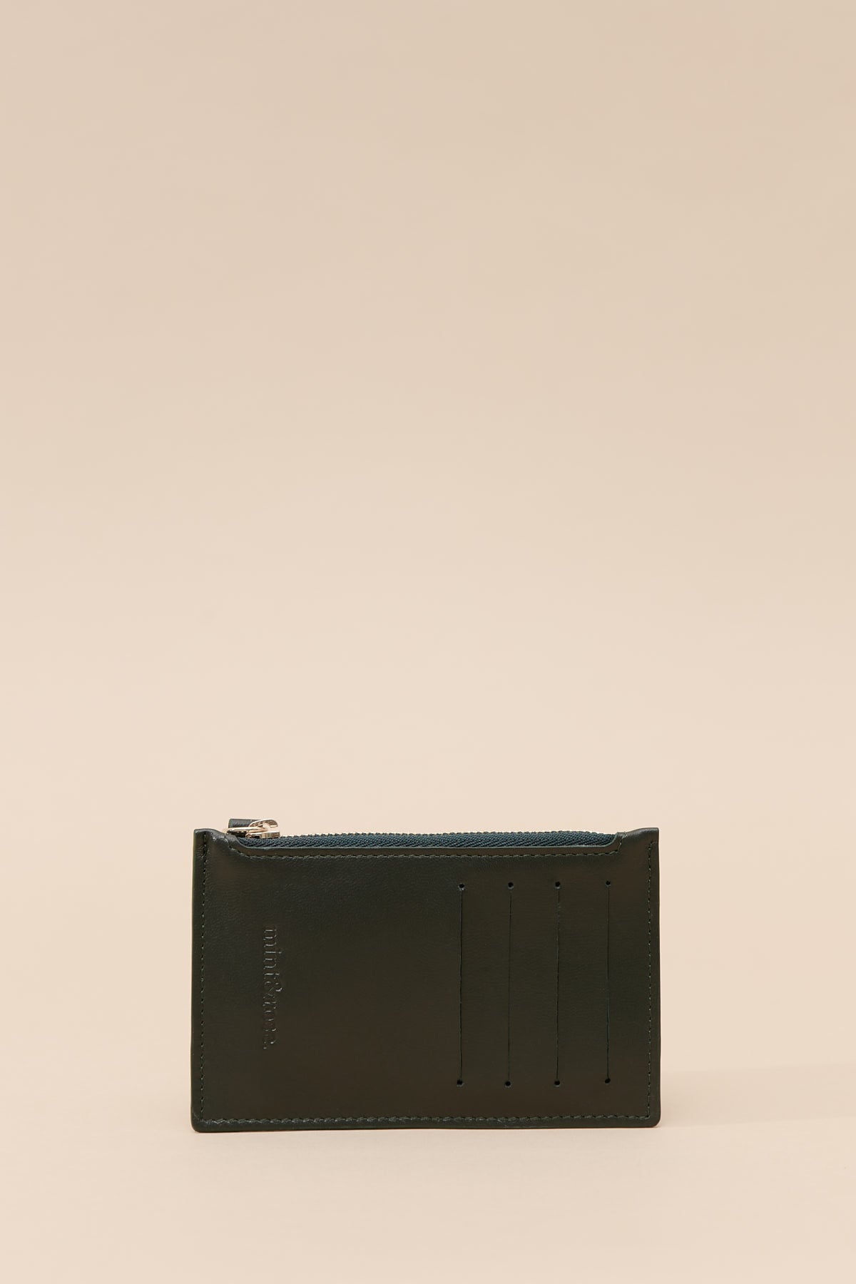 Tarjetero de piel resistente, cuenta con cuatro compartimentos para tarjetas y bolsillo con cierre en cremallera dorada. Lujados laterales al tono y logo grabado a fuego. Interior con refuerzo textil.