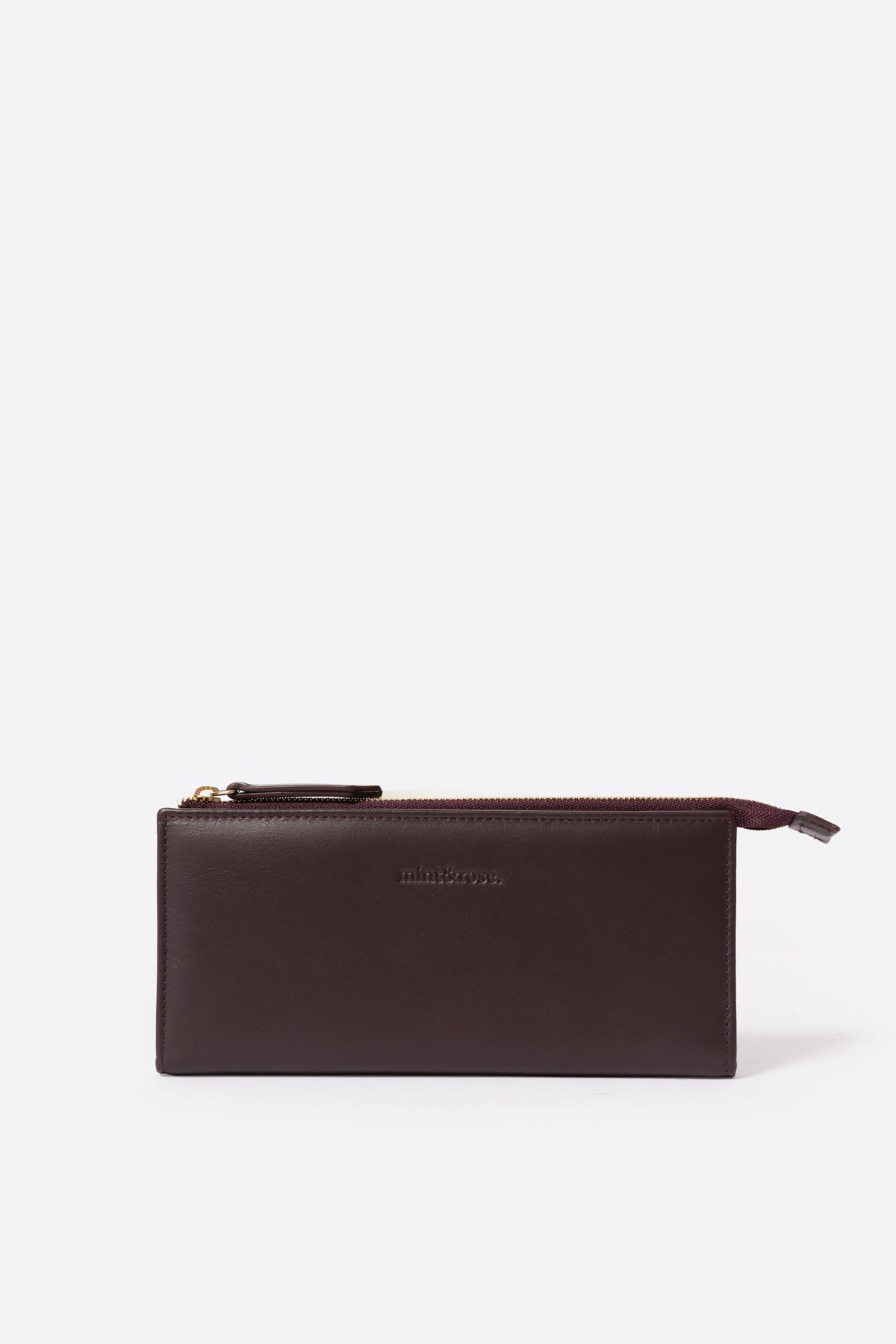 Pochette en cuir résistant, double poche avec fermetures éclair dorées. Poignées et fermetures éclair latérales ton sur ton et logo gravé au feu. Dimensions : 12,5 x 17,5 cm.
