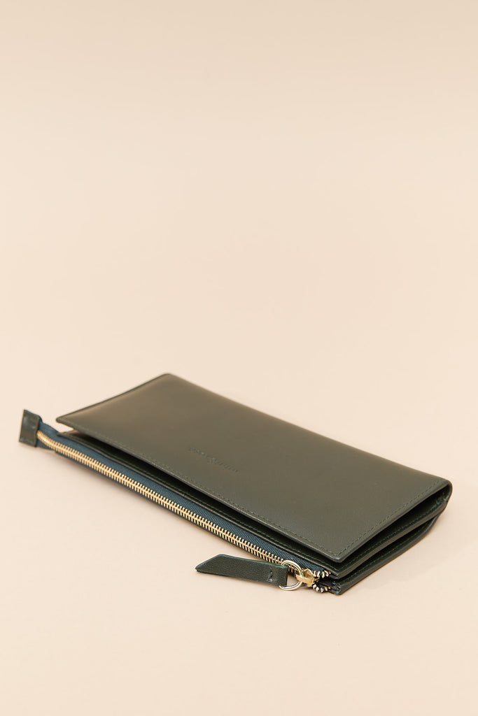 Hecha por artesanos españoles, siguiendo técnicas de tradición centenaria. Cartera de piel resistente, doble bolsillo con cremalleras doradas. Tiene varios compartimentos para tarjetas. Tiradores y lujados laterales al tono y logo grabado a fuego. Medidas: 12,5 x 17,5 cm.