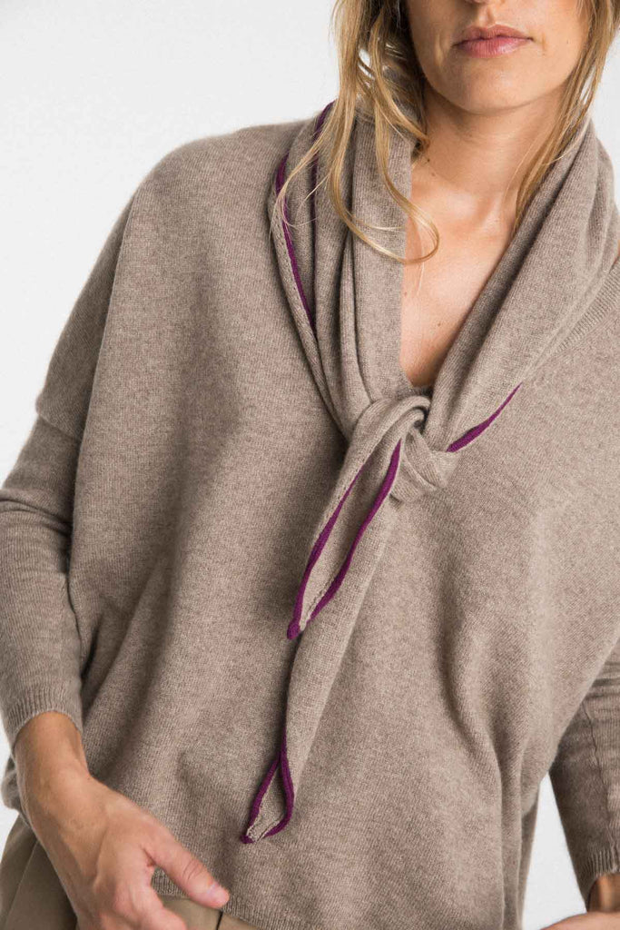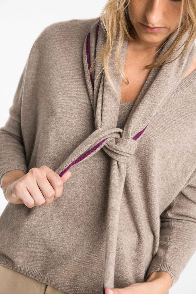 Lo que más nos gusta: sentir su suavidad en el cuello y su color beige con el borde morado.