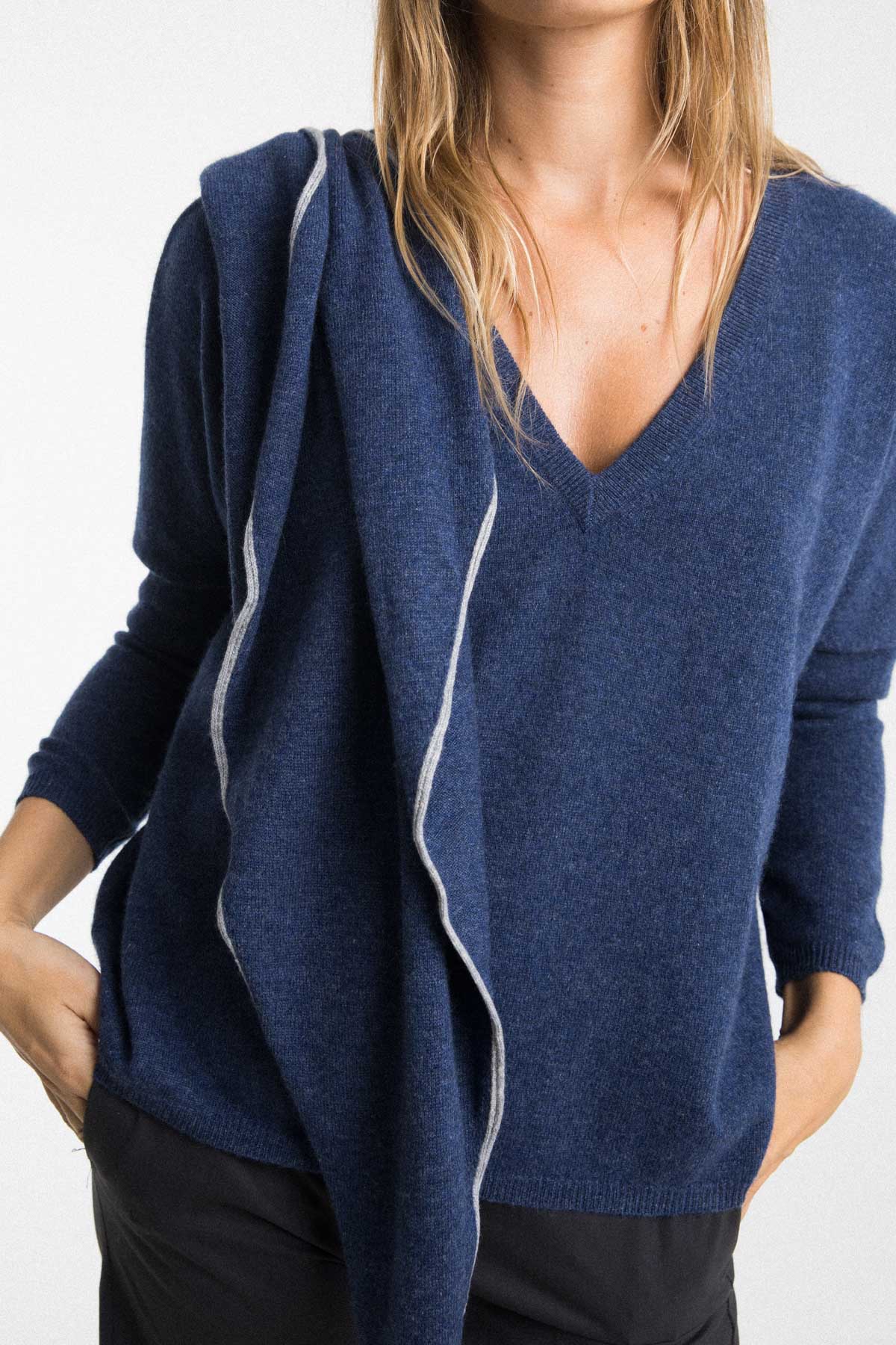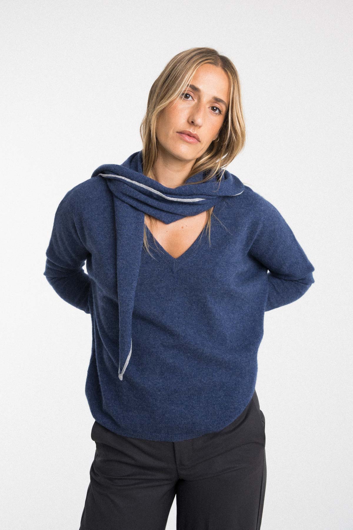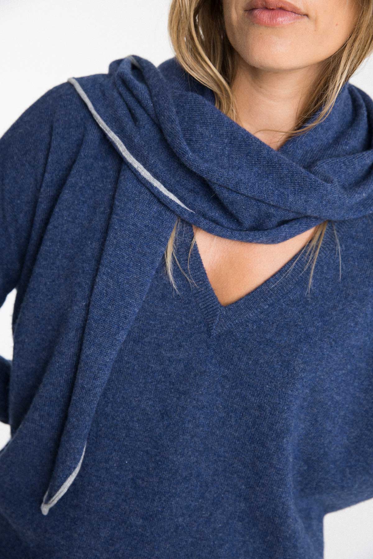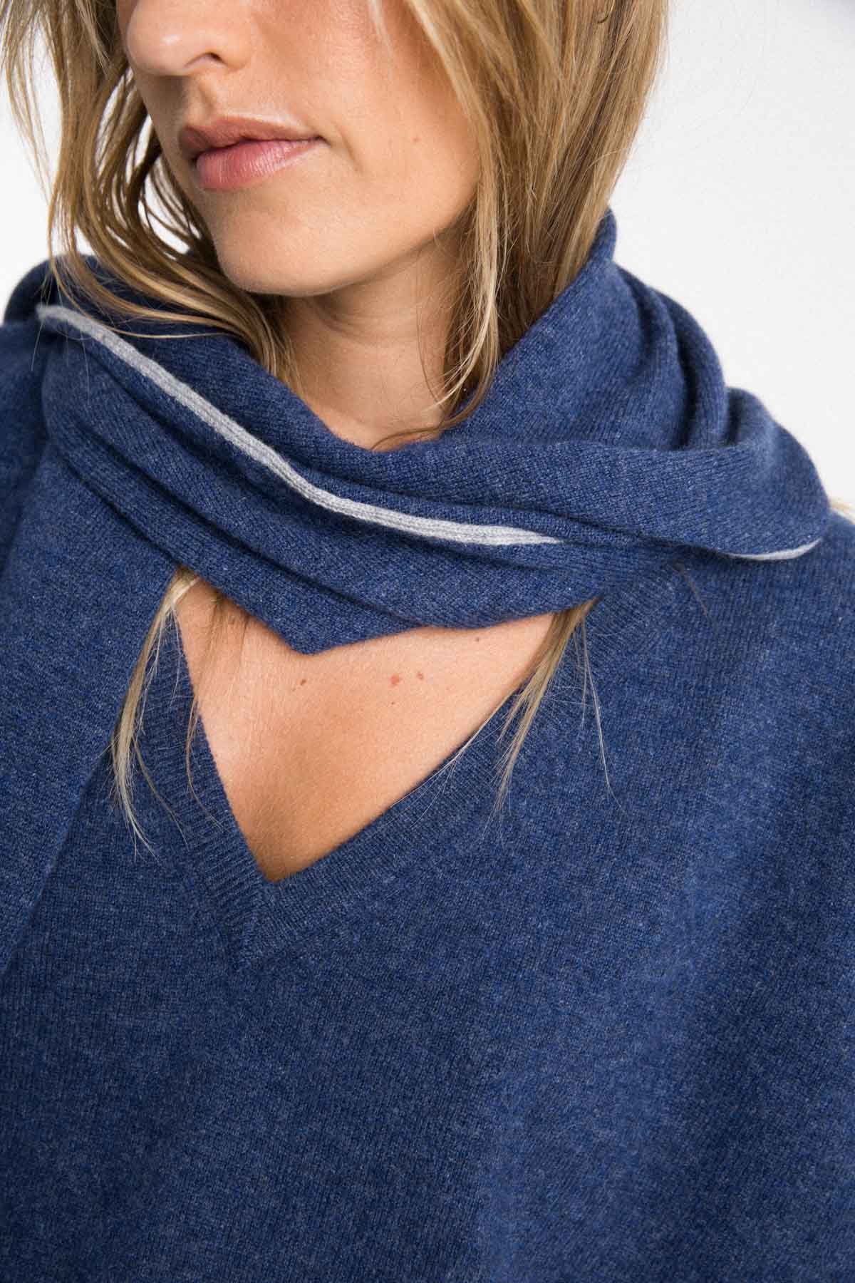 Lo que más nos gusta: sentir su suavidad en el cuello y su color azul jaspeado con el borde gris.