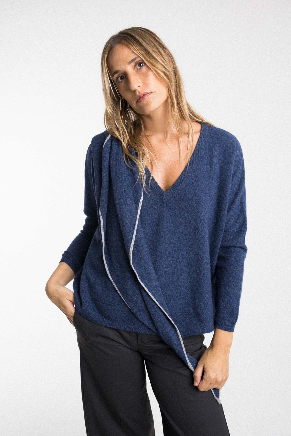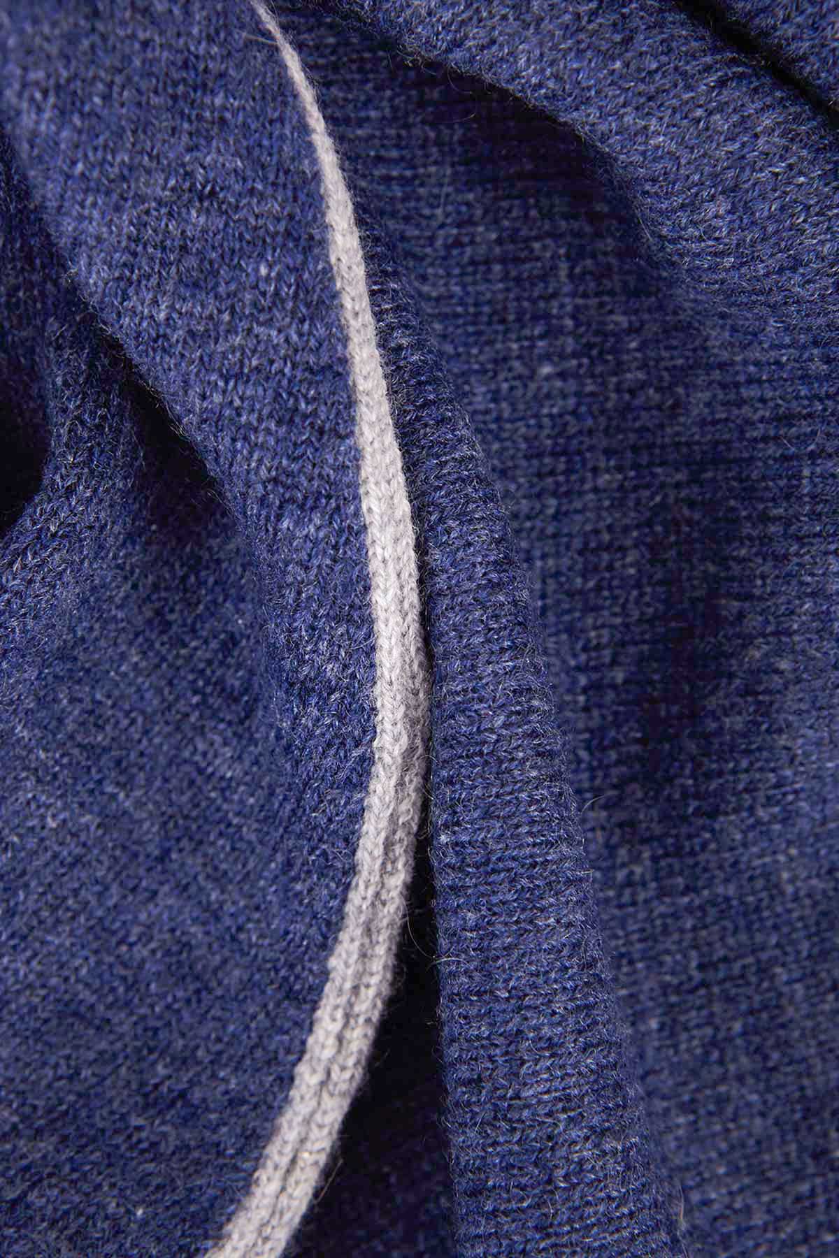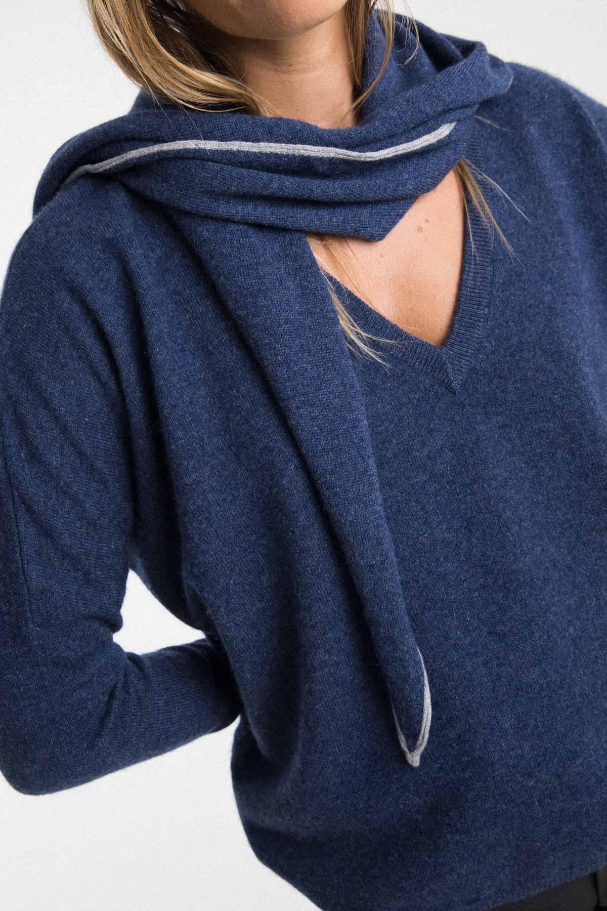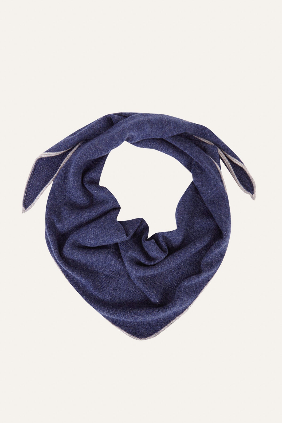 Lo que más nos gusta: sentir su suavidad en el cuello y su color azul jaspeado con el borde gris.