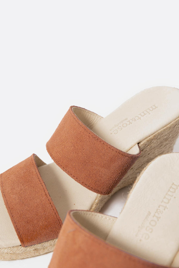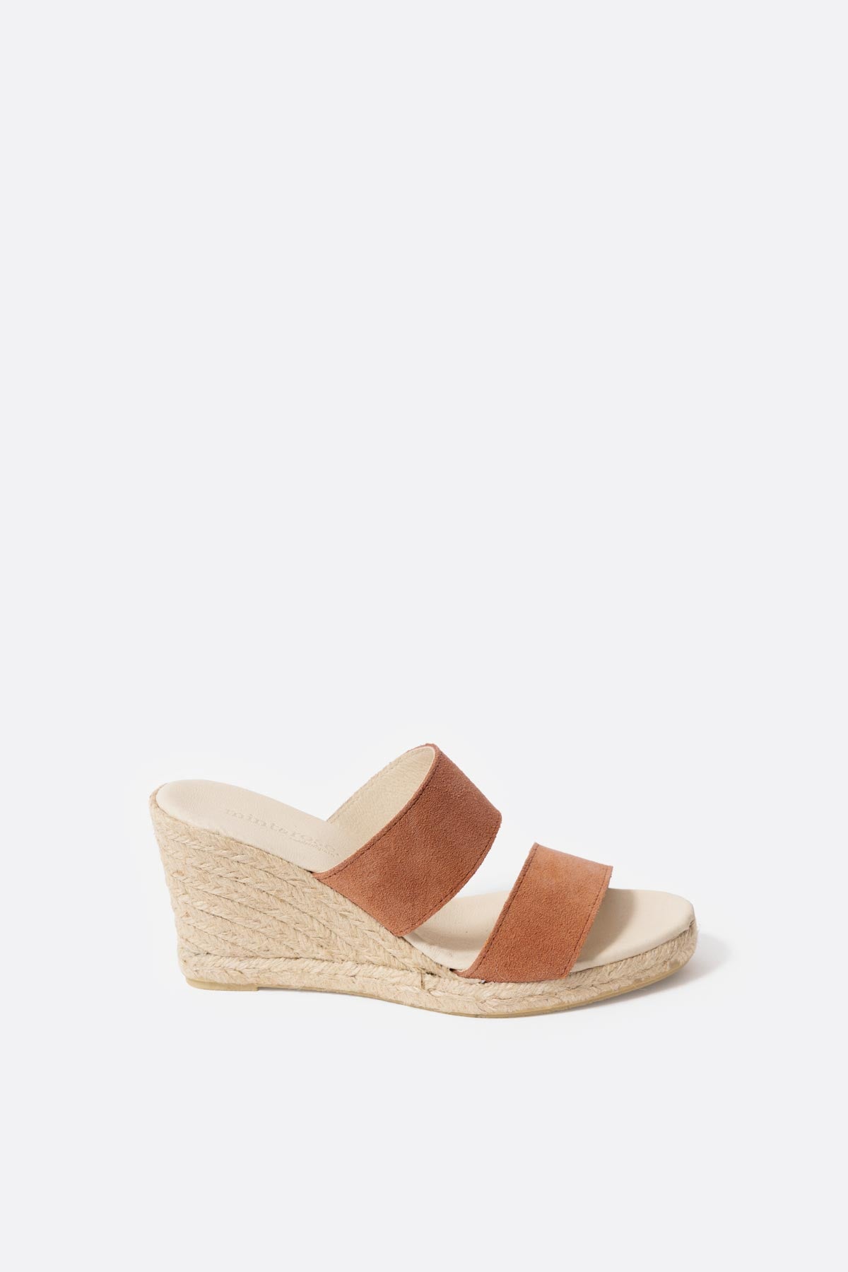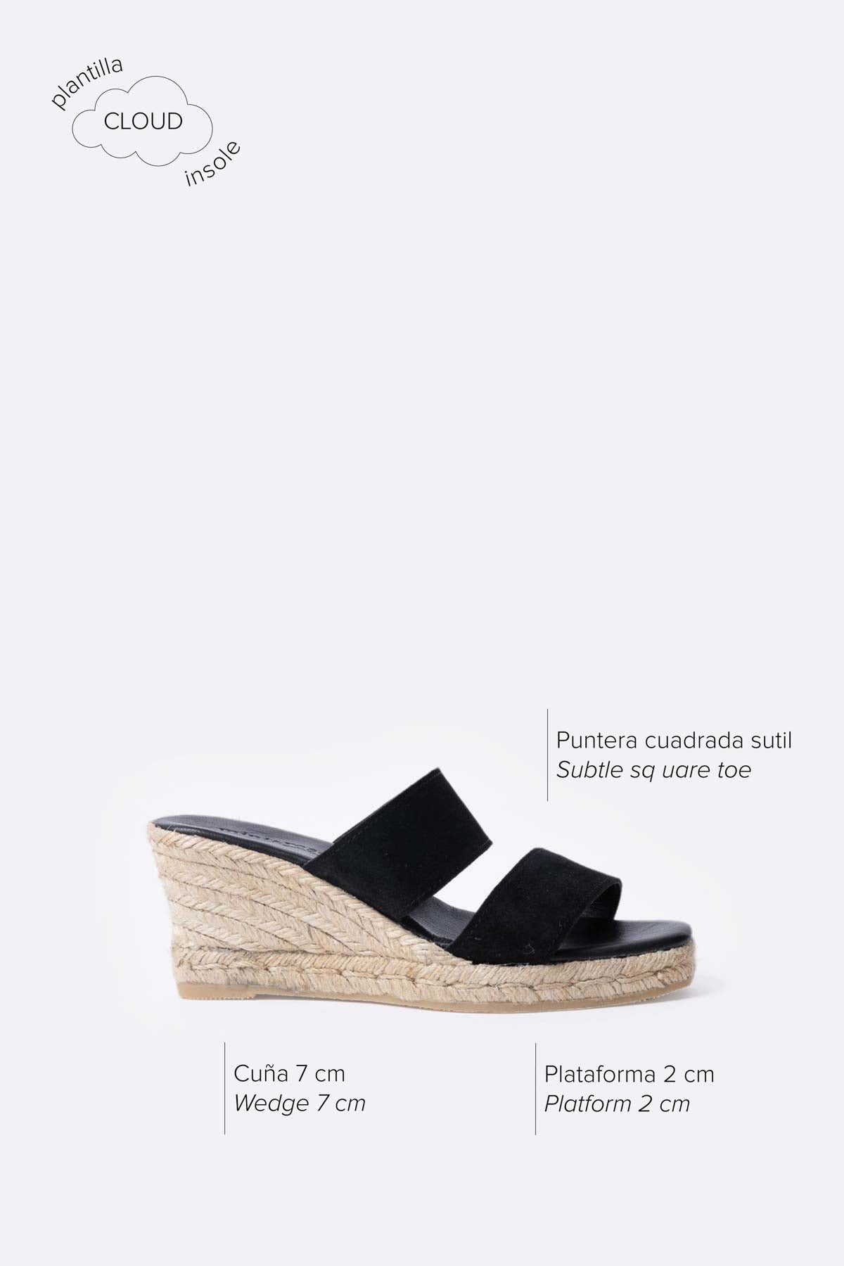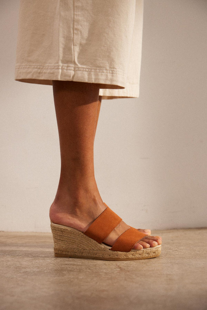 Diseño mediterráneo, producción artesanal y materiales cuidadosamente seleccionados se unen para dar lugar a las alpargatas Emma. Están hechas con dos tiras de piel súper suave que se ajustan perfectamente al pie. La altura de la cuña es de 7 cm aproximadamente y la plataforma 2 cm. Exterior de ante e interior y planta de piel. Tiene plataforma de yute y suela de goma.