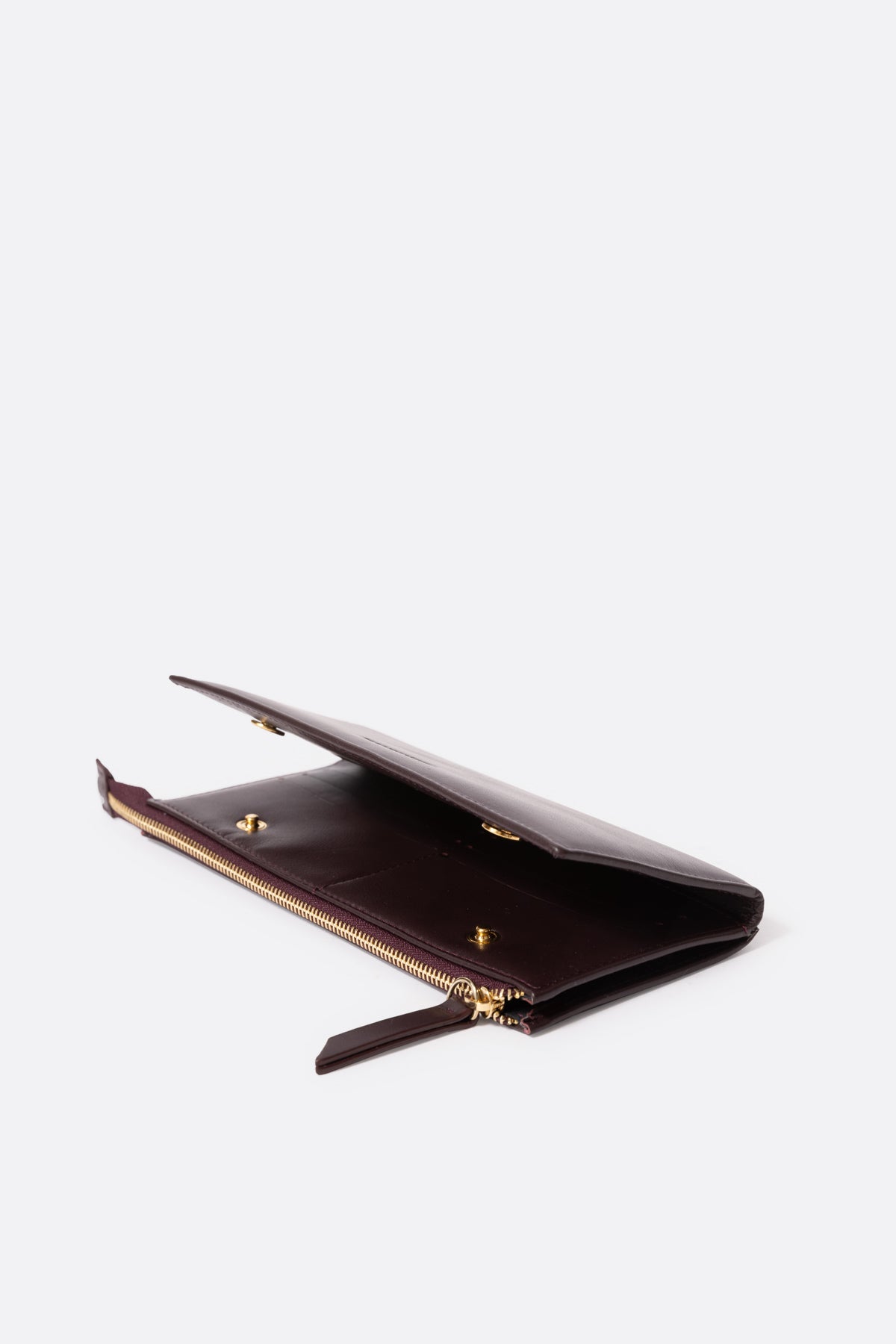 Cartera de piel resistente, doble bolsillo con cremalleras doradas. Tiradores y lujados laterales al tono y logo grabado a fuego. Medidas: 12,5 x 17,5 cm.