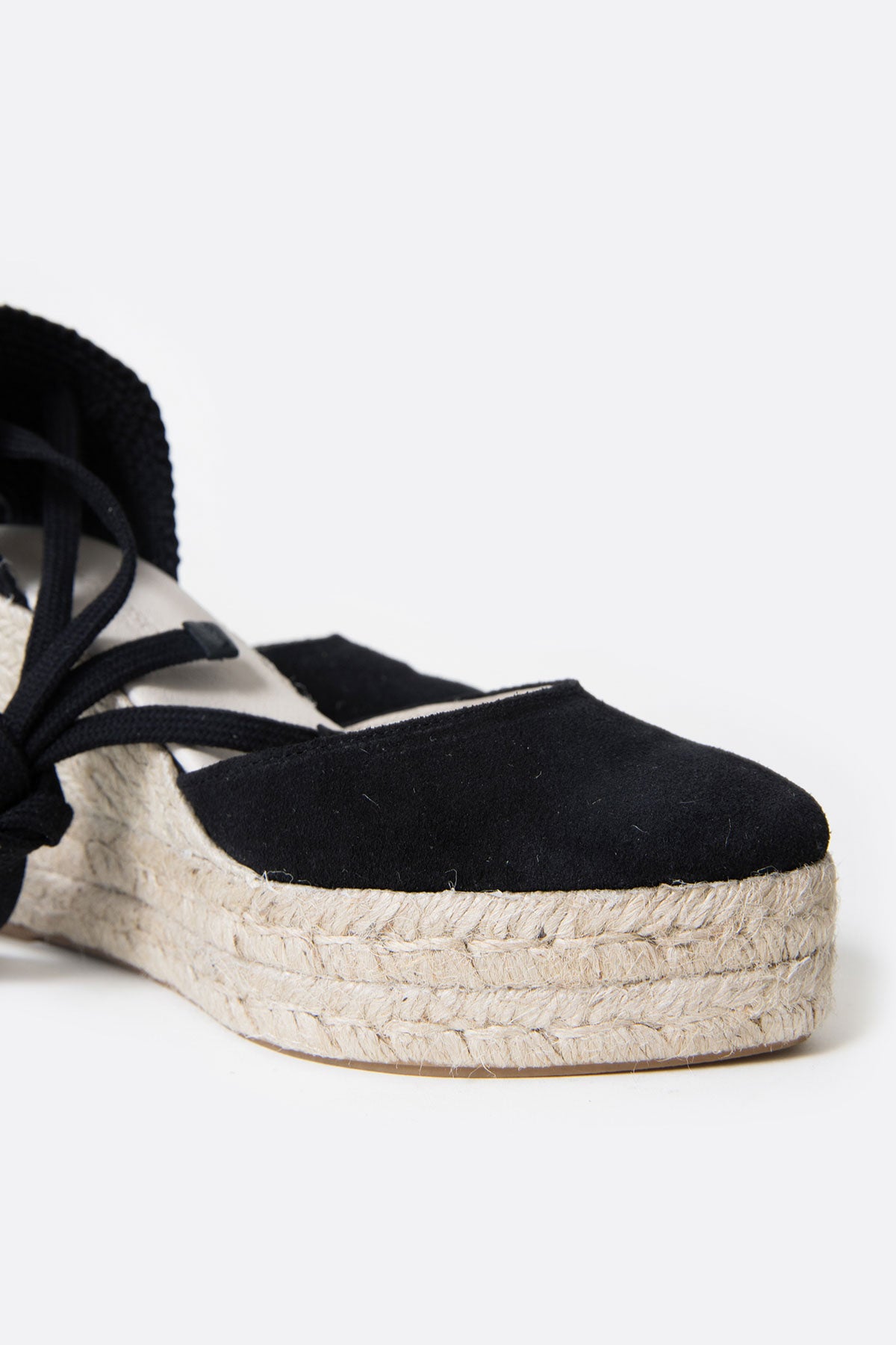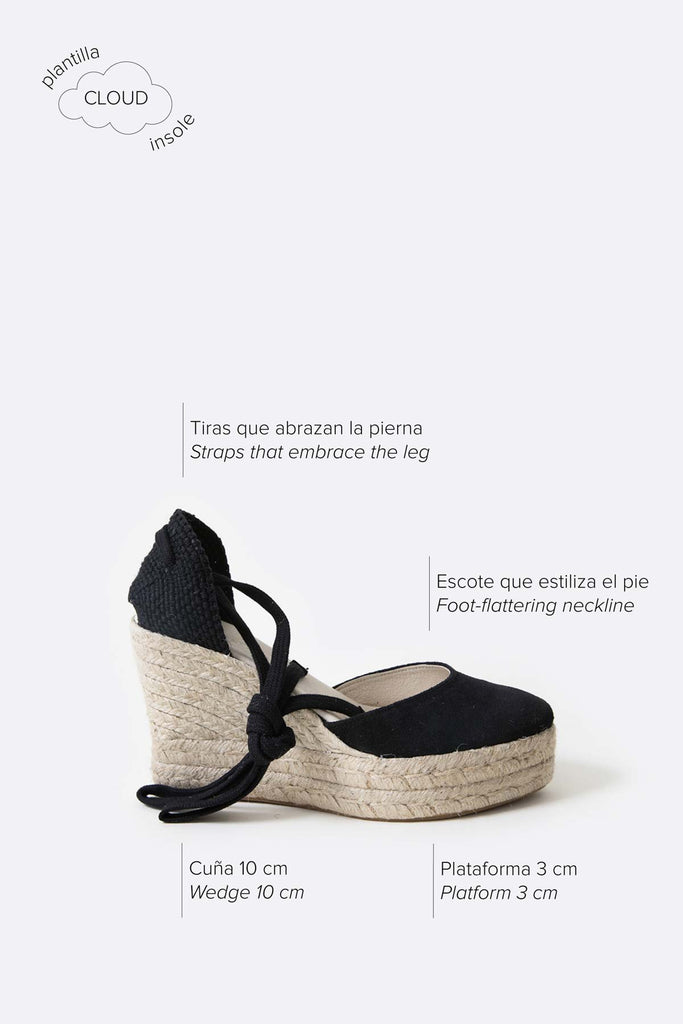 La altura de la cuña es de 10 cm aproximadamente (incluyendo la medida de su plataforma de yute trenzado de 3 cm) y suela de goma.