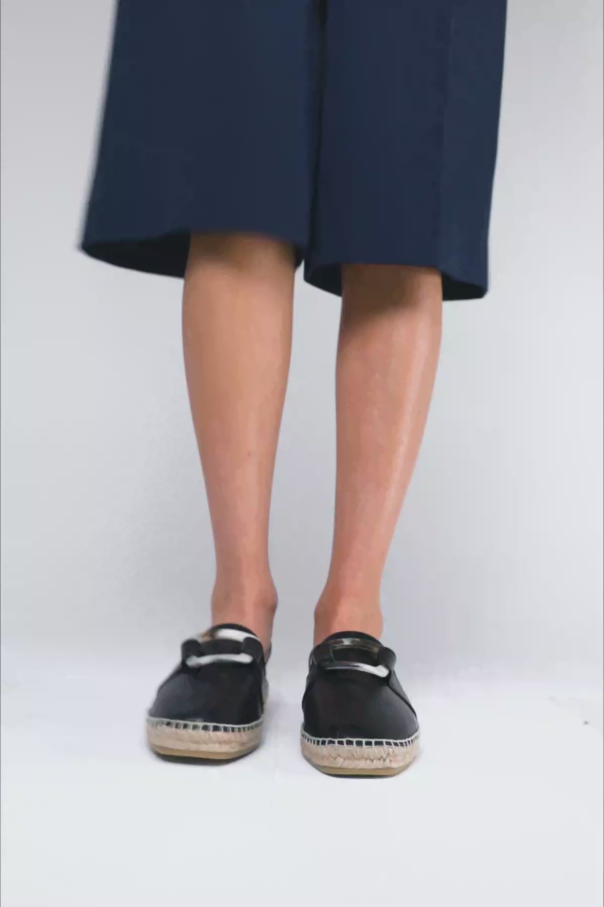 Su altura es de 1,4 cm. El exterior es de piel negra con una hebilla nacarada en el empeine, interior de piel beige y suela de goma con yute trenzado.