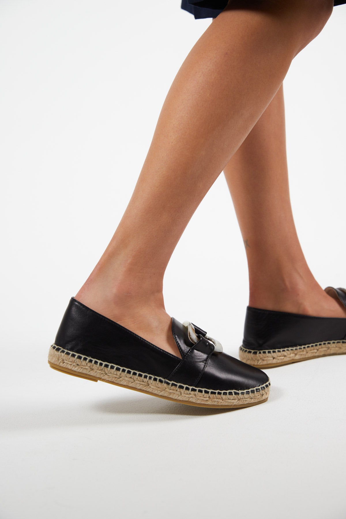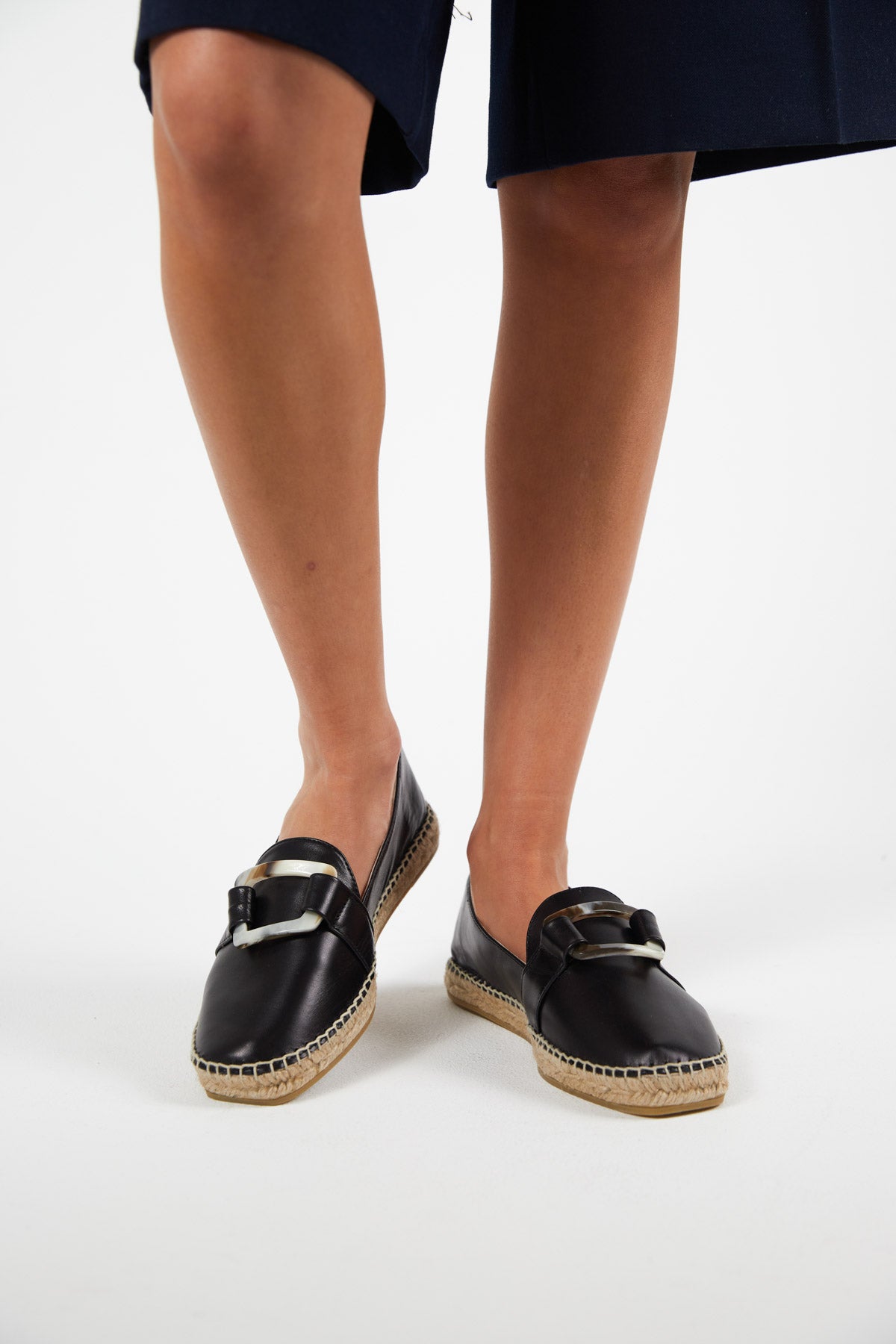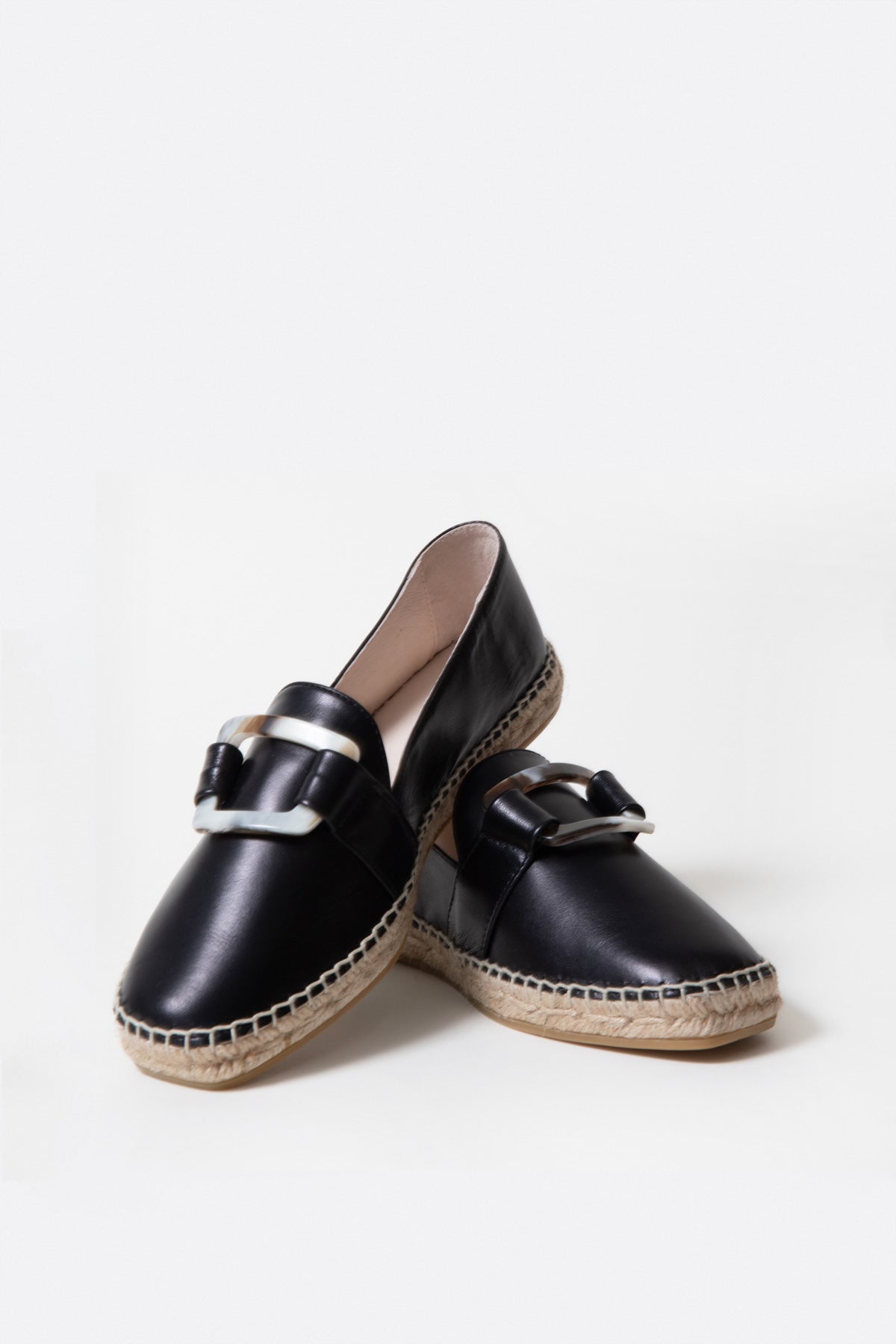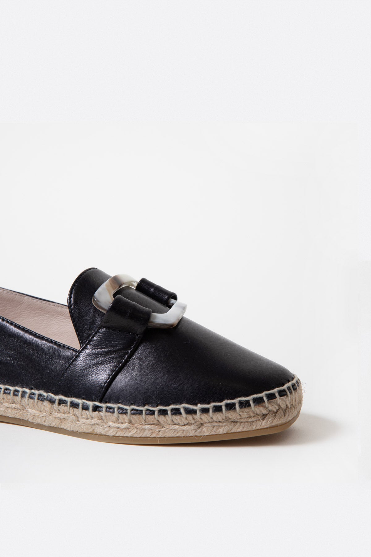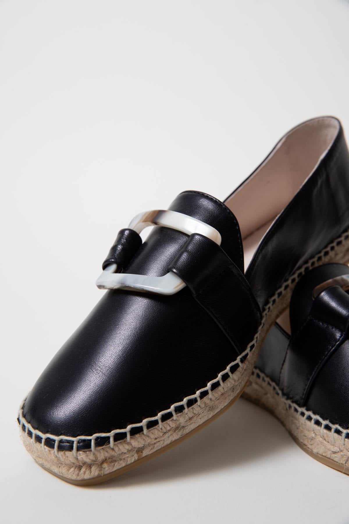 Alpargata mocasin plana en piel negro con hebilla efecto marmol