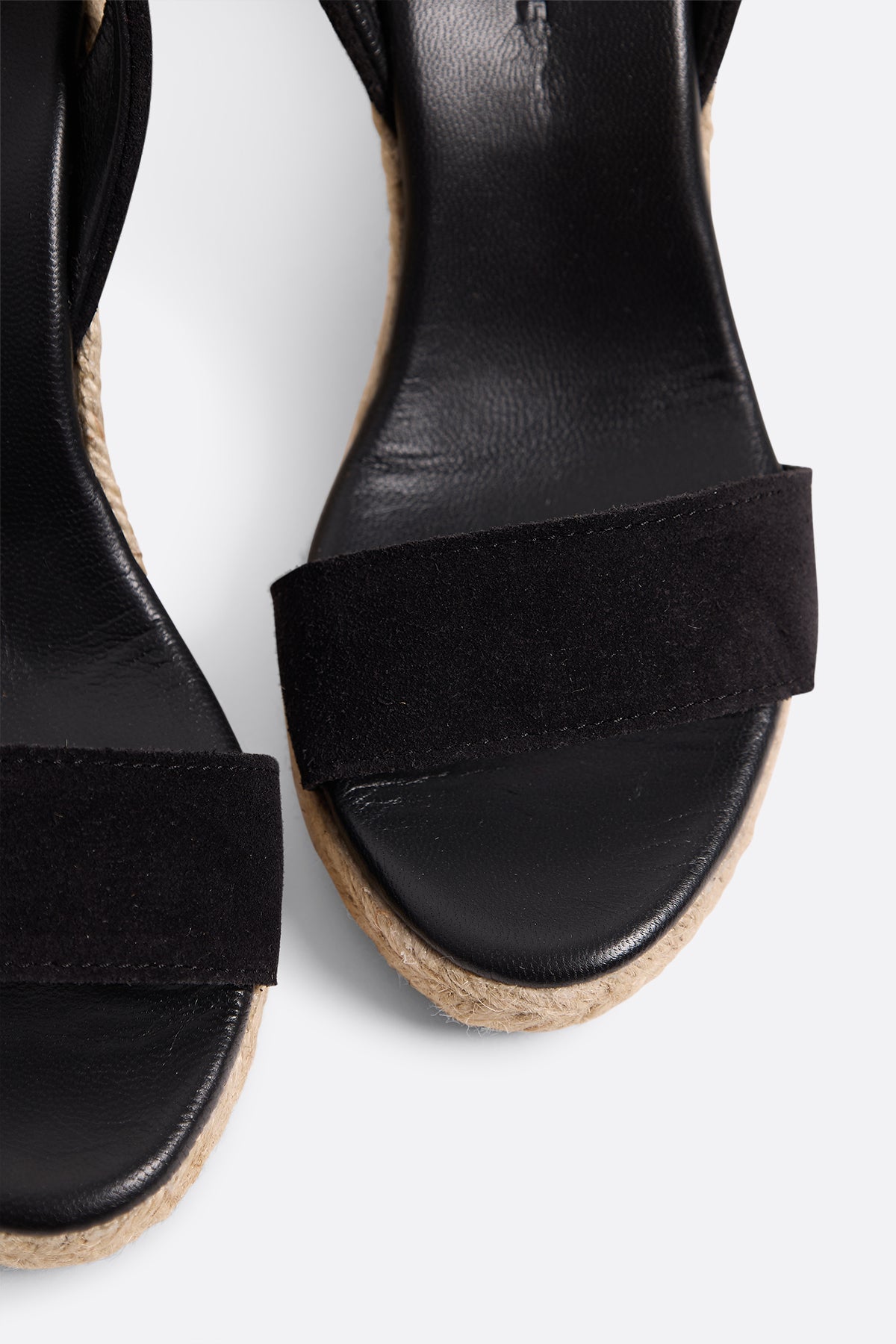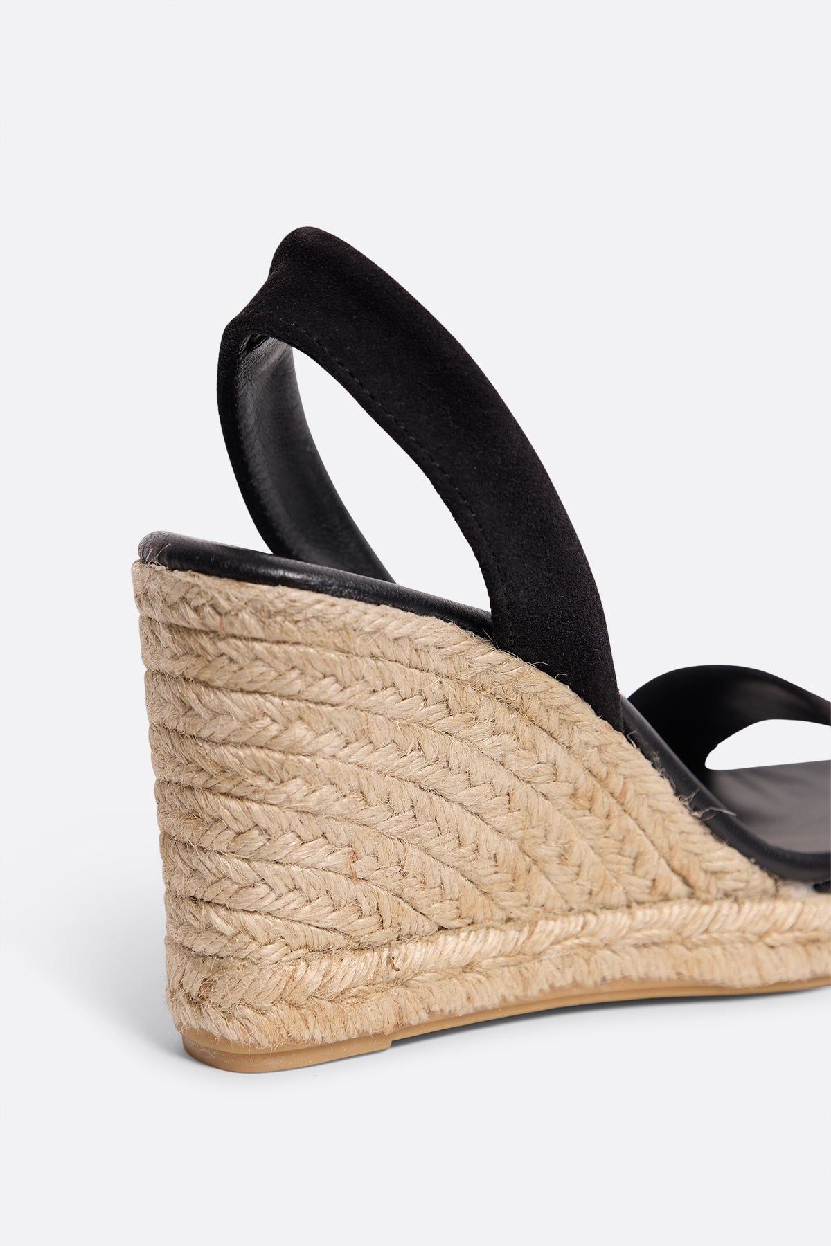 De estilo minimalista, tienen una tira ancha que sujeta el pie en la parte delantera y otra tira con goma en el talón, sujetando a la perfección y alargando ópticamente las piernas. Su cuña mide 9,5 cm.