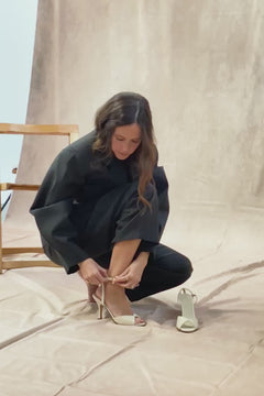 Jacqueline son unas sandalias atemporales con diseño de inspiración retro. Tienen una pulsera súper fina para sujetar el tobillo alargando la pierna, tacón estrecho de 9 cm en forma de campana para mayor estabilidad, planta acolchada con plantilla Cloud y parte delantera con escote en forma de lazo.