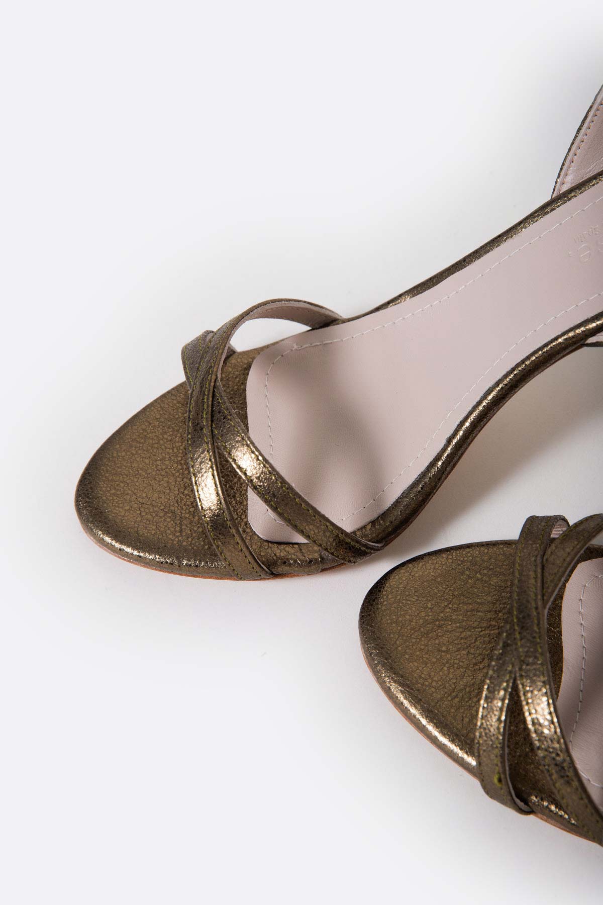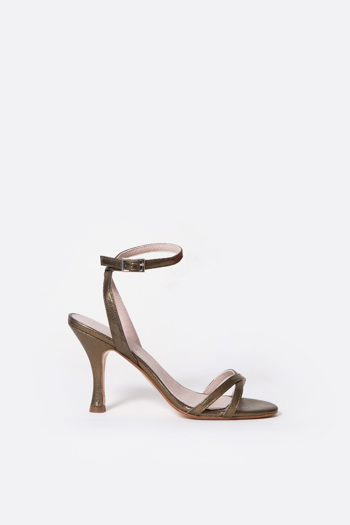 Tiene dos tiras delanteras cruzadas de piel que bordean el pie y lo estilizan. Complementa la sujección una fina tira de pulsera con cierre de hebilla. Tacón acampanado de 9 cm.