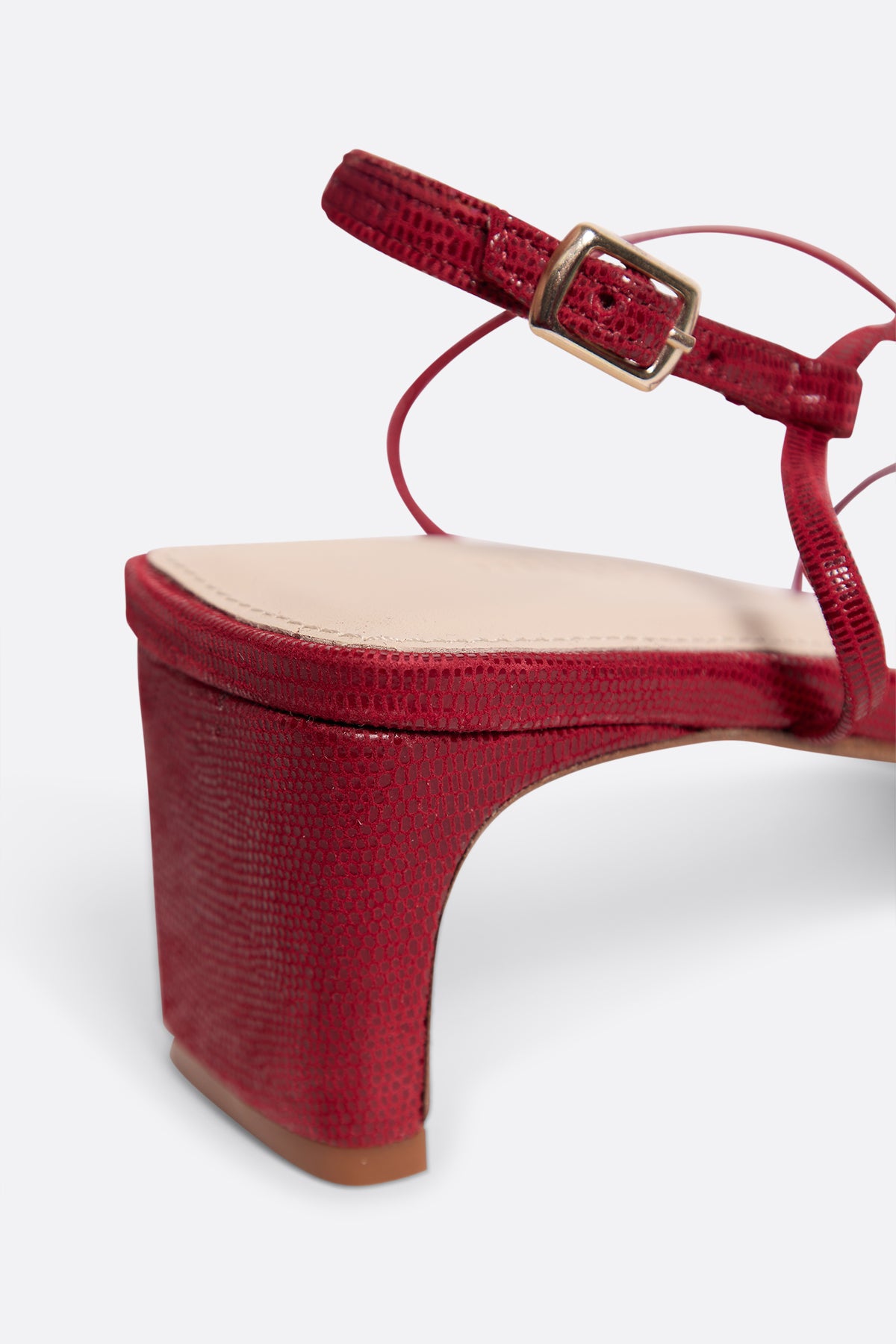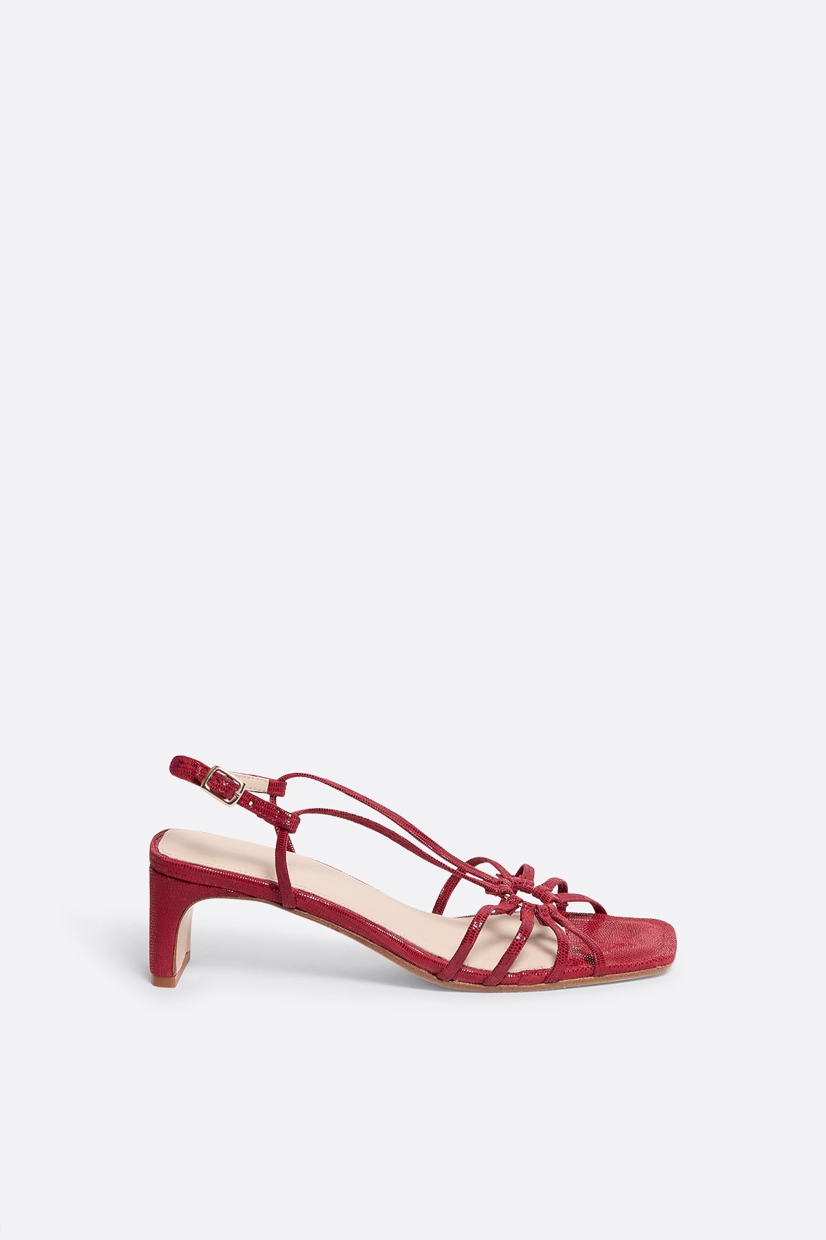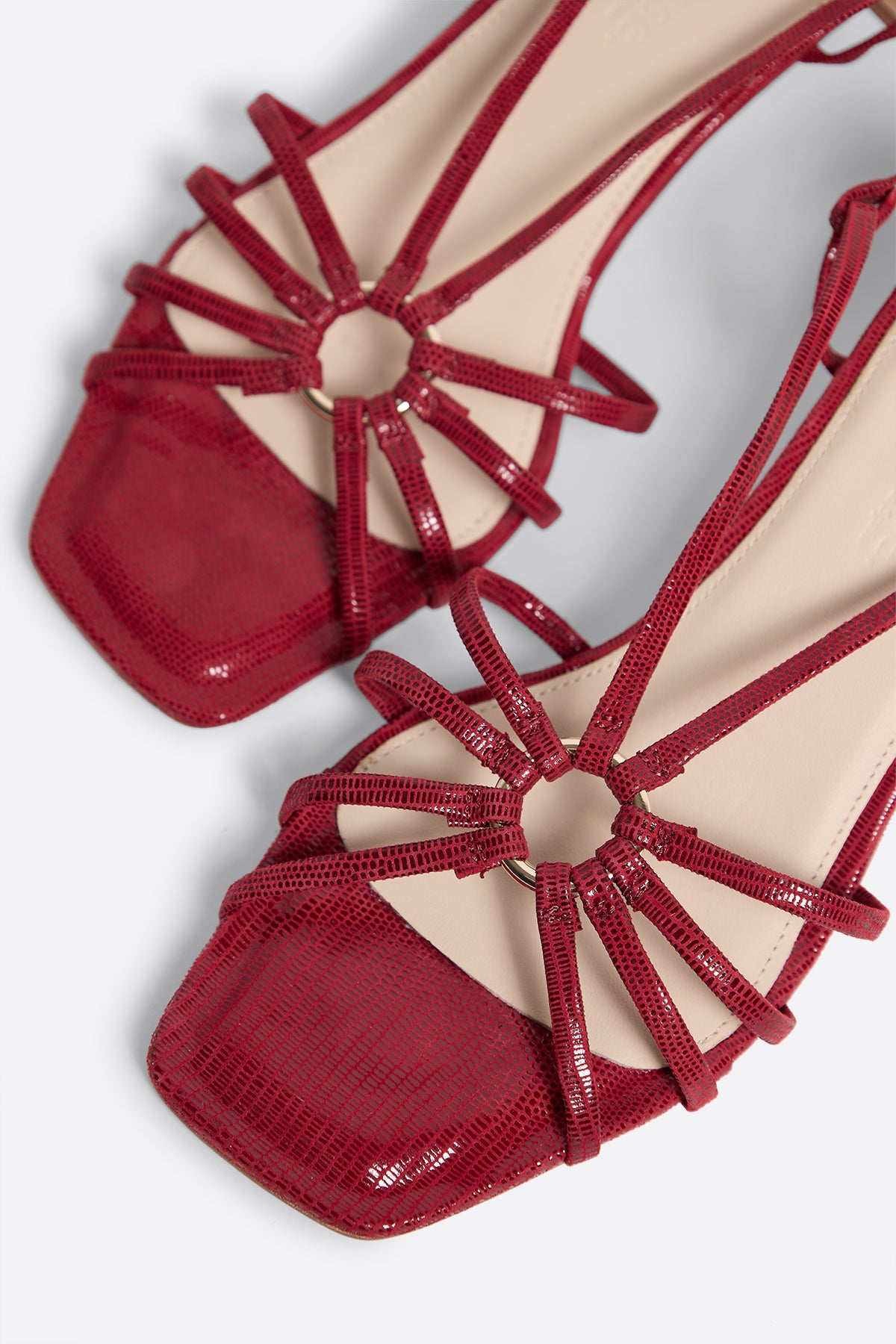 Sandalias de piel metalizada roja con tacón bajo