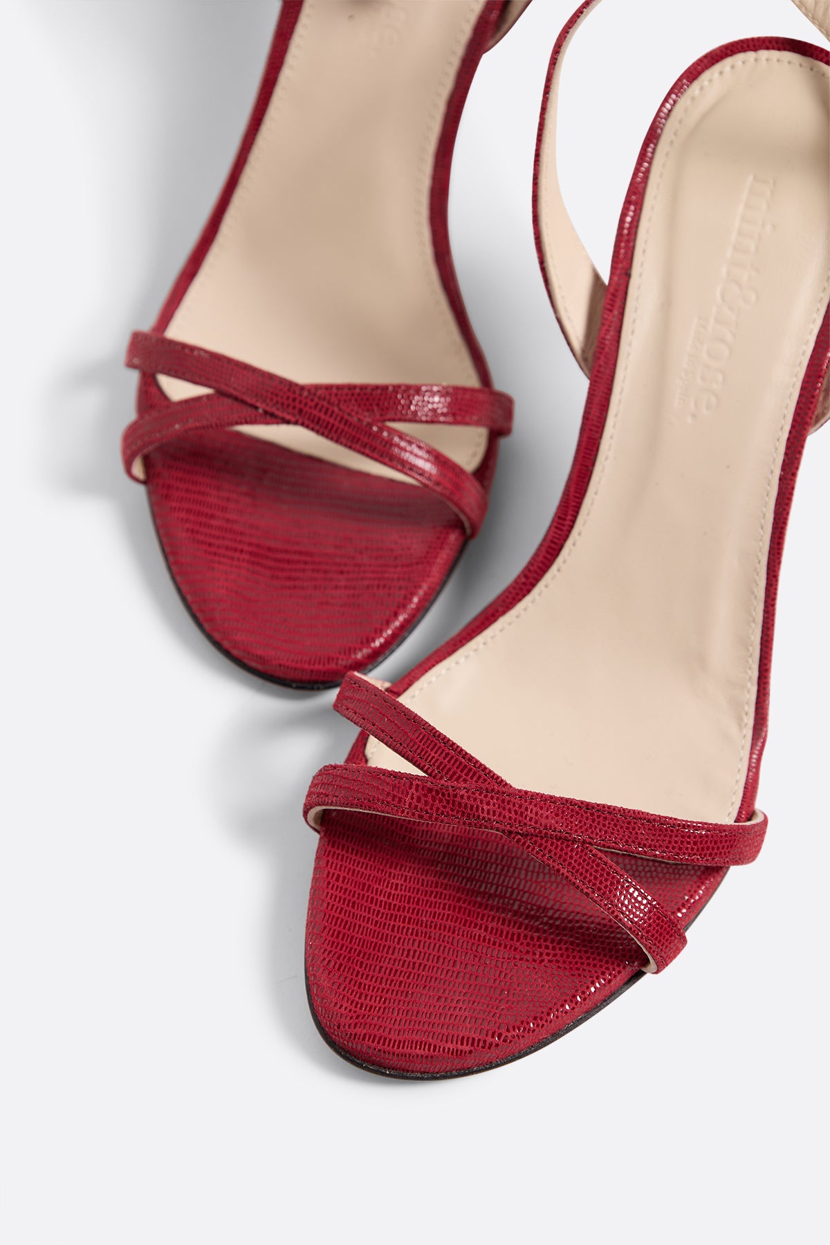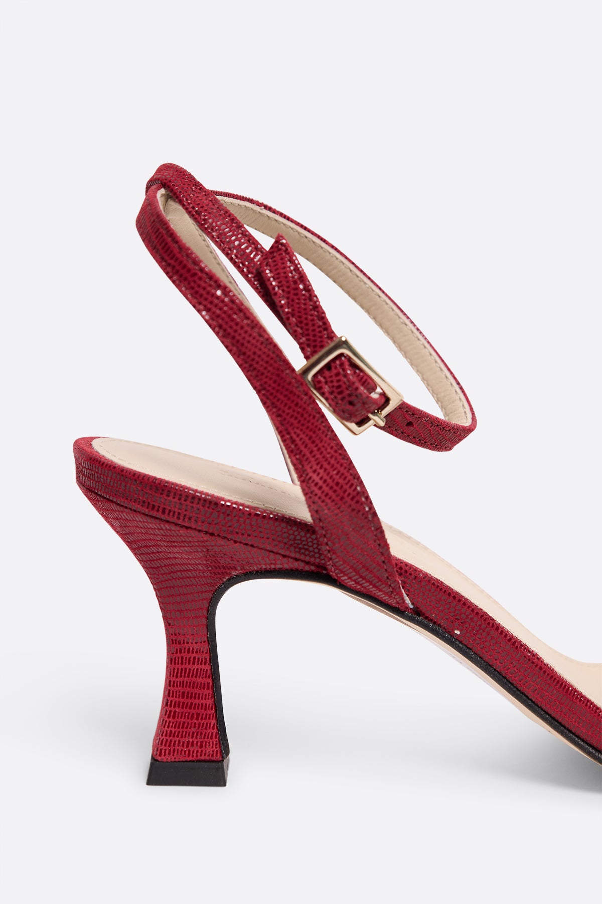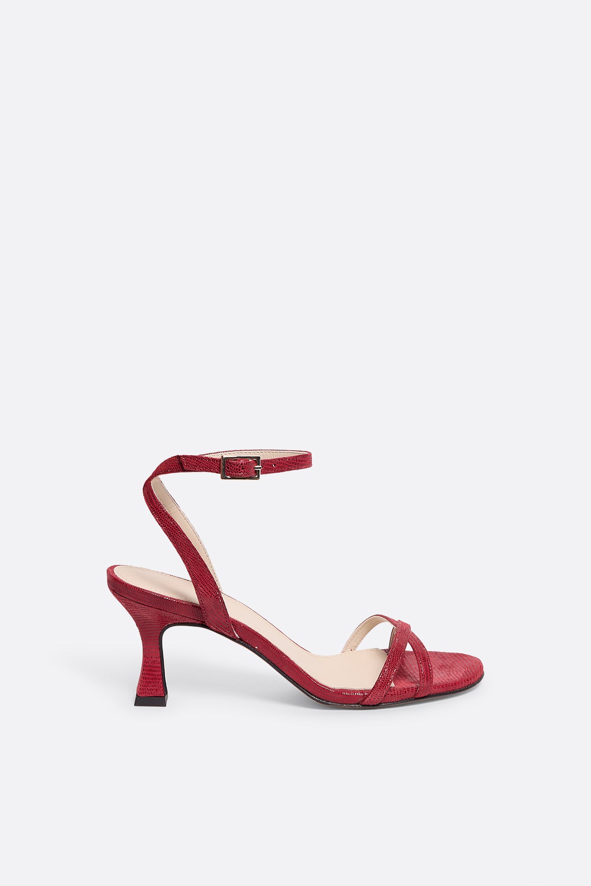 Tiene dos tiras delanteras cruzadas de piel que bordean el pie. Complementa la sujeción una fina tira de pulsera con cierre de hebilla. Tacón acampanado de 7 cm con plantilla Cloud acolchada para la máxima comodidad.