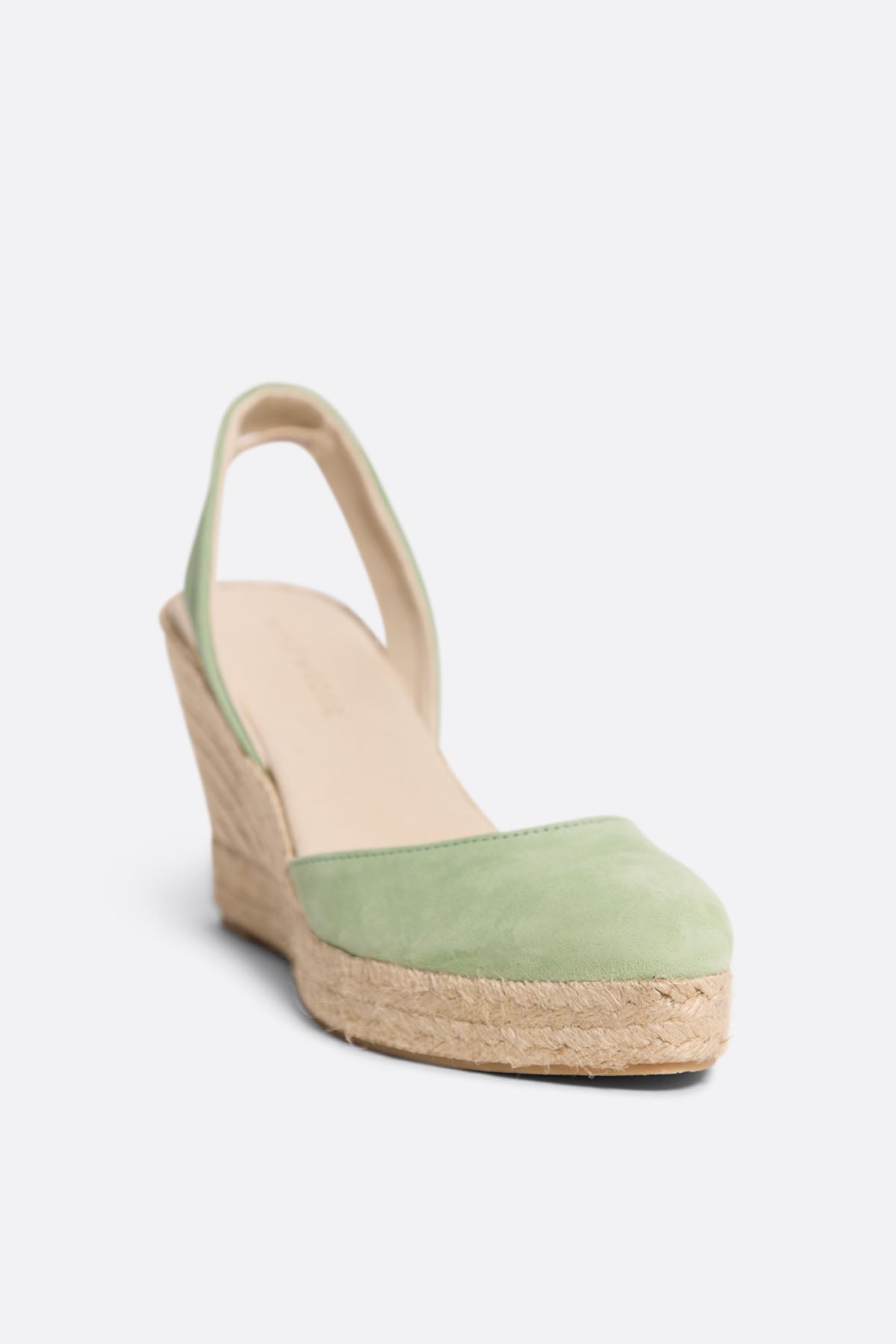 Lo que más nos gusta: la combinación del serraje verde claro con el yute.