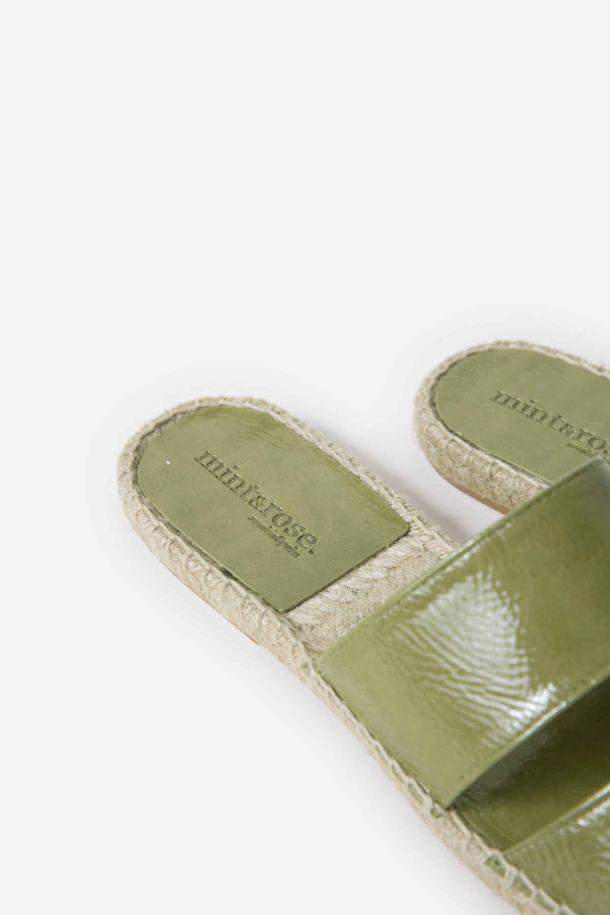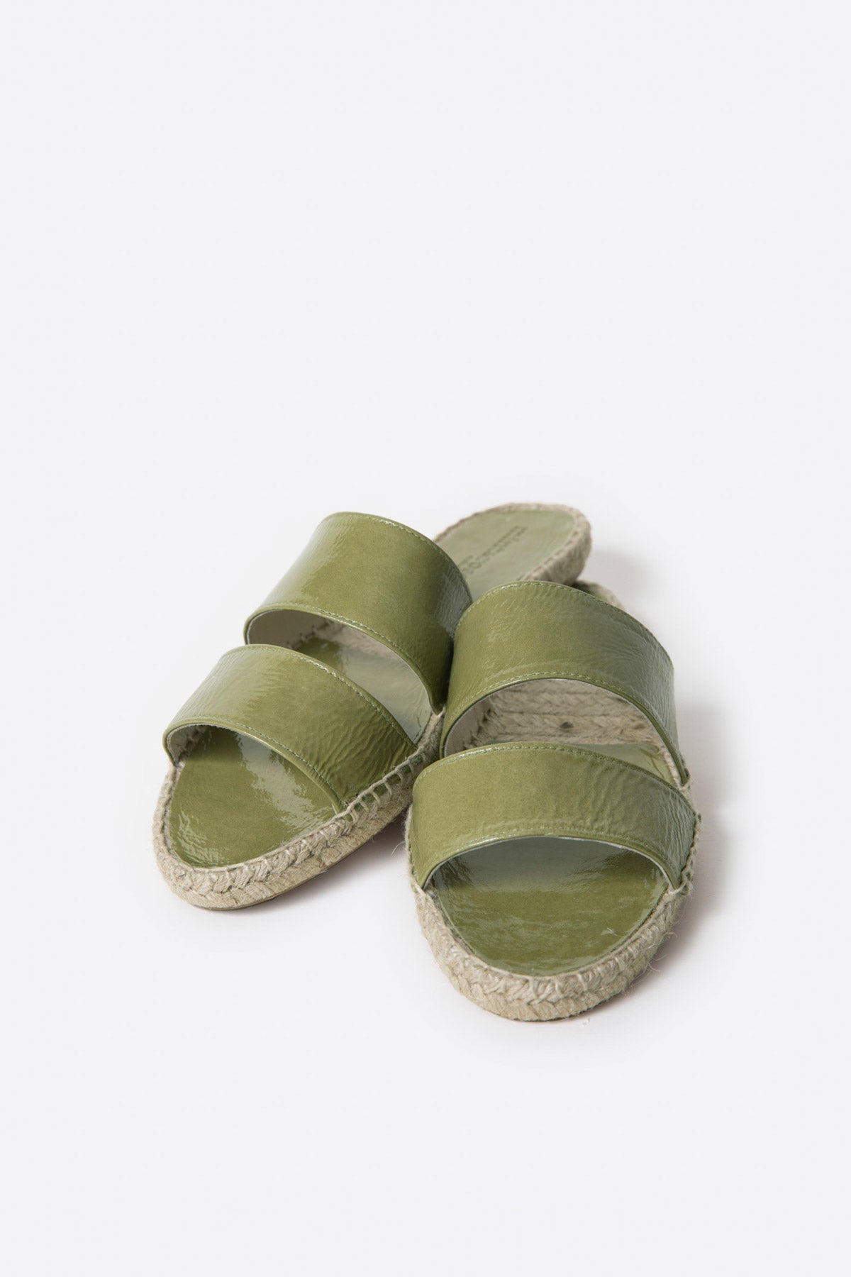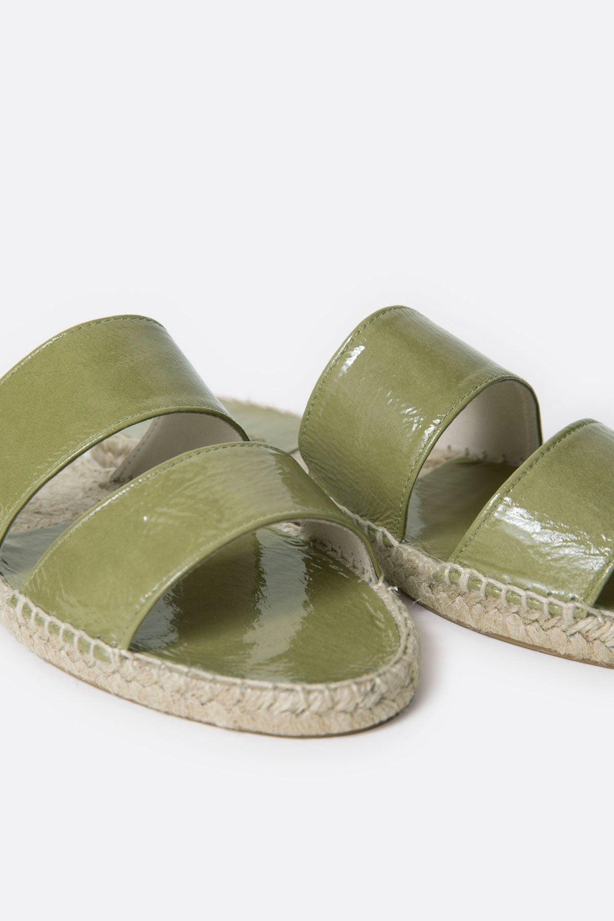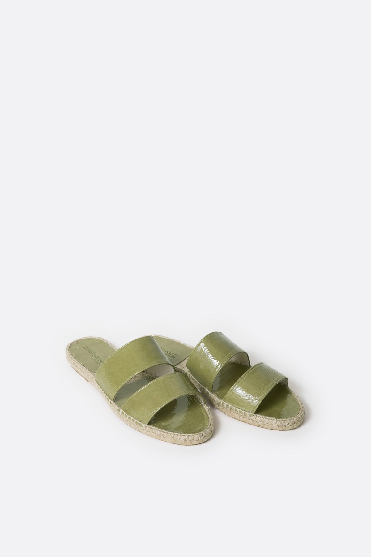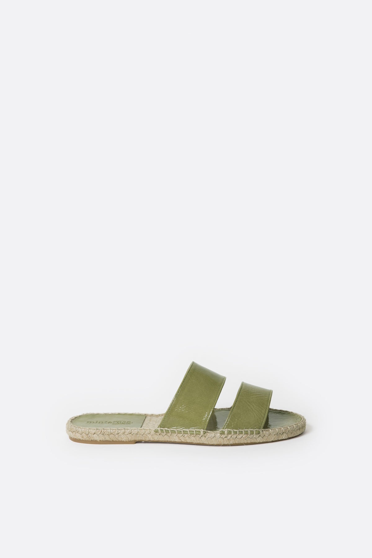 Sus dos tiras forradas abrazan el pie, y son completamente destalonadas. Suela de yute trenzado y goma de 1,6 cm de alto.