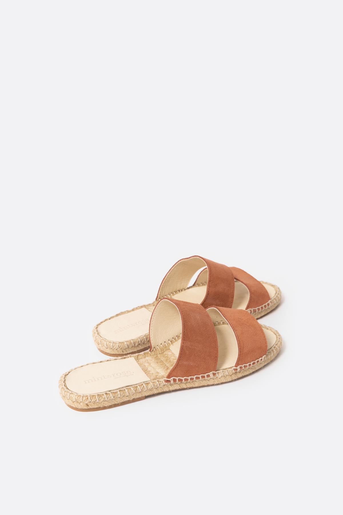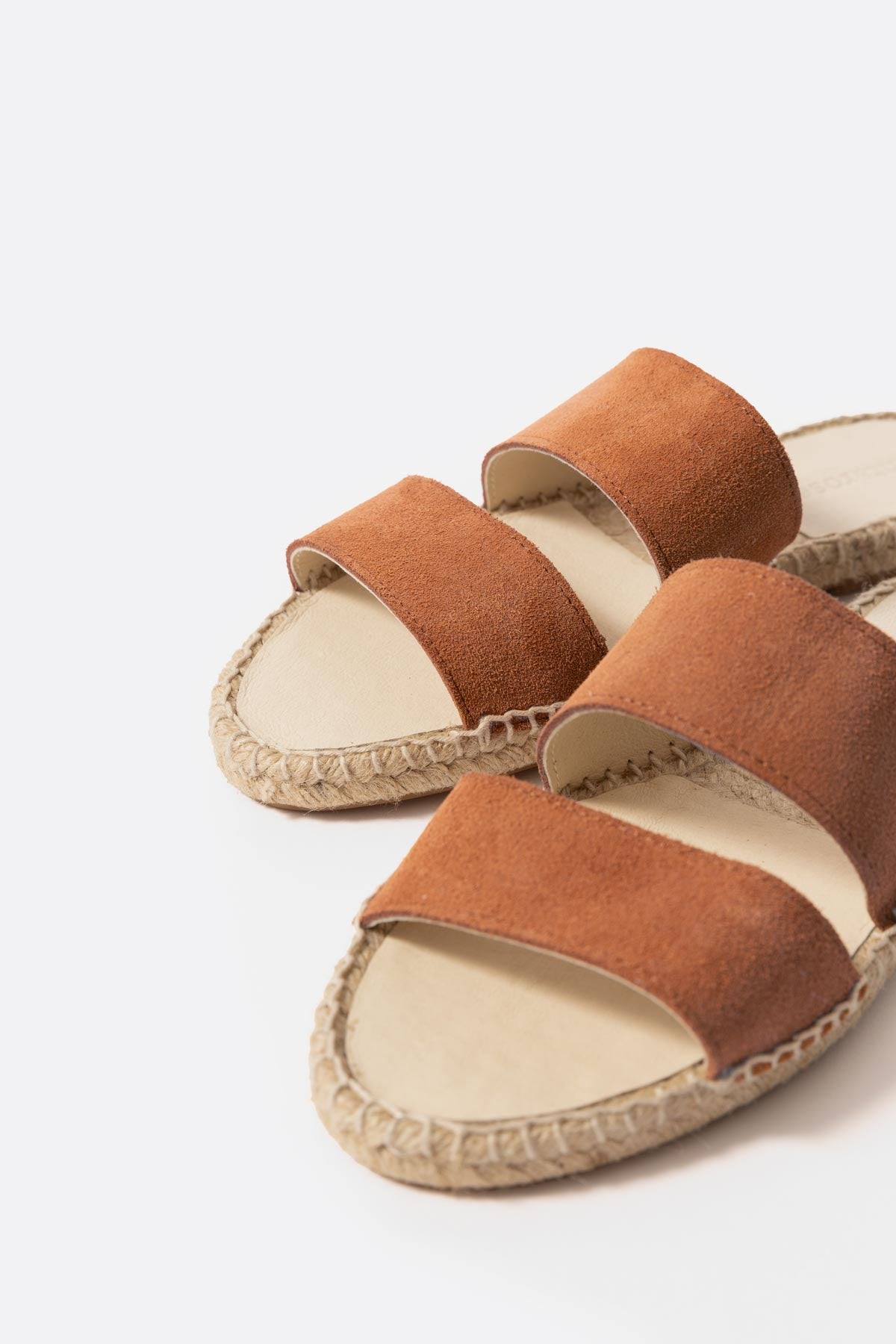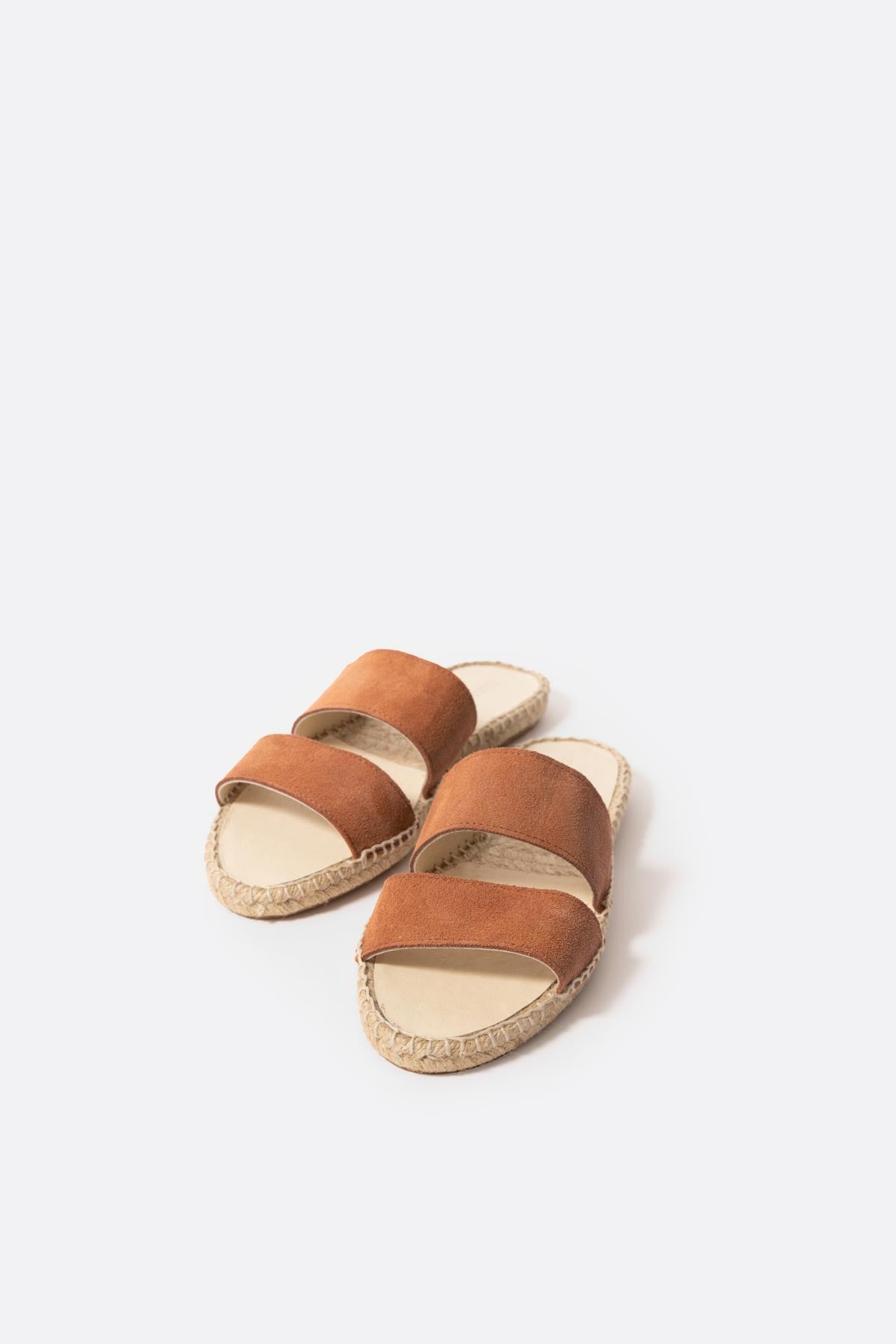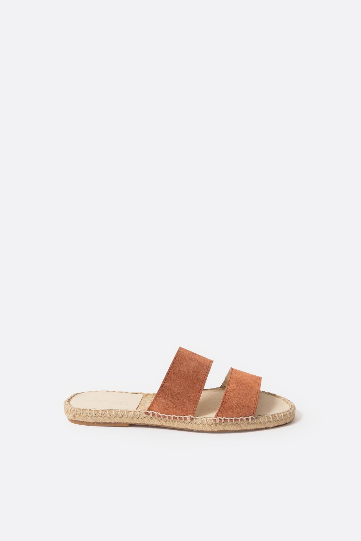 Sus dos tiras forradas abrazan el pie, y son completamente destalonadas. Suela de yute trenzado y goma de 1,6 cm de alto.