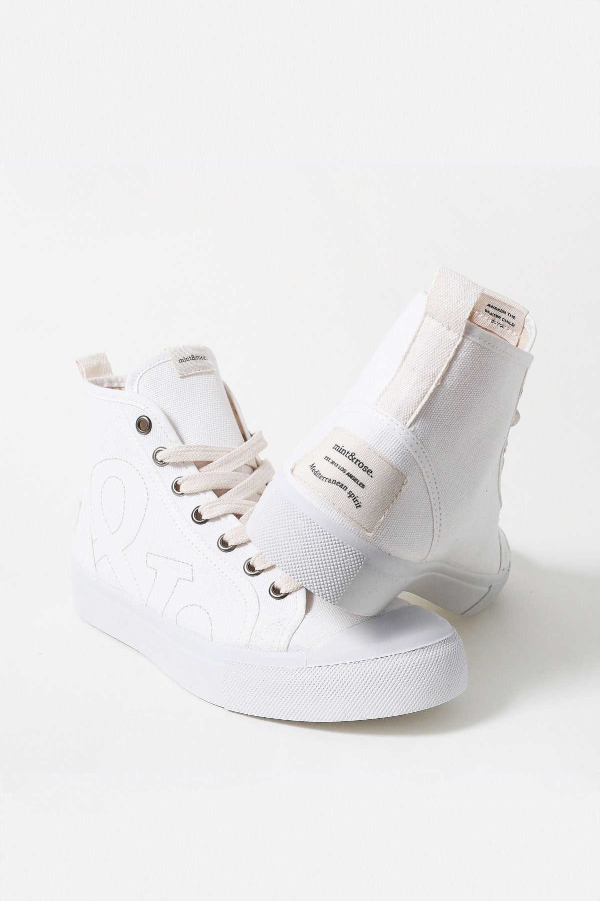 Estas sneakers de caña alta, con un diseño minimal pero sofisticado, están hechas con un tejido textil extra cómodo para acompañarte con cualquier look y momento. Bordadas en lateral con el anagrama mint and rose, label cosido en el talón y puntera de goma a prueba de todo. Altura de 3 cm.